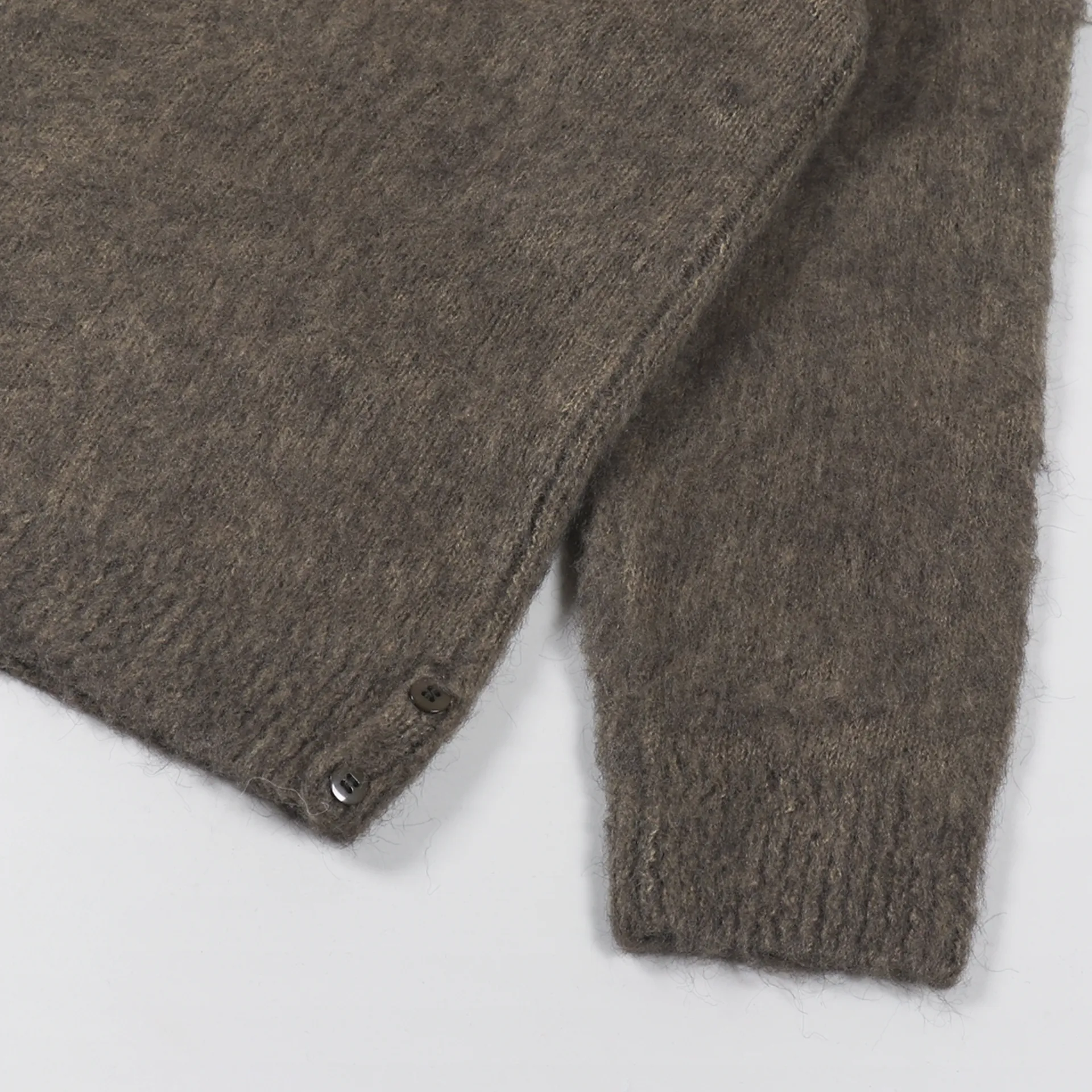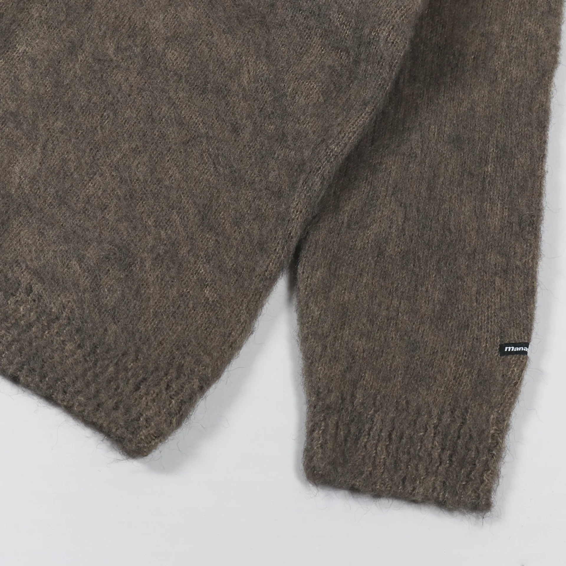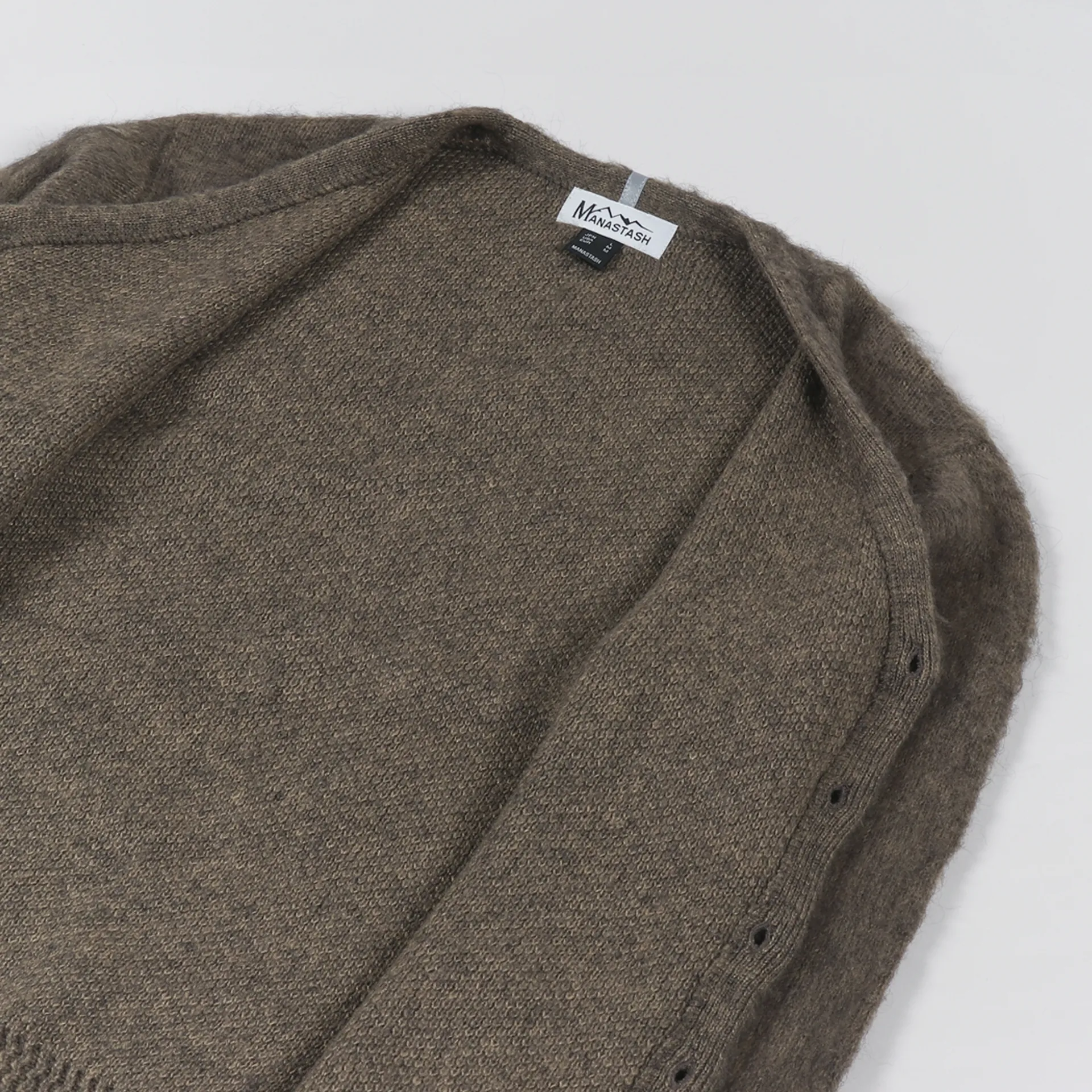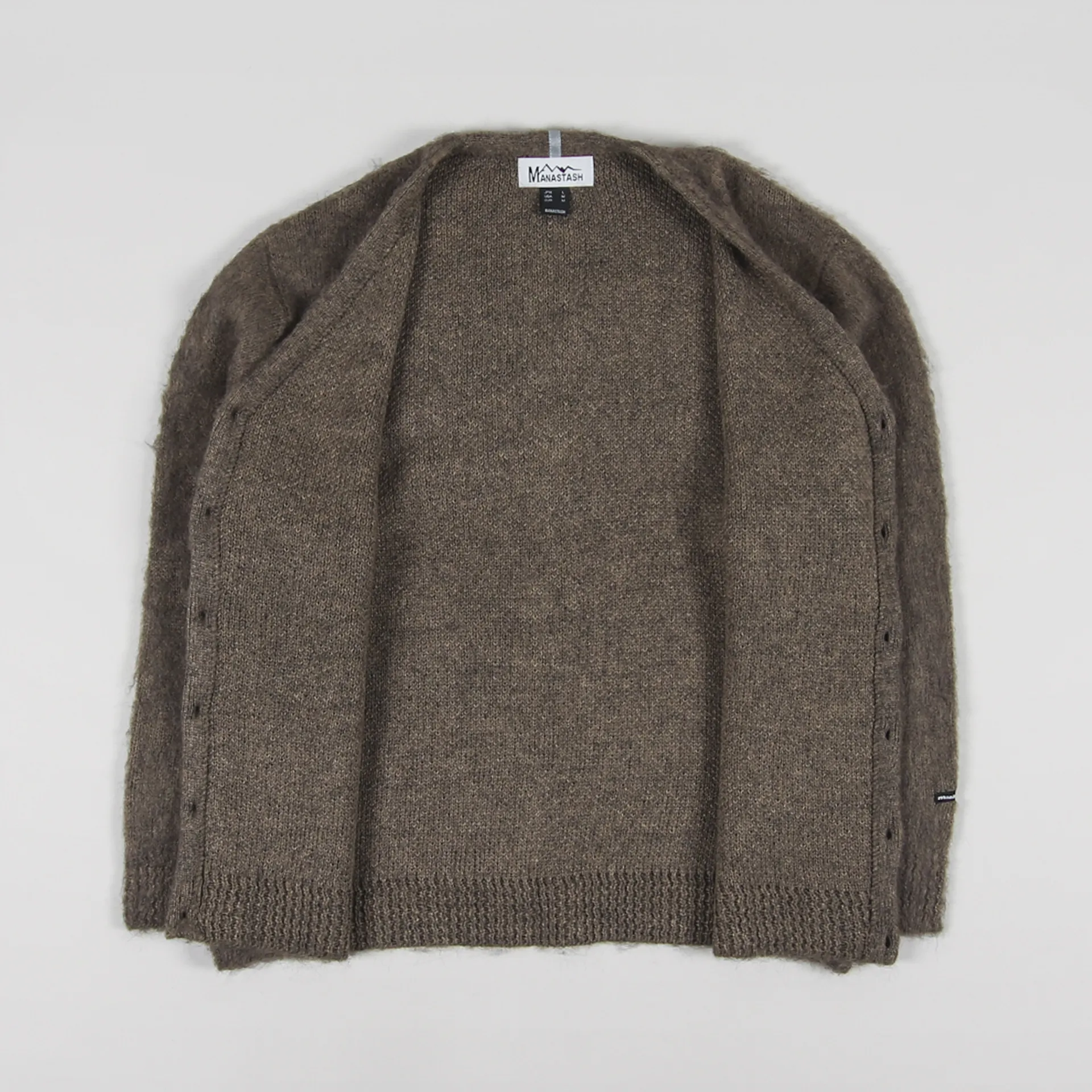 A cardigan from American-Japanese outerwear label Manastash, made from a super soft, warm and comfortable blend of 70% acrylic, 12% wool and 18% nylon with a woven inner and a brushed outer.