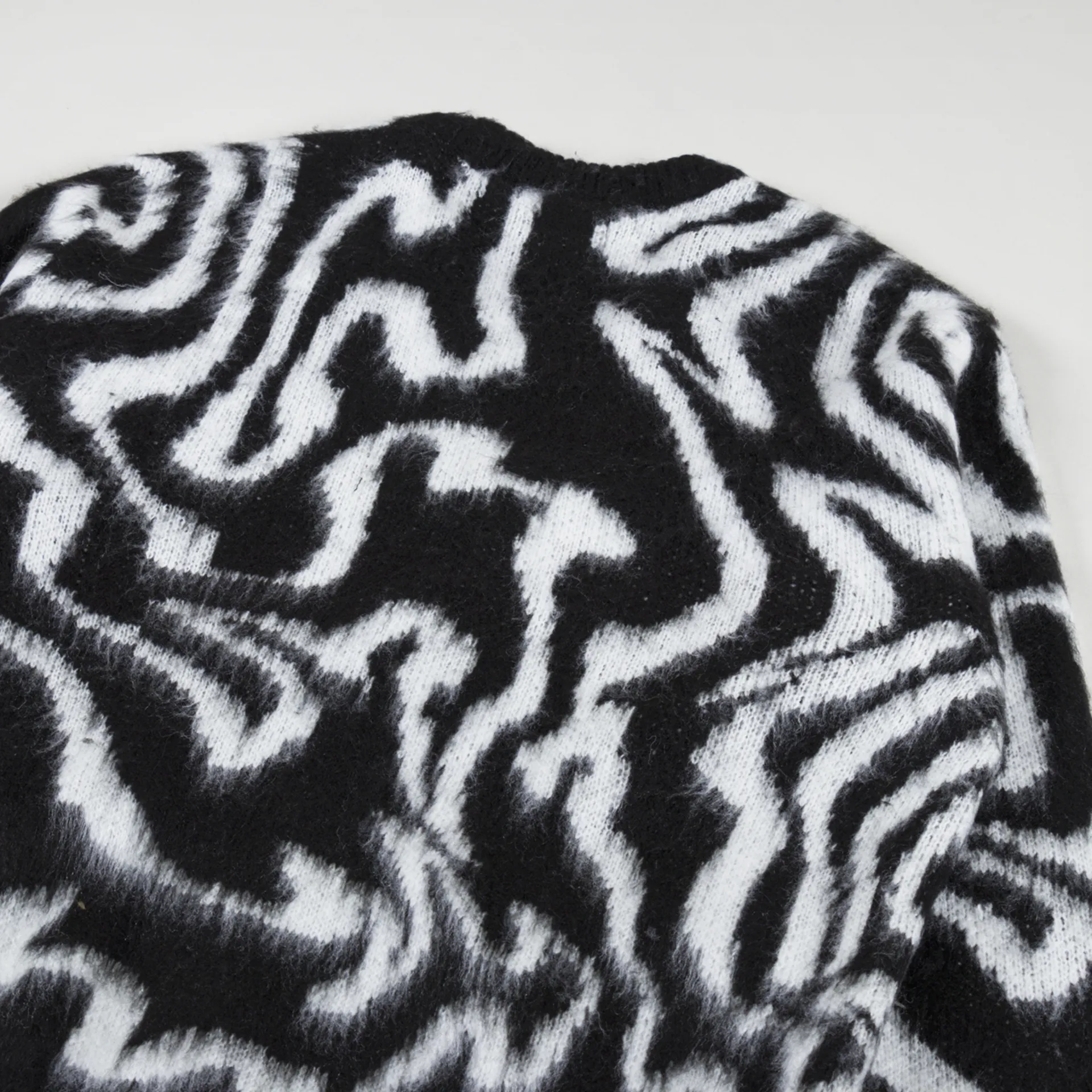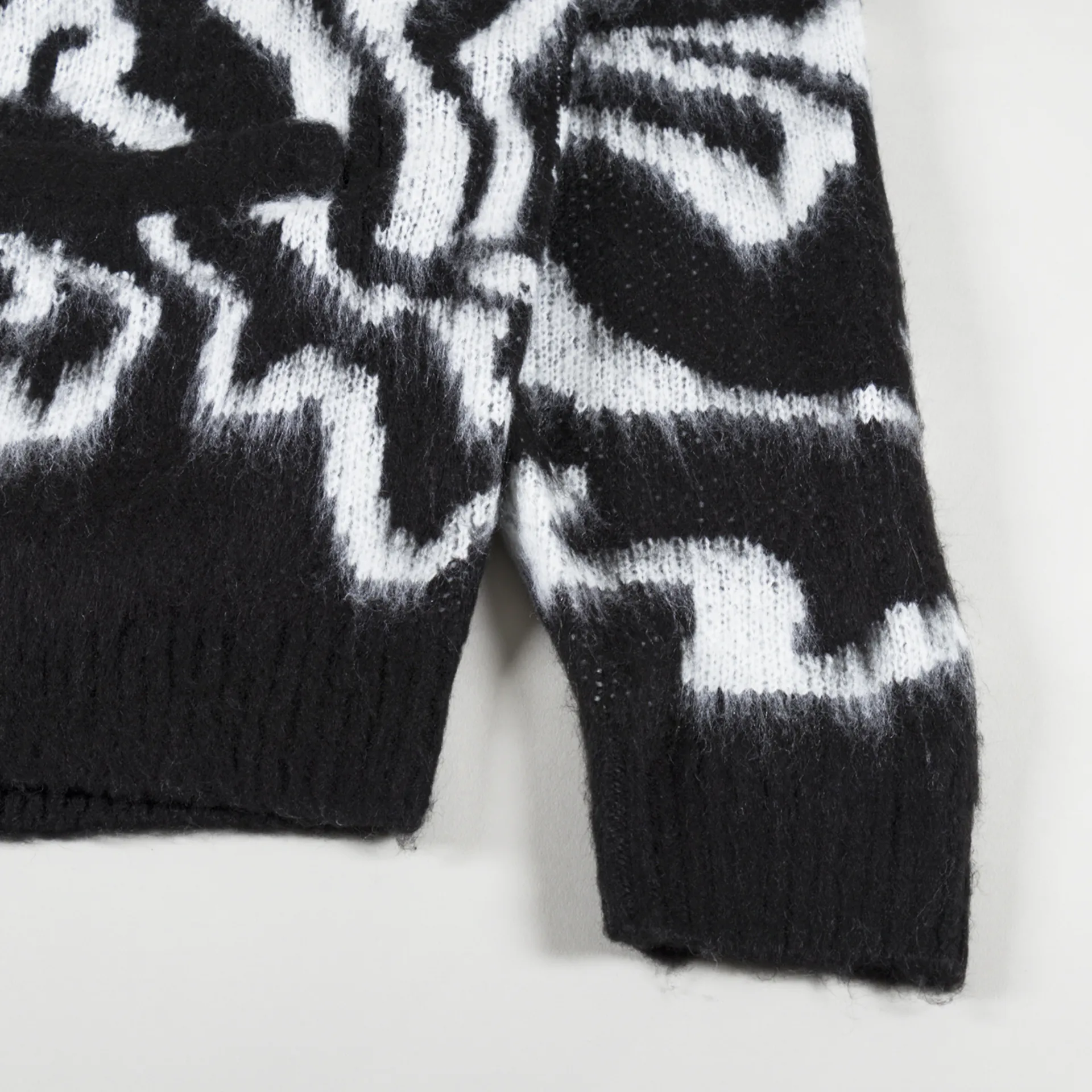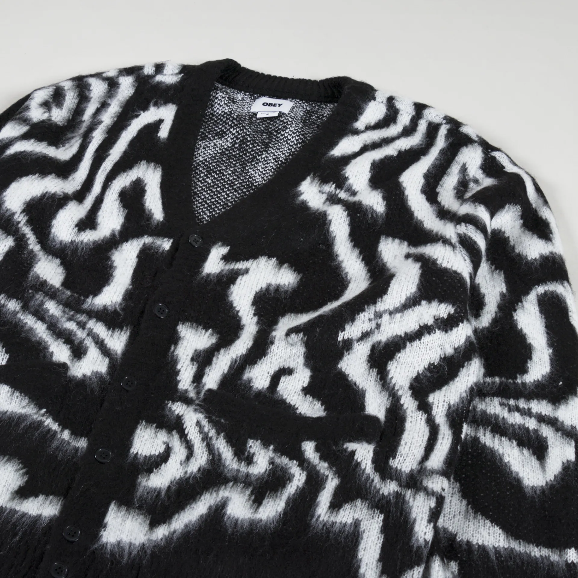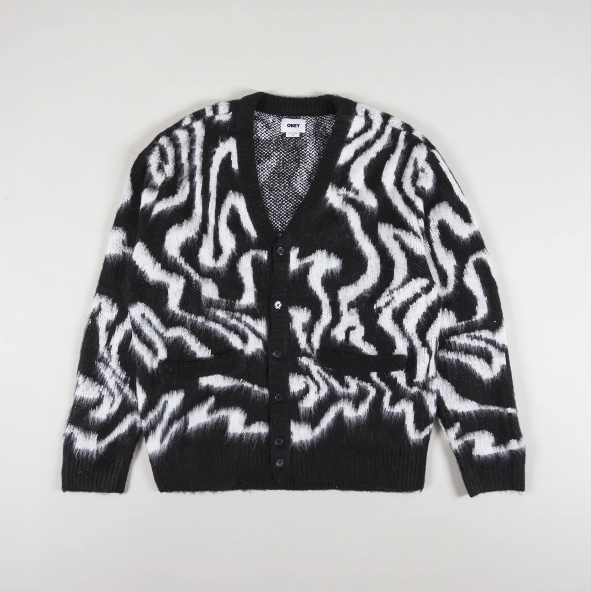 A cardigan from Shepard Fairey's Obey Clothing, made from 100% acrylic which has been knitted and brushed, with a ribbed hem, cuffs and buttoned placket, alongside two patch pockets.