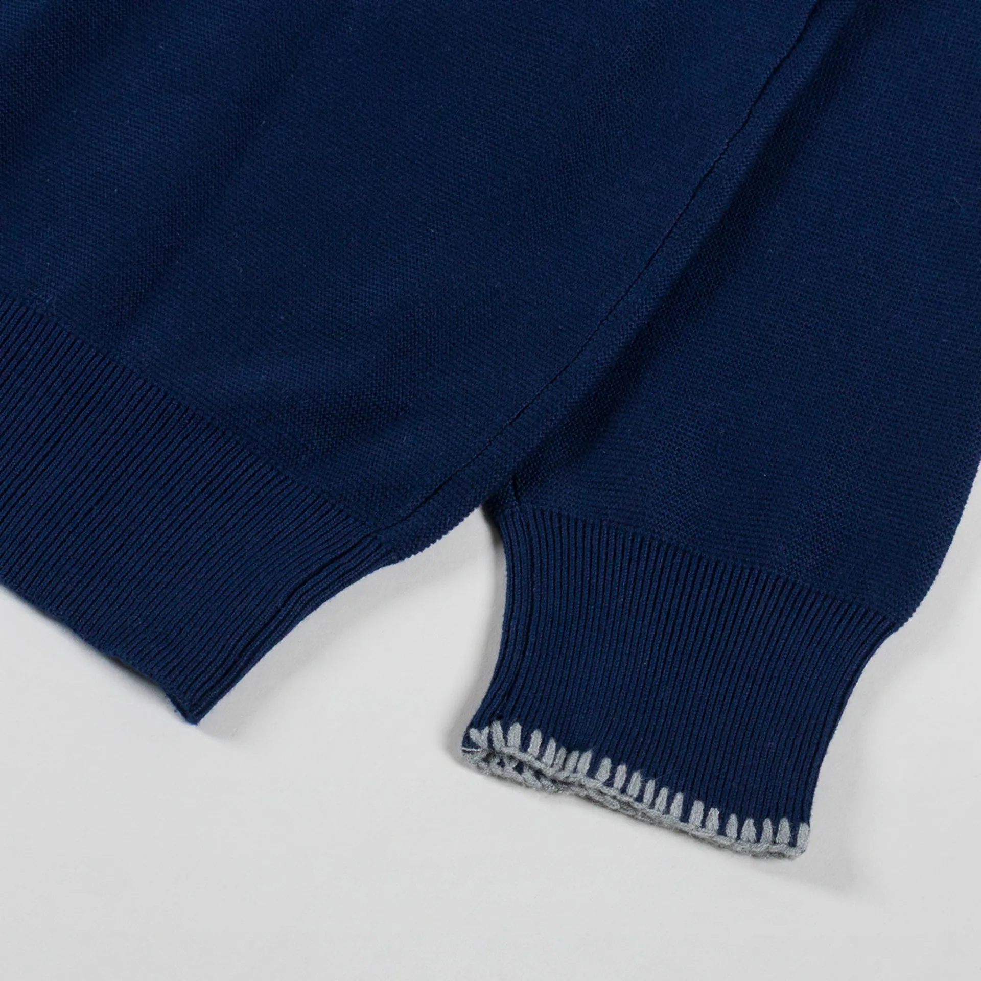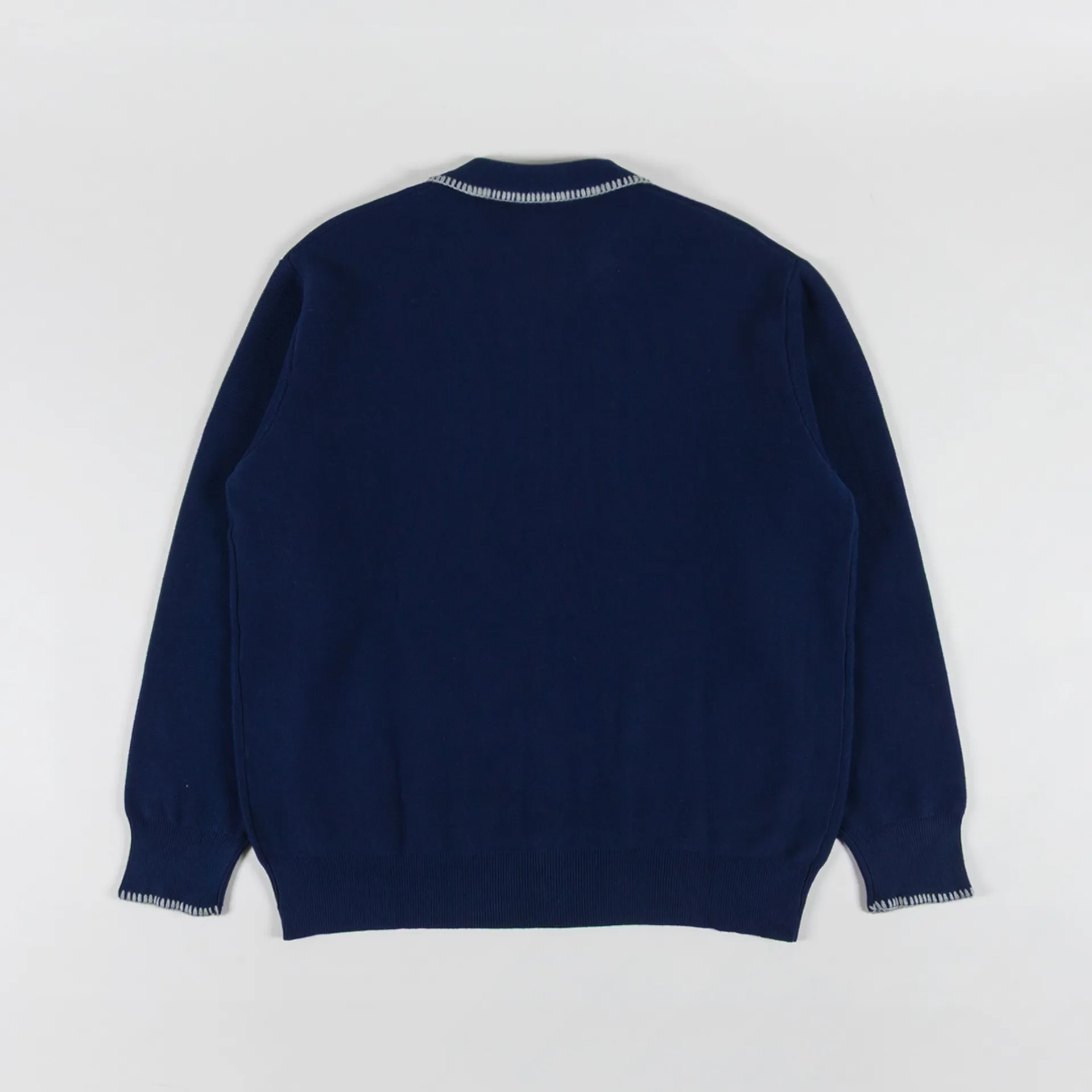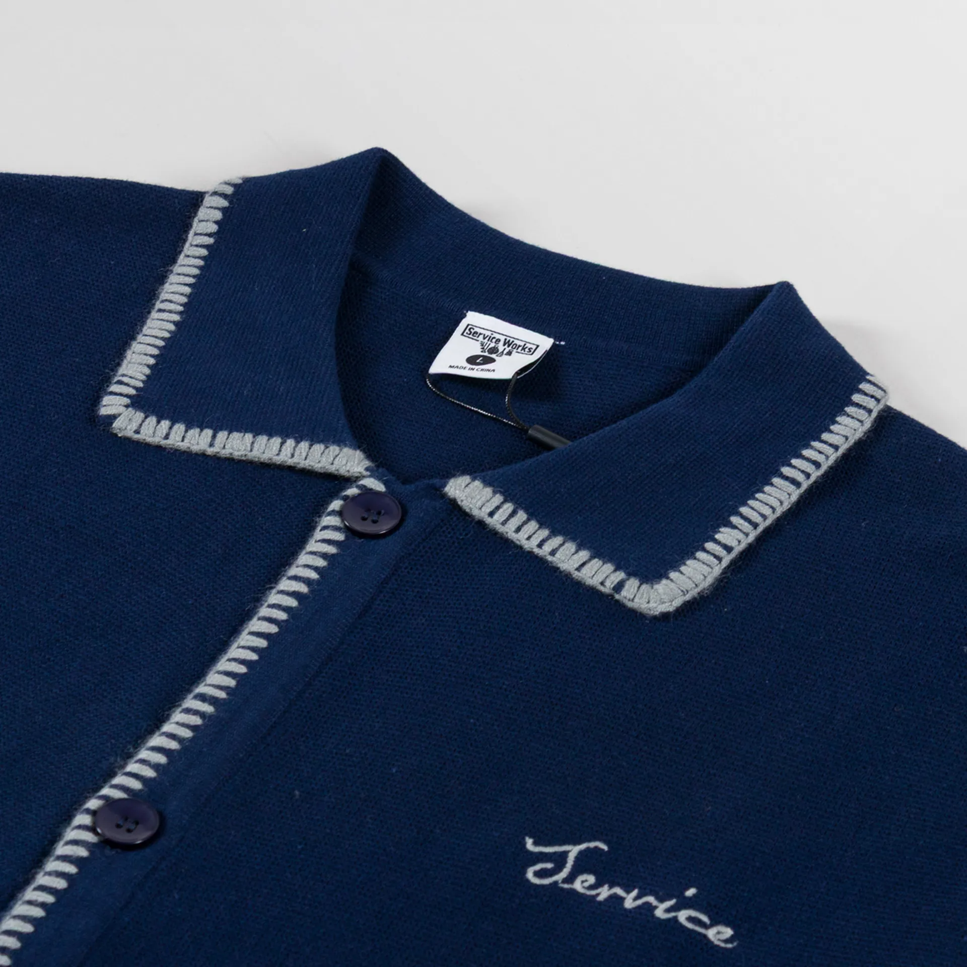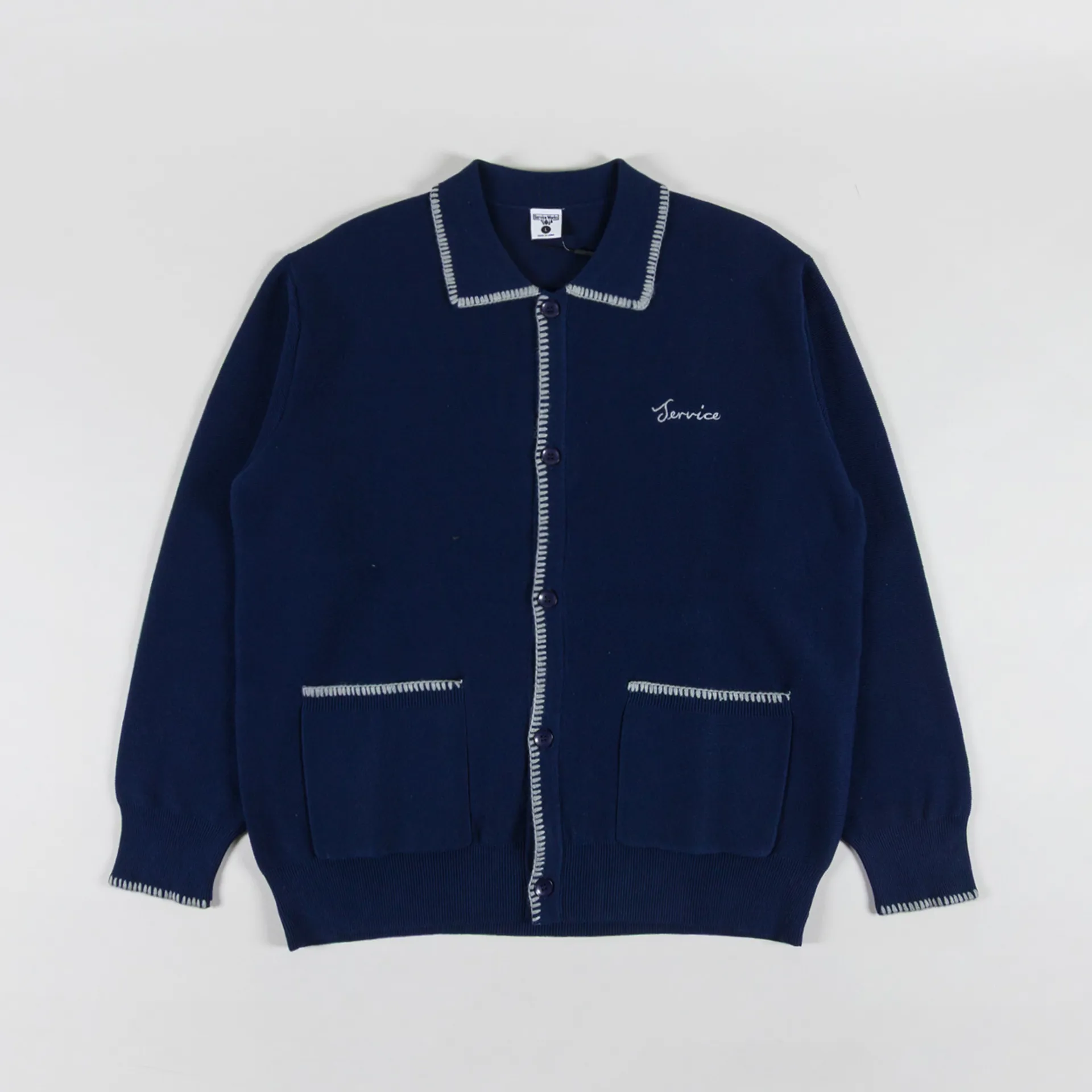 A knitted cardigan from Service Works, cut in a regular fit for everyday comfort and constructed from 7GG cotton. It features blanket stitch detailing throughout the trims, with a five-button placket and classic collar. It has two patch pockets, a straight hem and is finished with an embroidered Service logo at the chest.