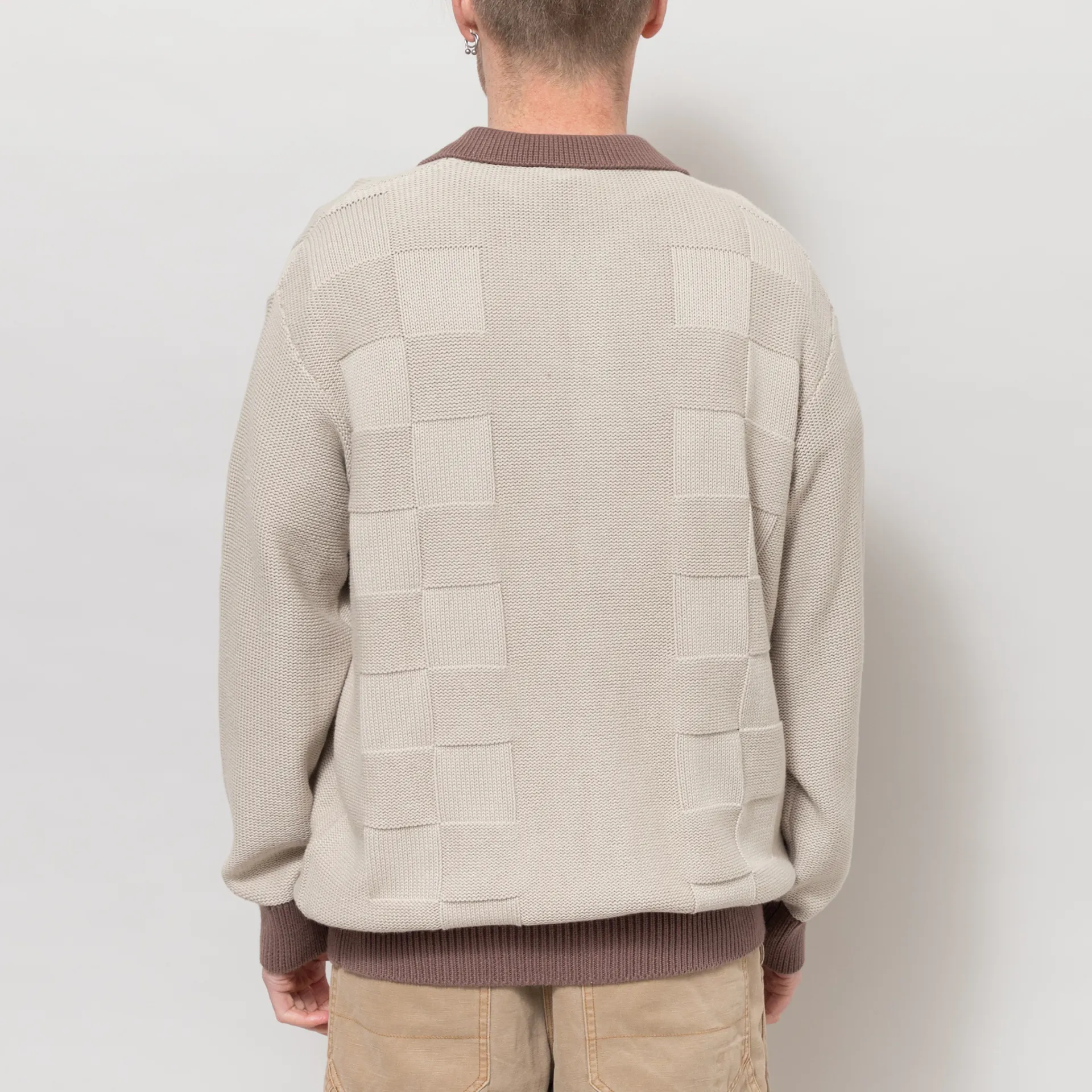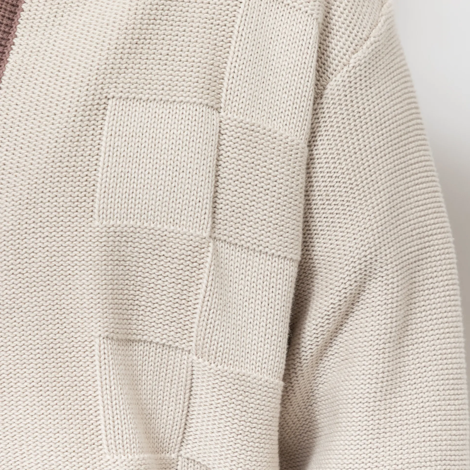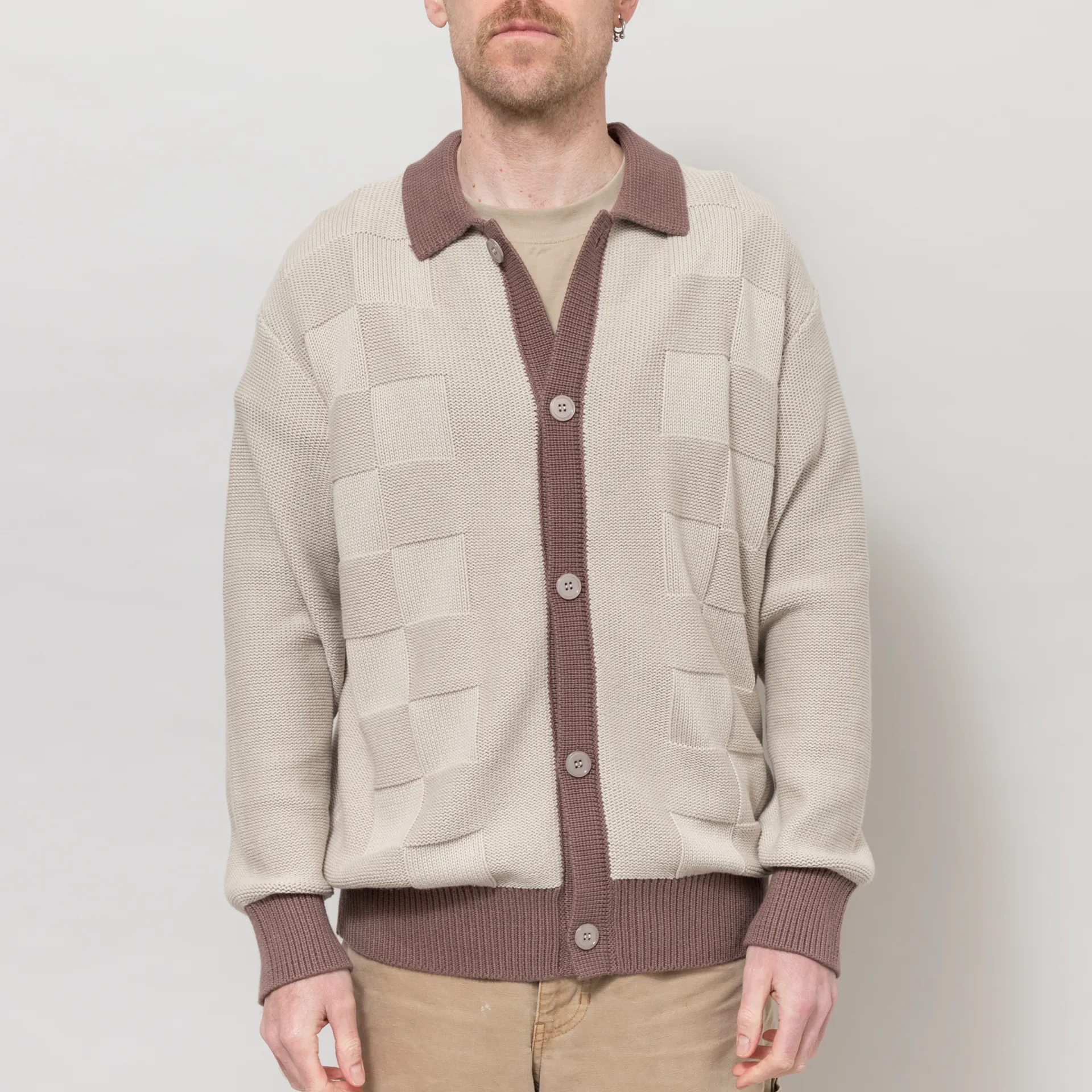 A knitted cardigan from Service Works, cut in a regular fit for everyday comfort and constructed from durable, loose-gauge knitted cotton. It features a full button-through front, leading to a classic collar, with ribbing details at the hem and cuffs. Finished off with a subtle checkered design throughout, and contrasting colours at the trims.
