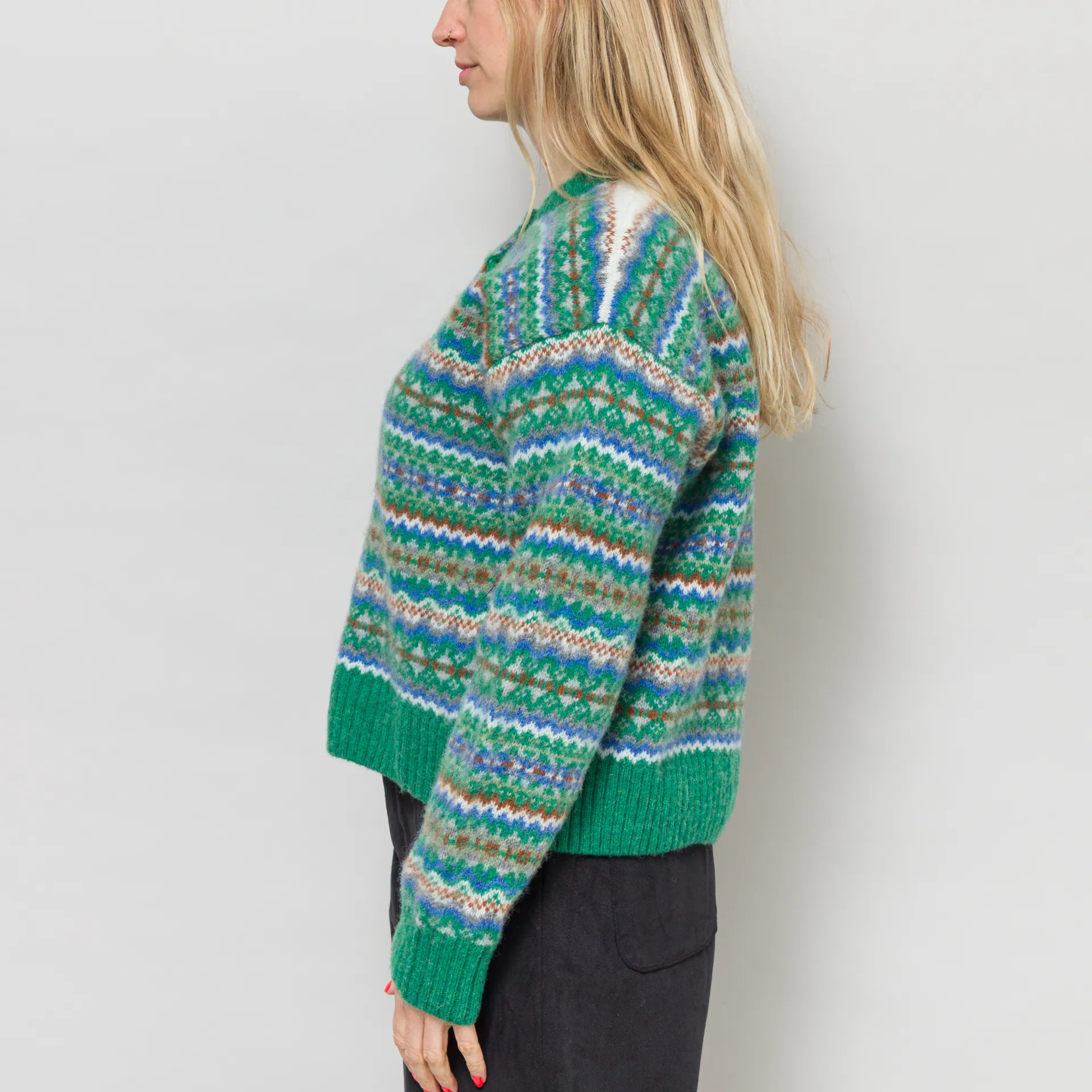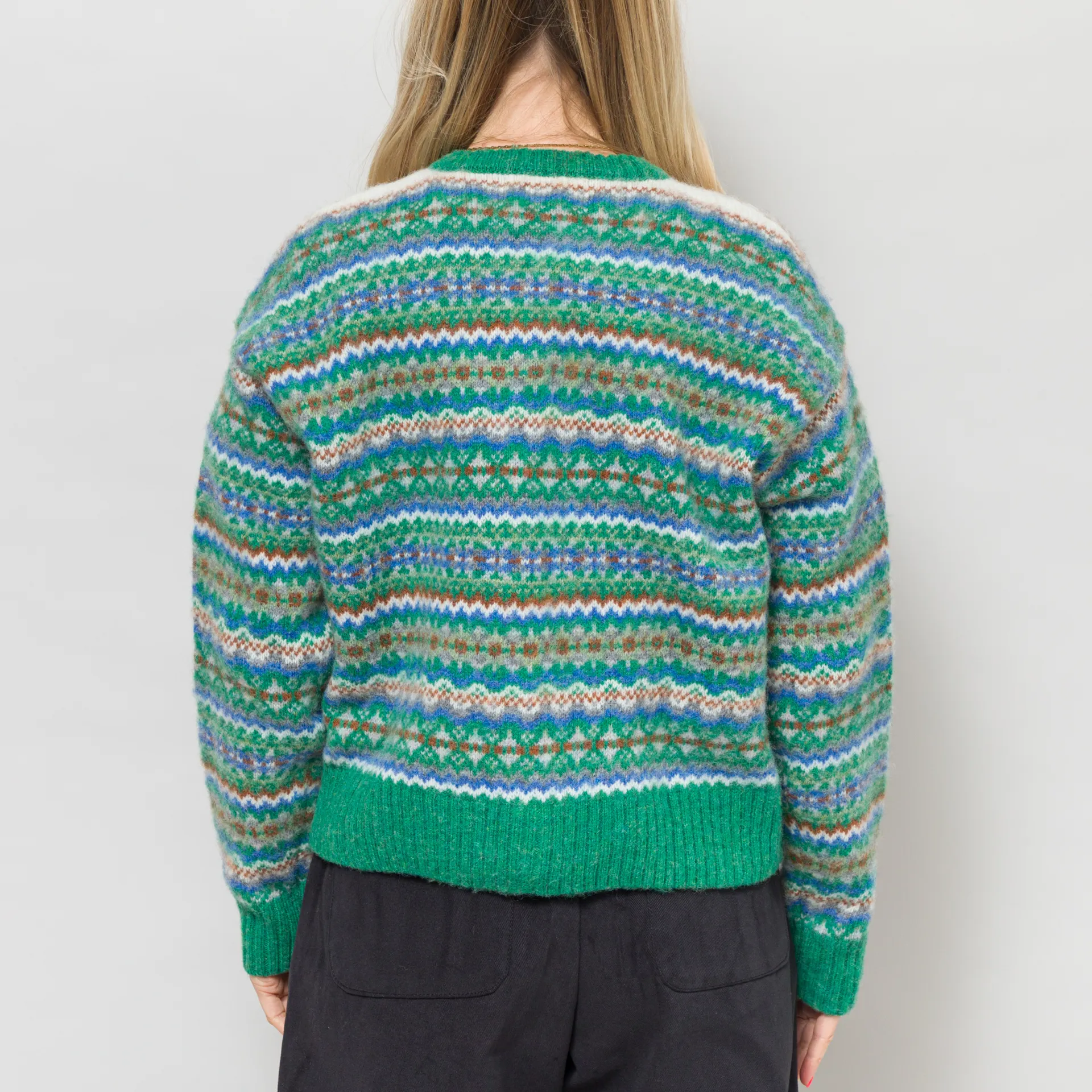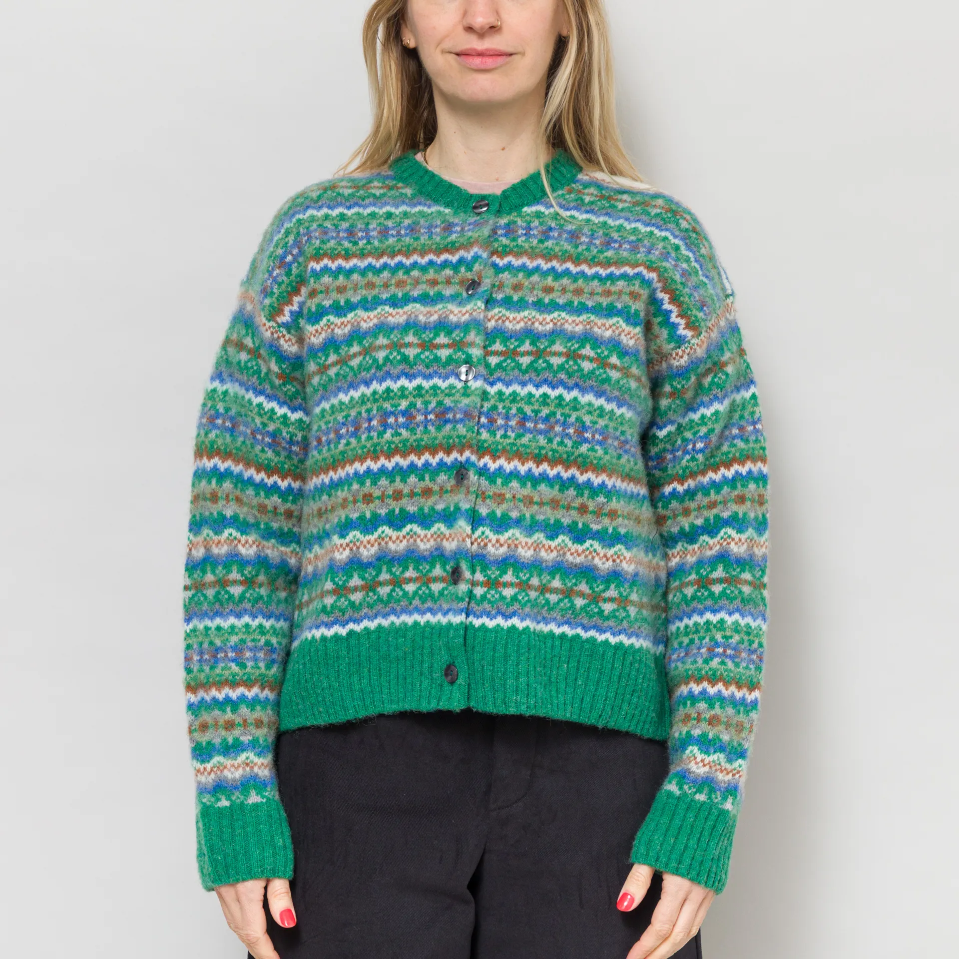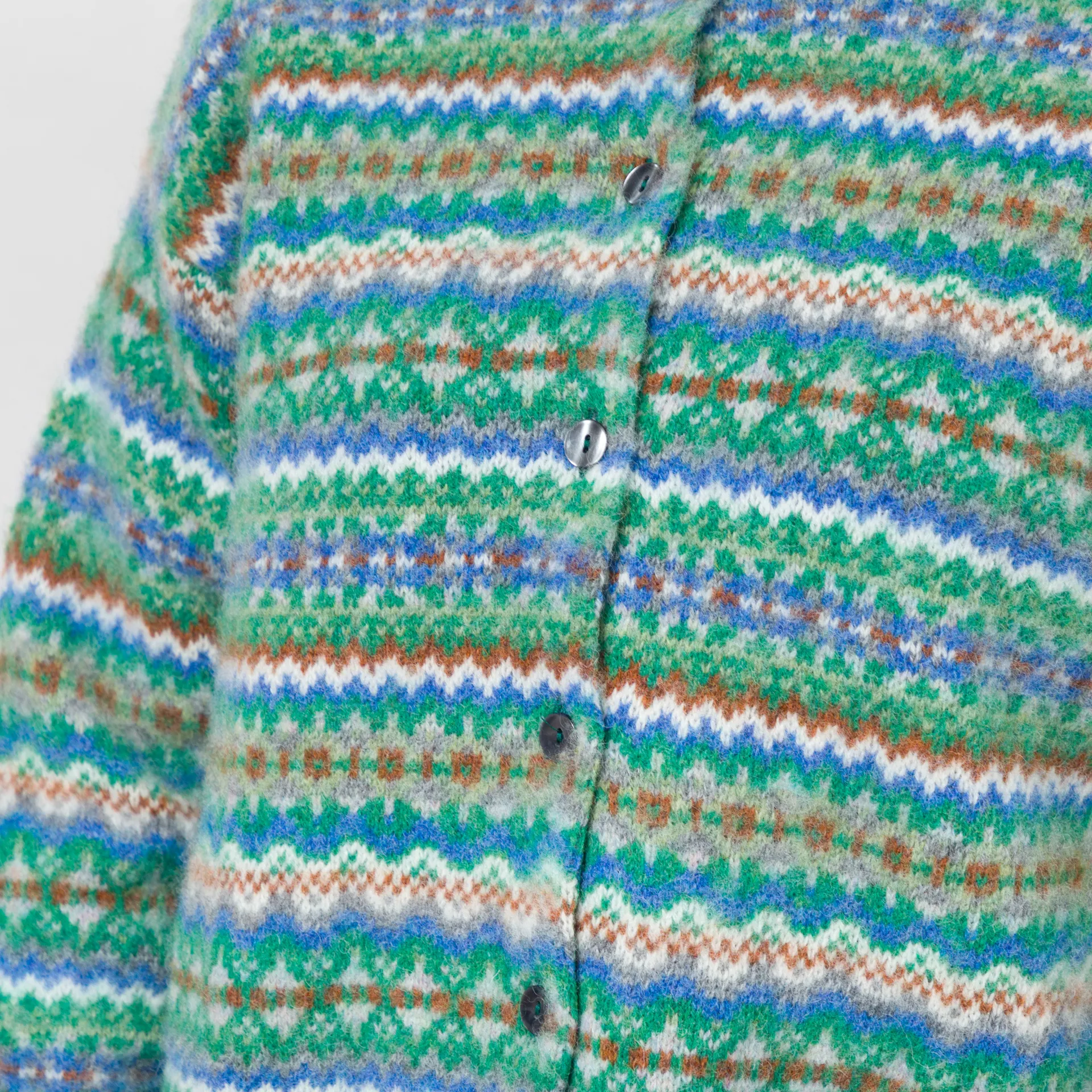 A knitted cardigan from Sideline, constructed from soft wool with an all-over Fair Isle design and a brushed, fuzzy texture.