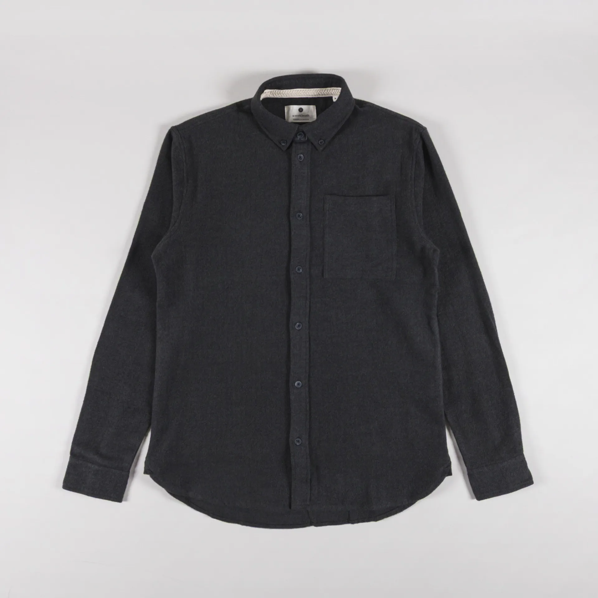 A long-sleeve shirt from Anerkjendt, constructed from soft brushed cotton and cut in a regular fit for everyday comfort. It features a button-through front, leading to a button-down collar, with a curved hem and buttoned cuffs. The design is complete with a back box pleat for added structure and a single patch pocket to the chest.