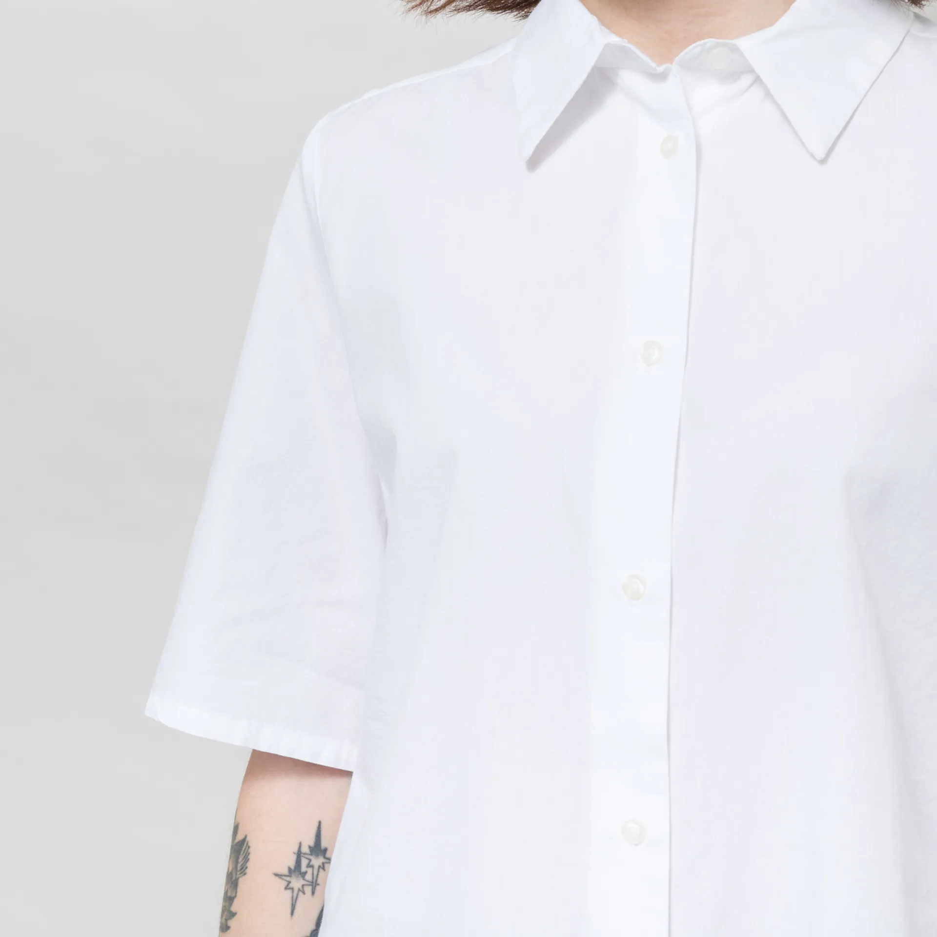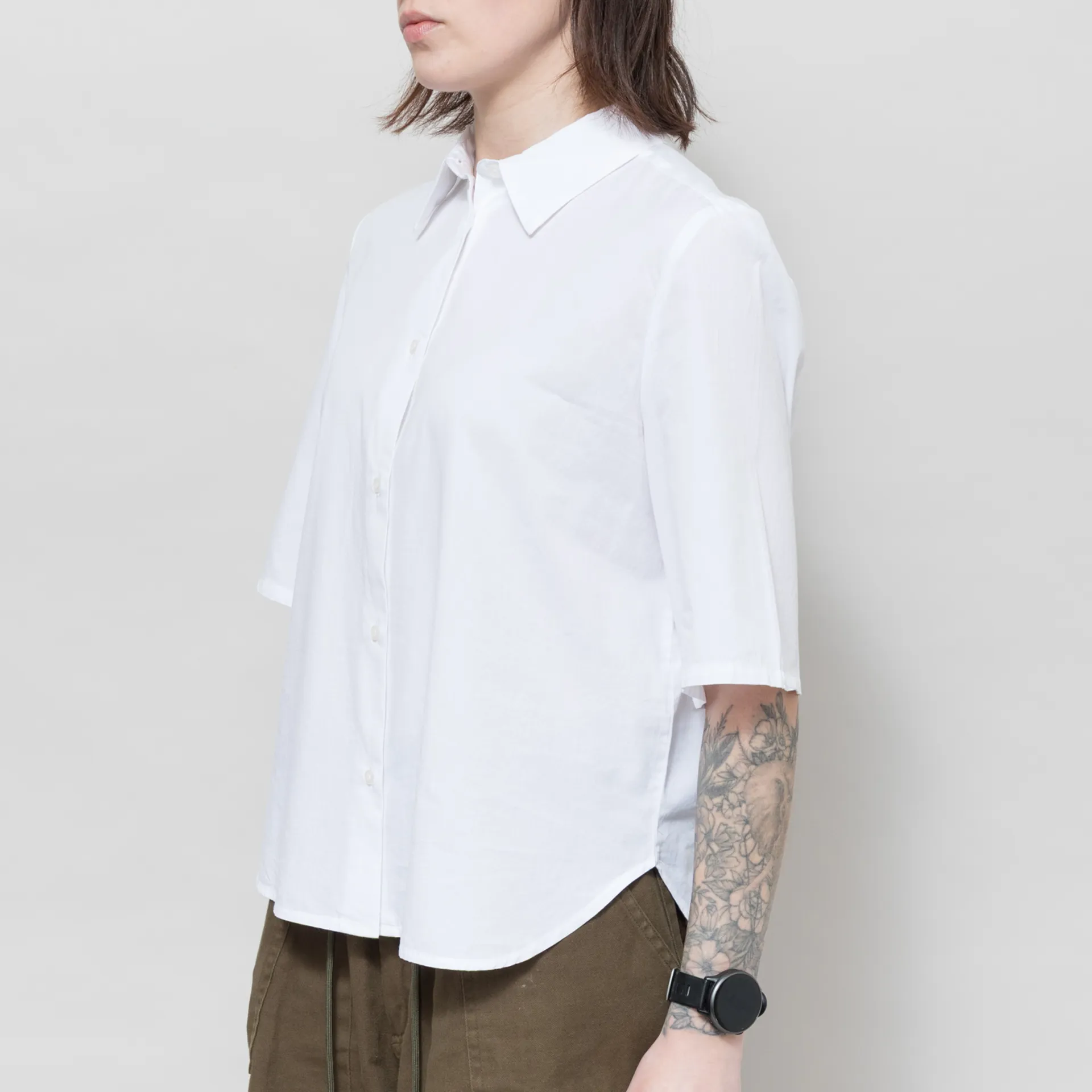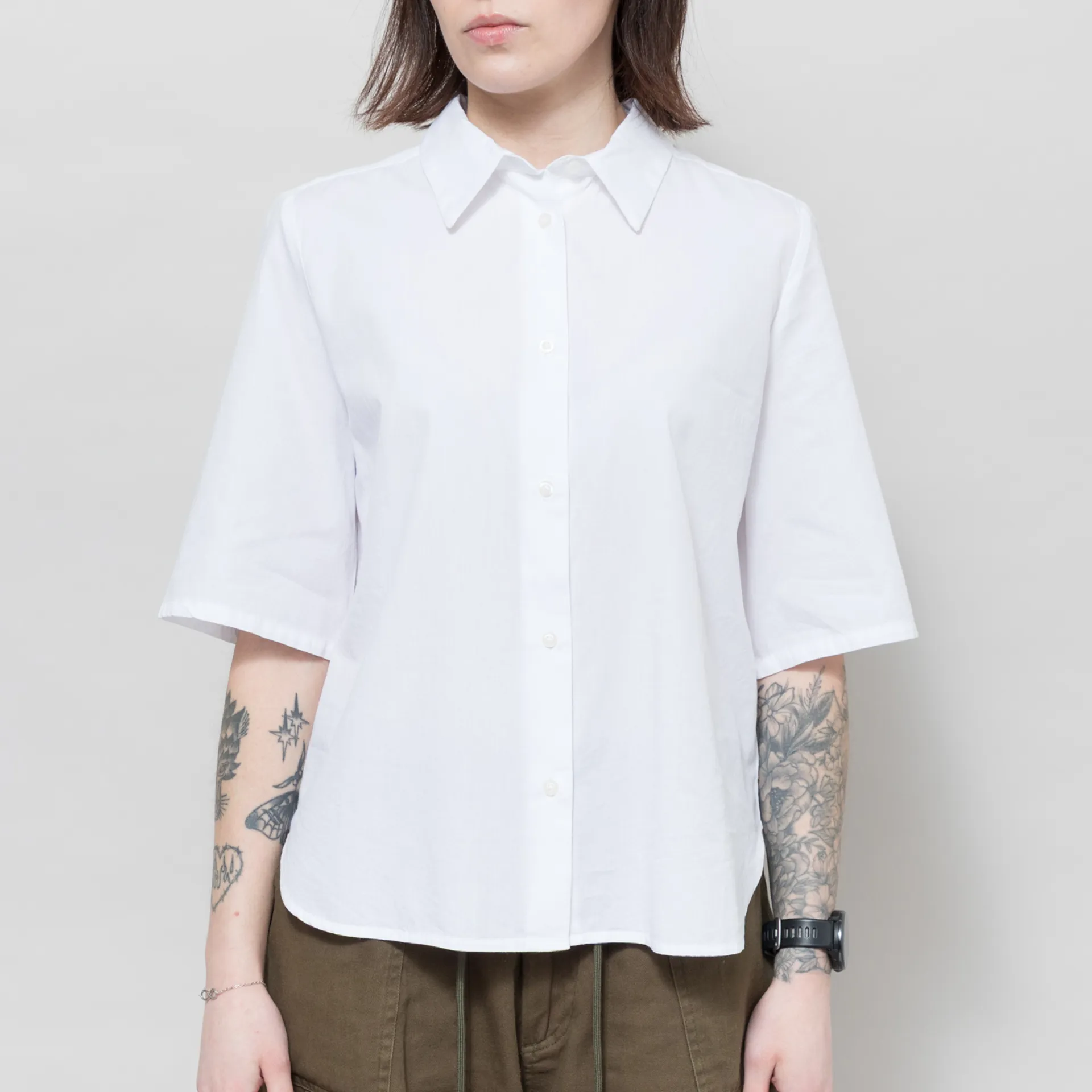 A plain short-sleeve shirt from Basic Apparel, cut in a relaxed fit for everyday comfort and crafted from durable organic cotton. It has a full button-through front, leading to a classic collar with a curved hem and pleat detailing at the back for added structure.