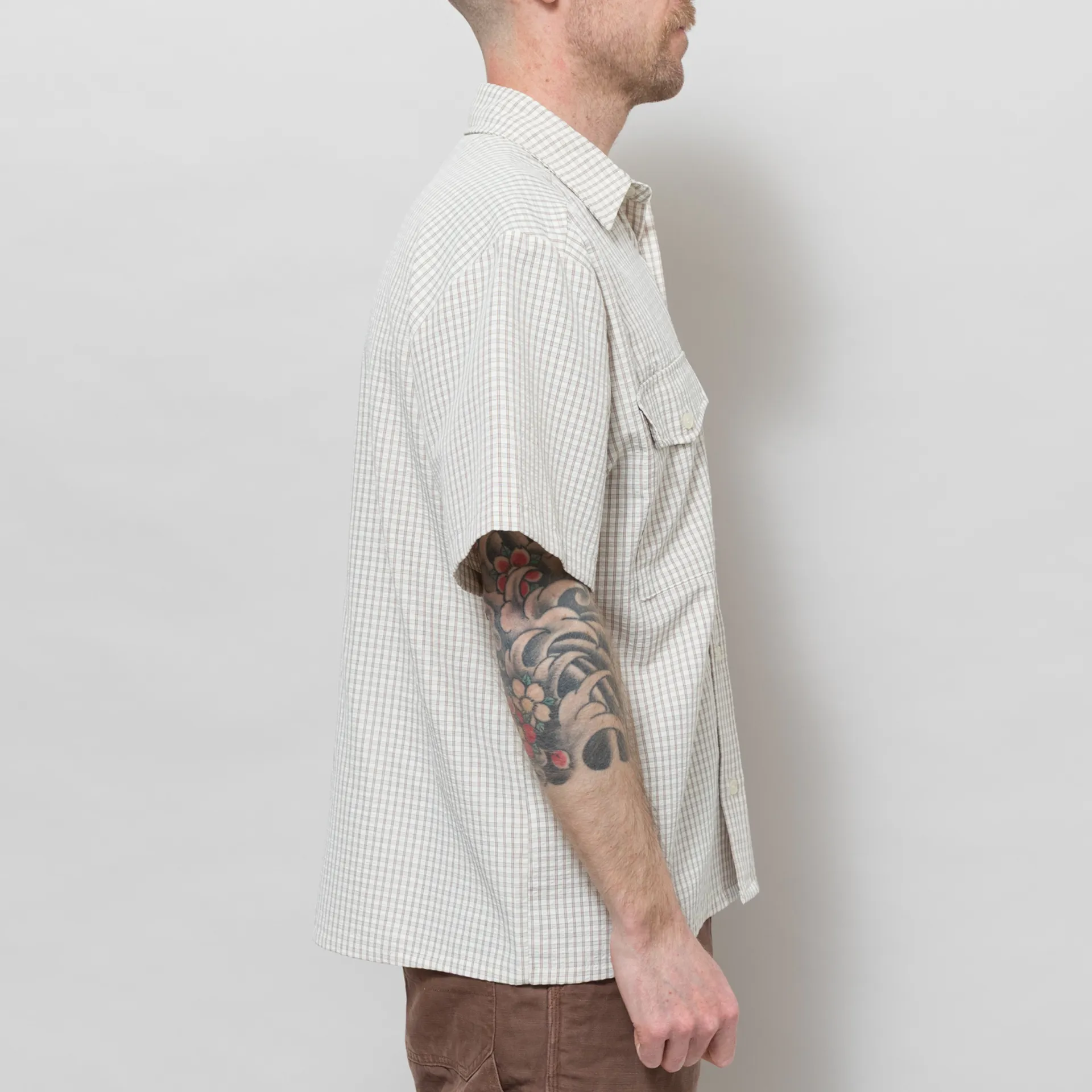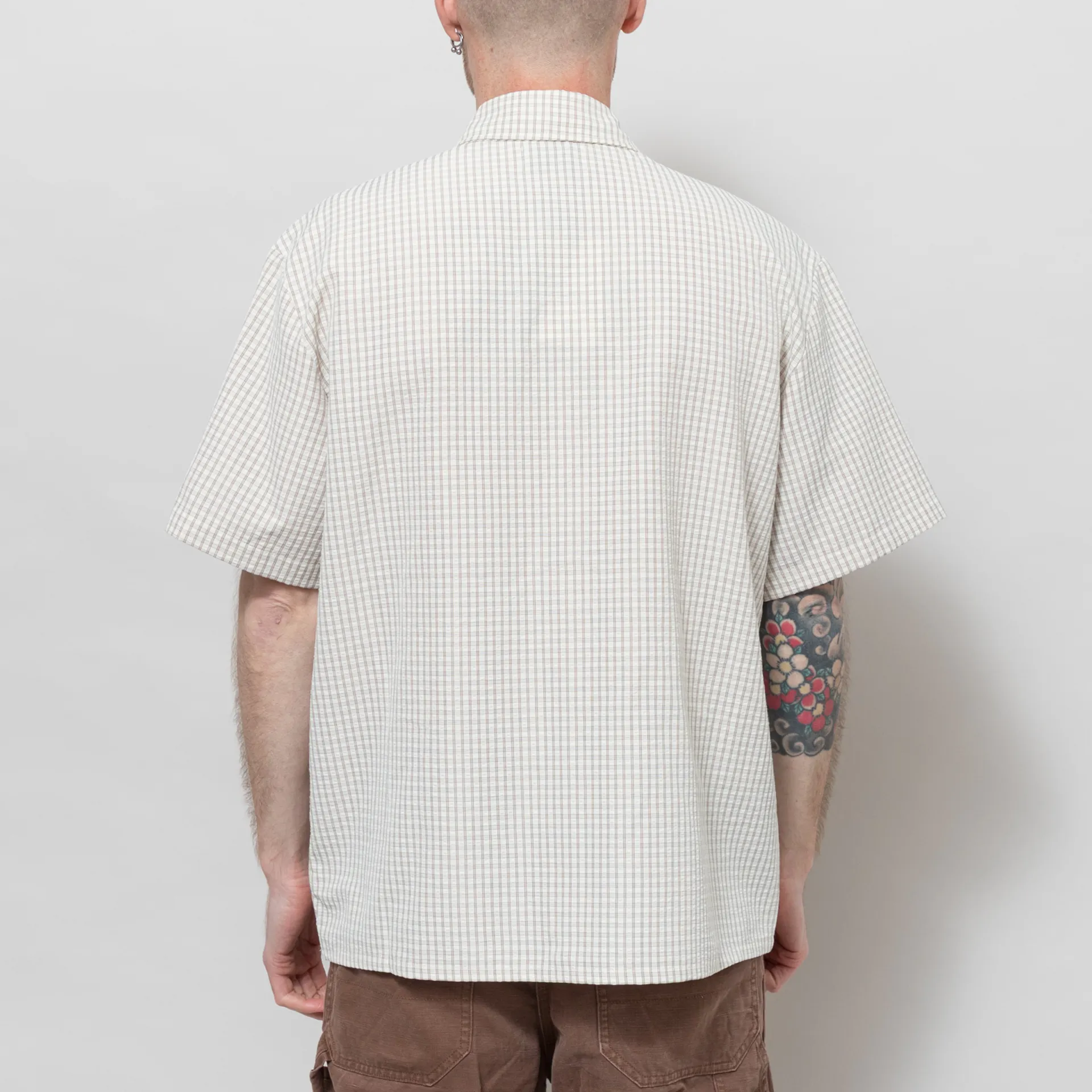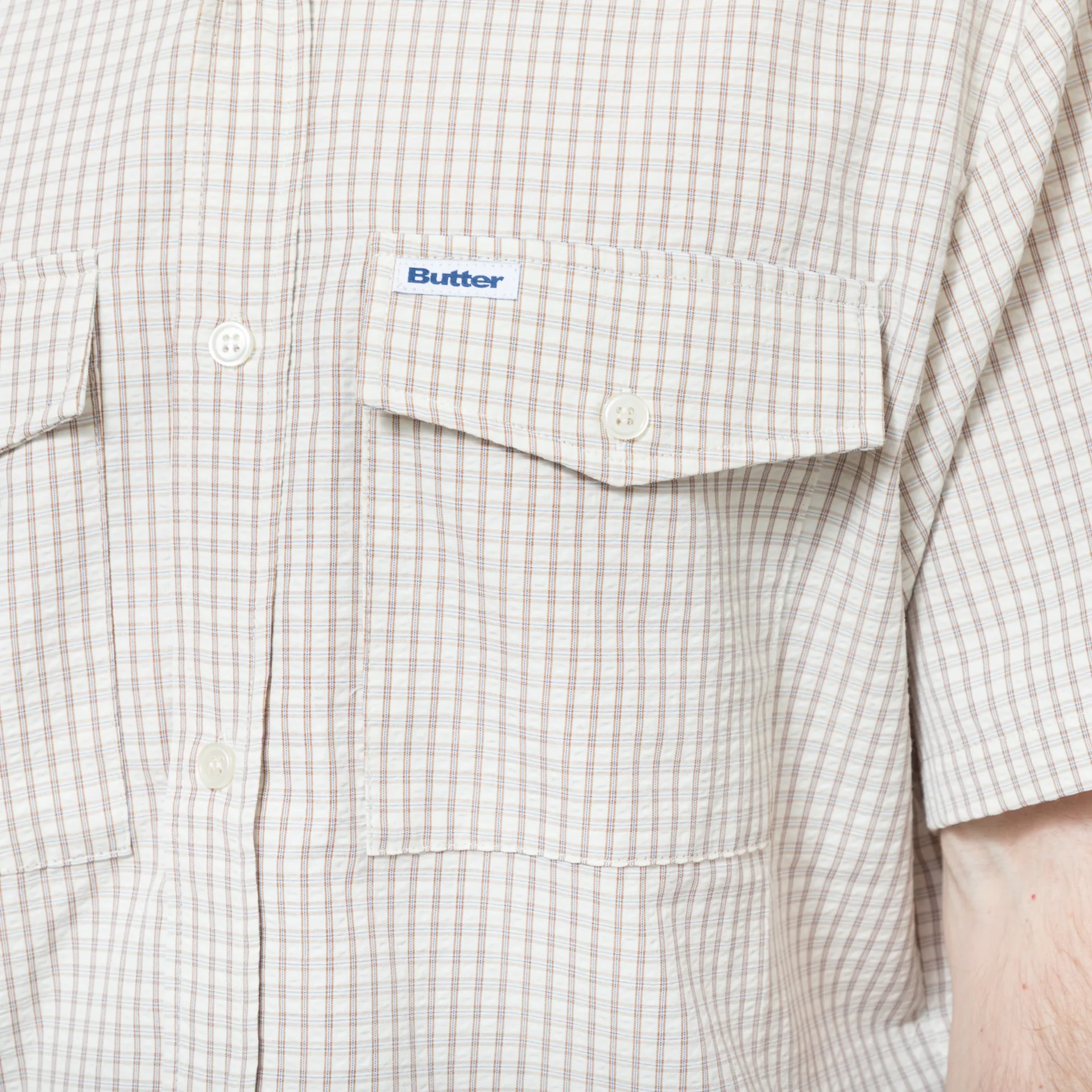 A short-sleeve shirt from Butter, constructed from a patterned cotton/poly blend and cut in a regular, boxy fit for a casual silhouette. Featuring a full button-through front, leading to a classic collar, with a straight hem and two patch pockets at the chest. The design is complete with a woven Butter logo.