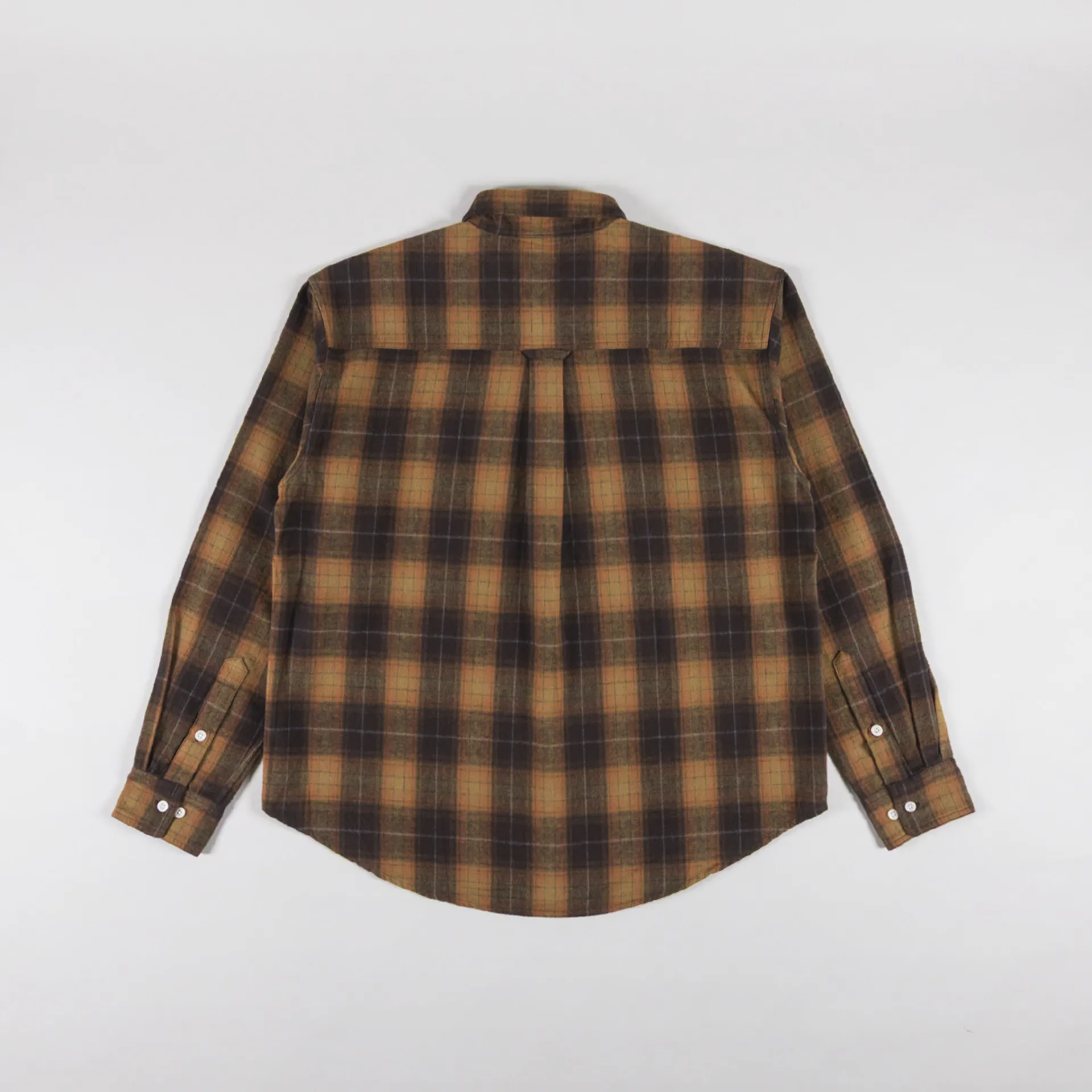 A long sleeve checkered shirt from Cafe Mountain, constructed from soft brushed Japanese cotton. It's cut in a relaxed fit for easy layering, with a button-through front, leading to a classic collar. It has buttoned cuffs, a curved hem, with a self fabric hanging loop at the back, then two buttoned pockets at the chest.