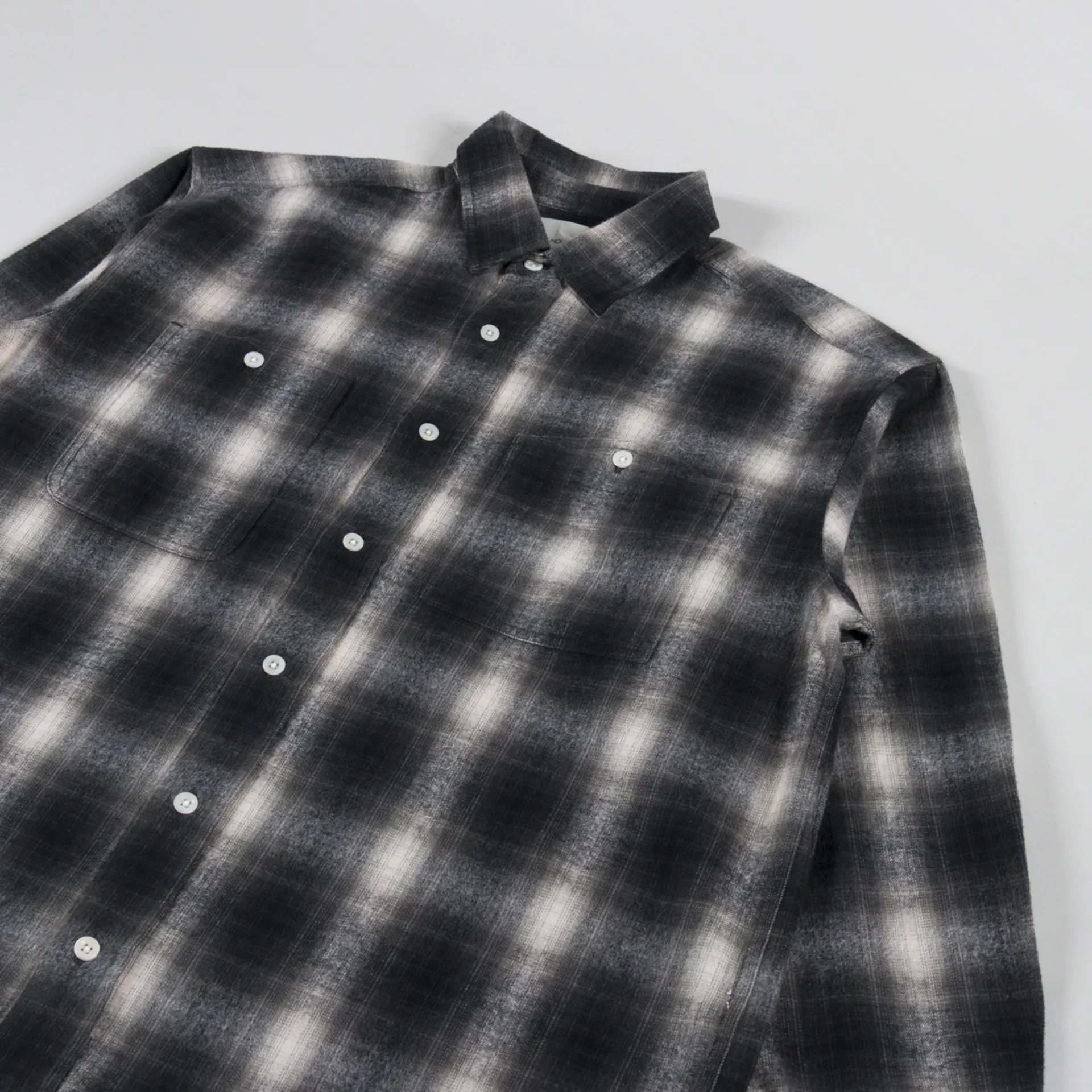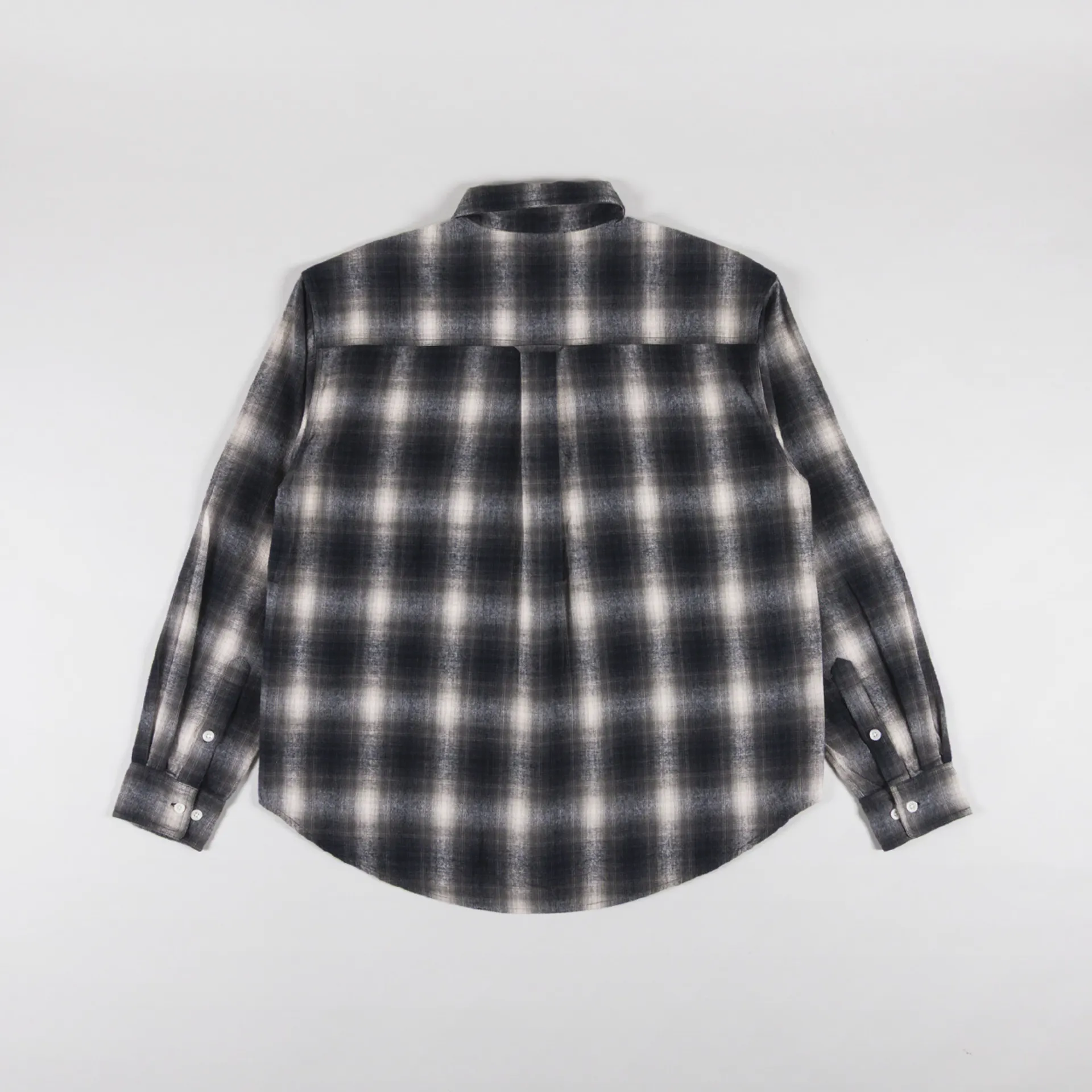 A long sleeve checkered shirt from Cafe Mountain, constructed from soft brushed Japanese cotton. It's cut in a relaxed fit for easy layering, with a button-through front, leading to a classic collar. It has buttoned cuffs, a curved hem, with a self fabric hanging loop at the back, then two buttoned pockets at the chest.