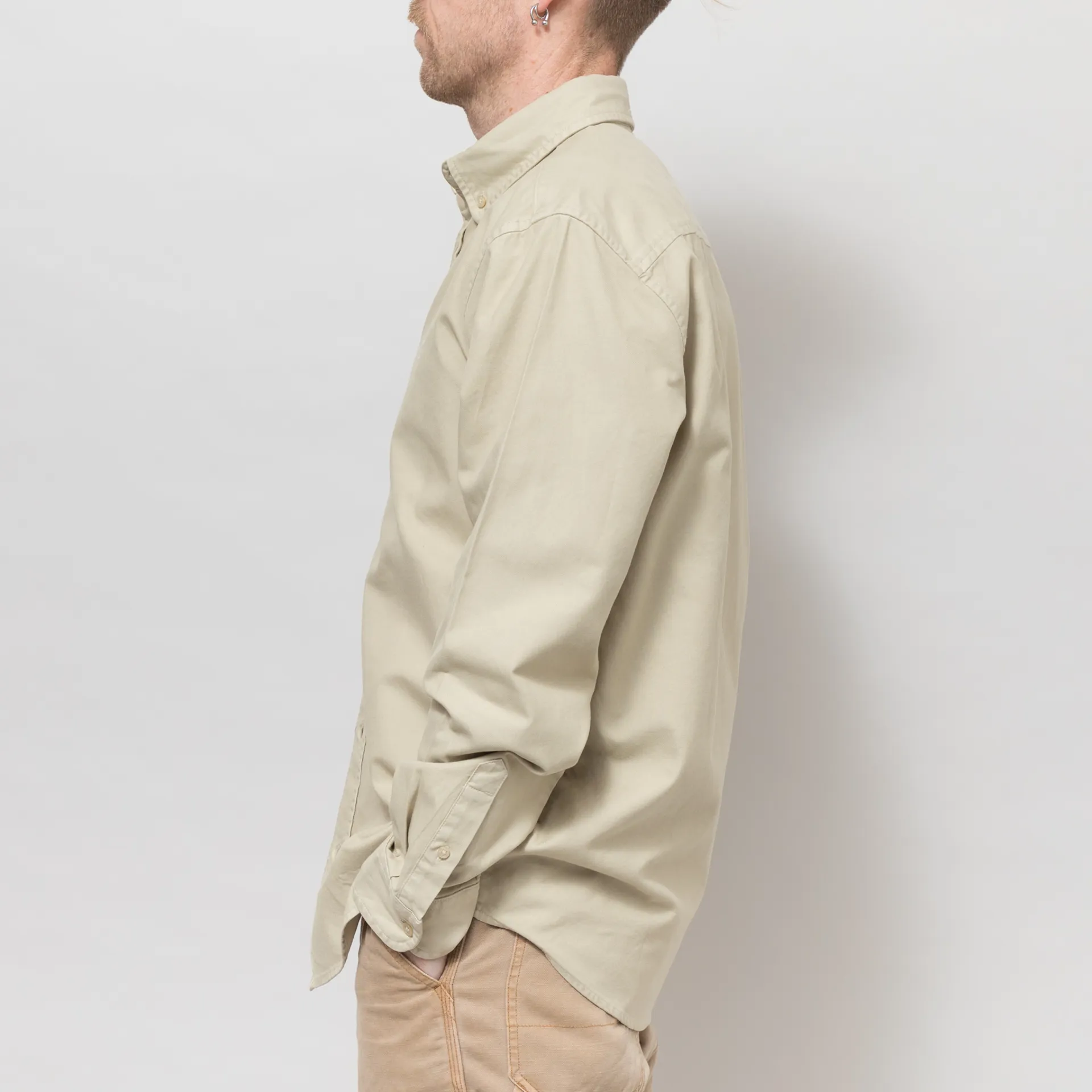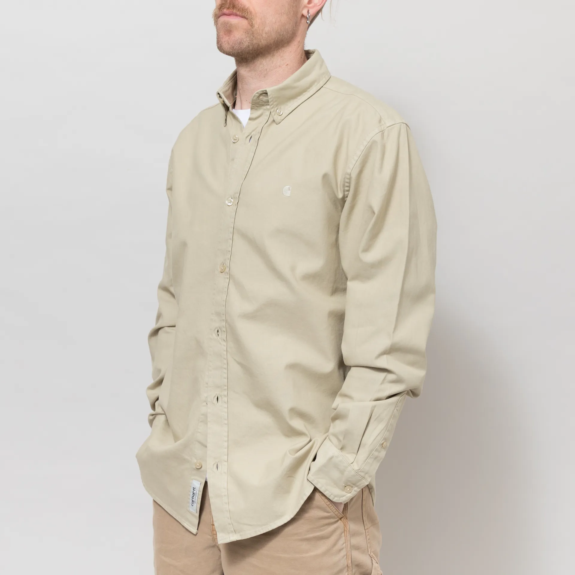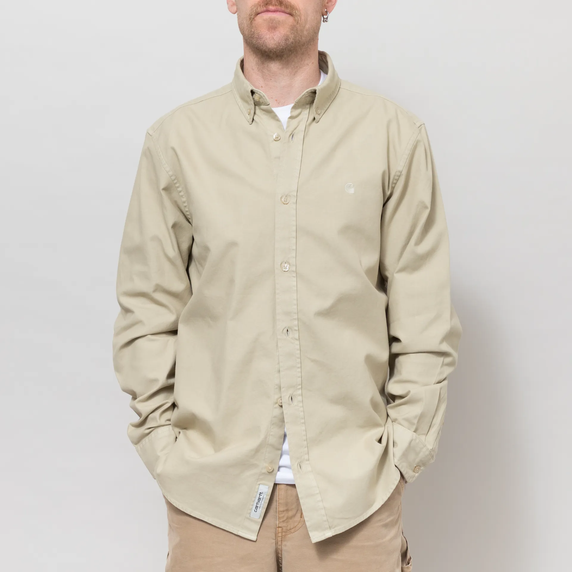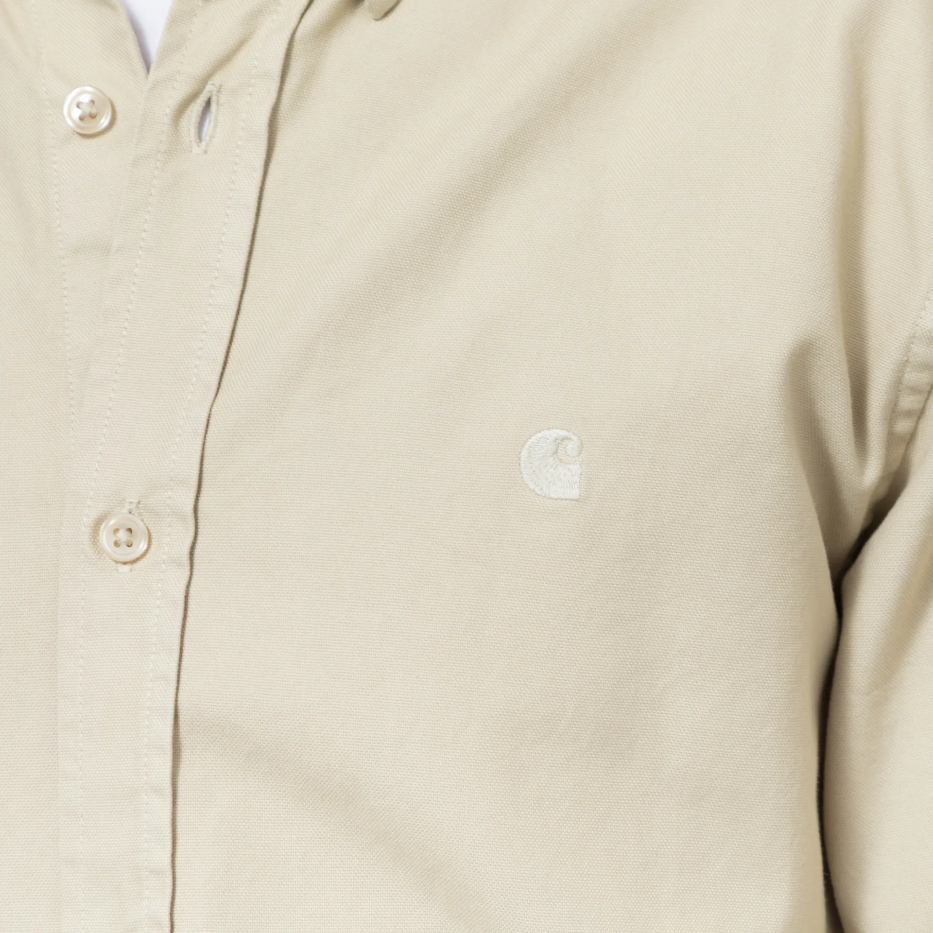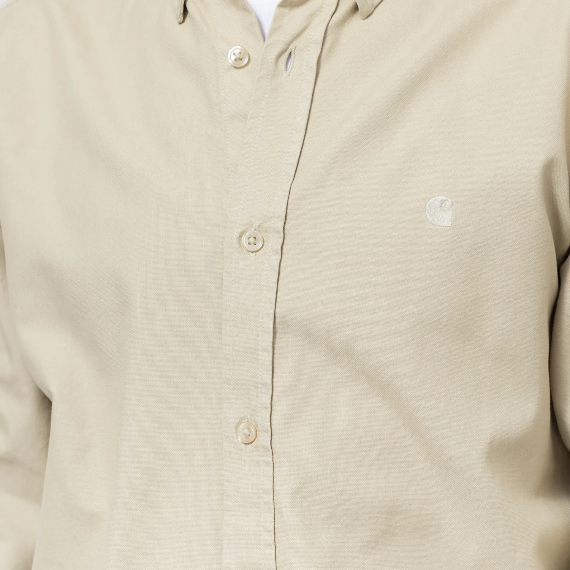 A long sleeve shirt from Carhartt WIP made from a super comfortable and classic 100% cotton in an Oxford weave. It has a buttoned front, cuffs and collar, and an embroidered logo to the chest. It also features a soft garment dye for a soft colour.