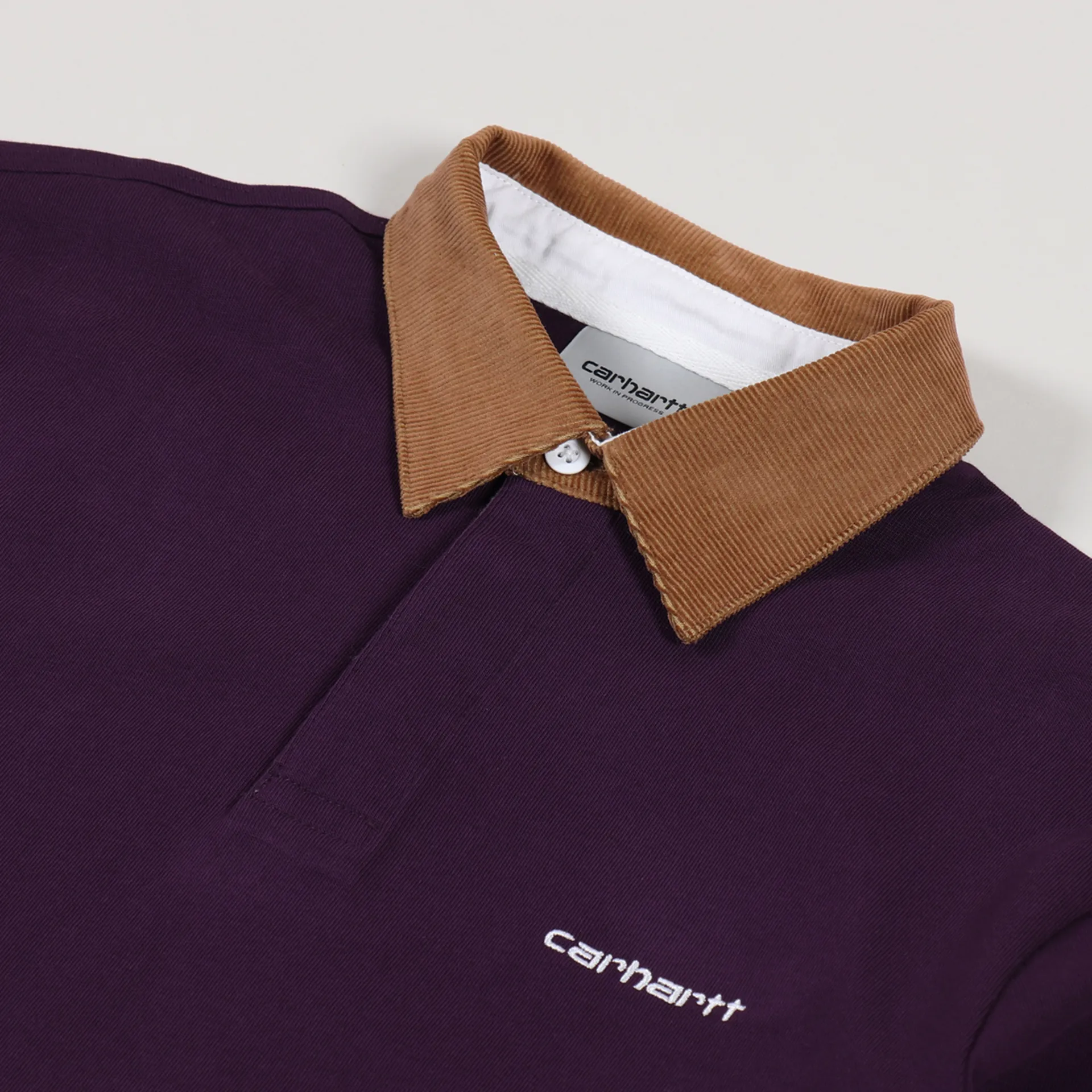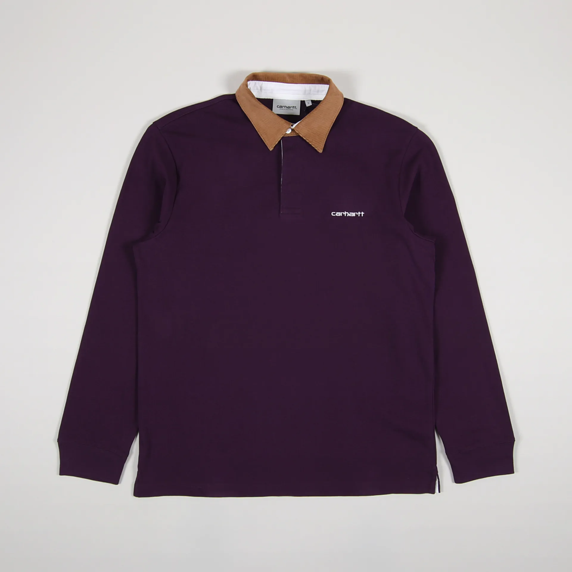 A long sleeve rugby shirt from Carhartt WIP, made from a comfortable yet durable 100% cotton with a buttoned neck and corduroy collar, ribbed cuffs and an embroidered Script logo to the chest.