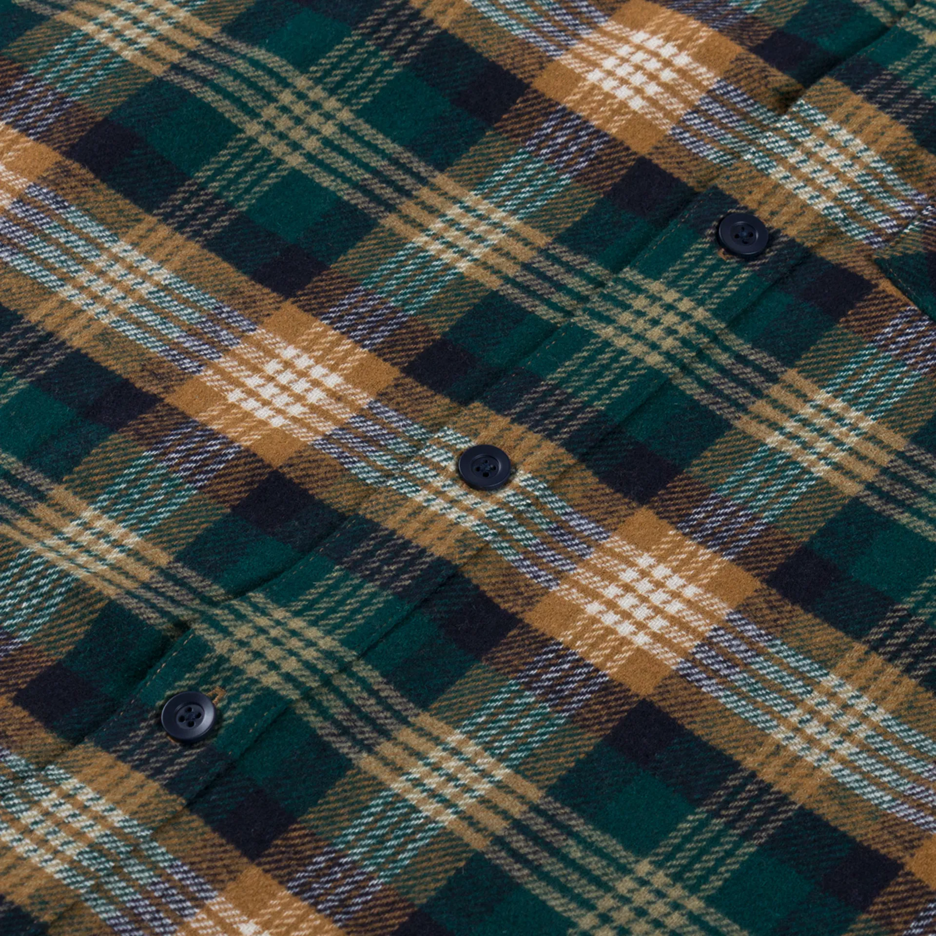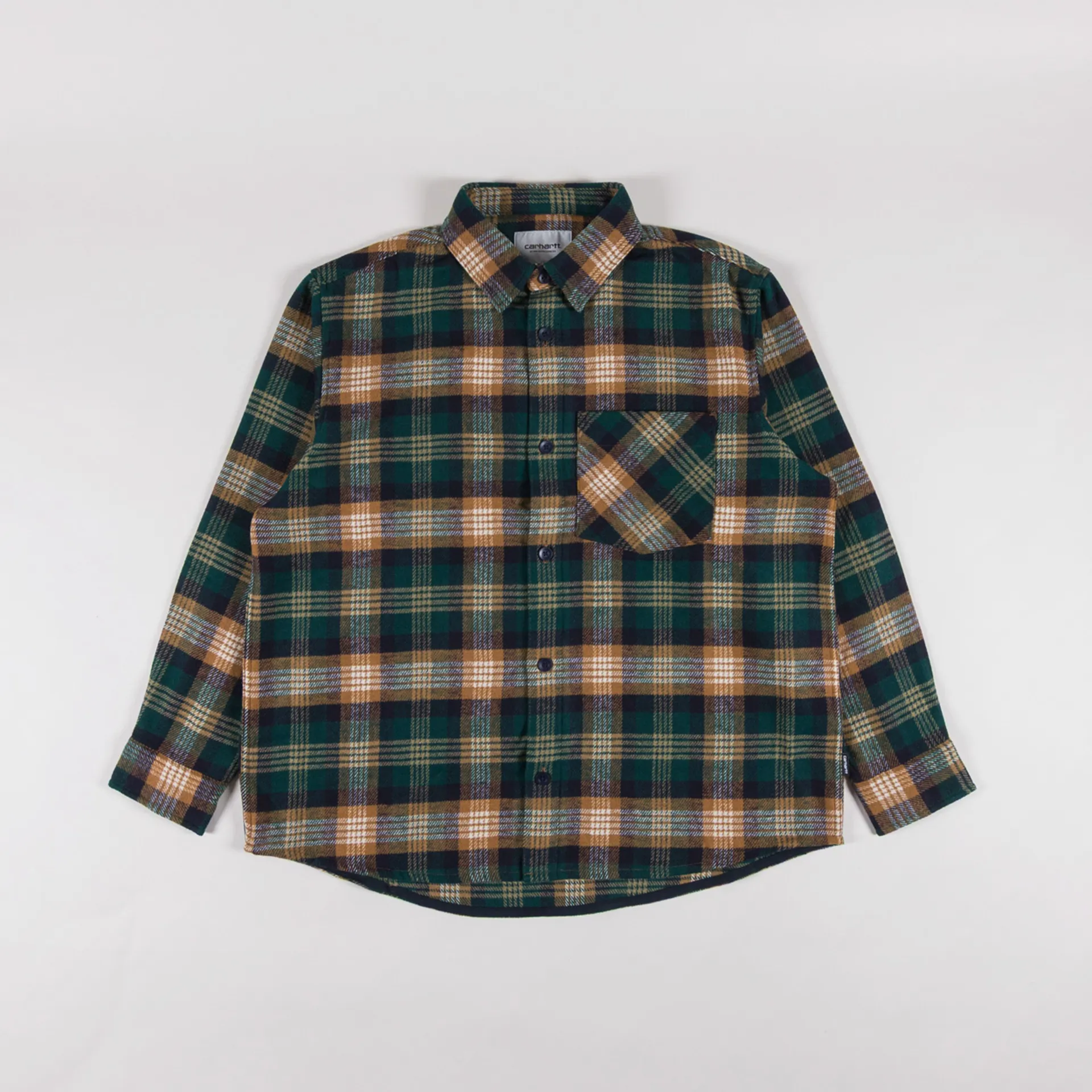 A long sleeve checkered shirt from Carhartt WIP, cut in a loose fit for a laidback silhouette and constructed from a midweight poly-wool herringbone fabric. It has been garment-washed for a softer hand feel and yarn dyed for greater depth of colour. Featuring a full button-through front, leading up to a classic collar, with a curved hem and buttoned cuffs. Finished off with a single patch pocket to the chest and a flag label to the side seam.