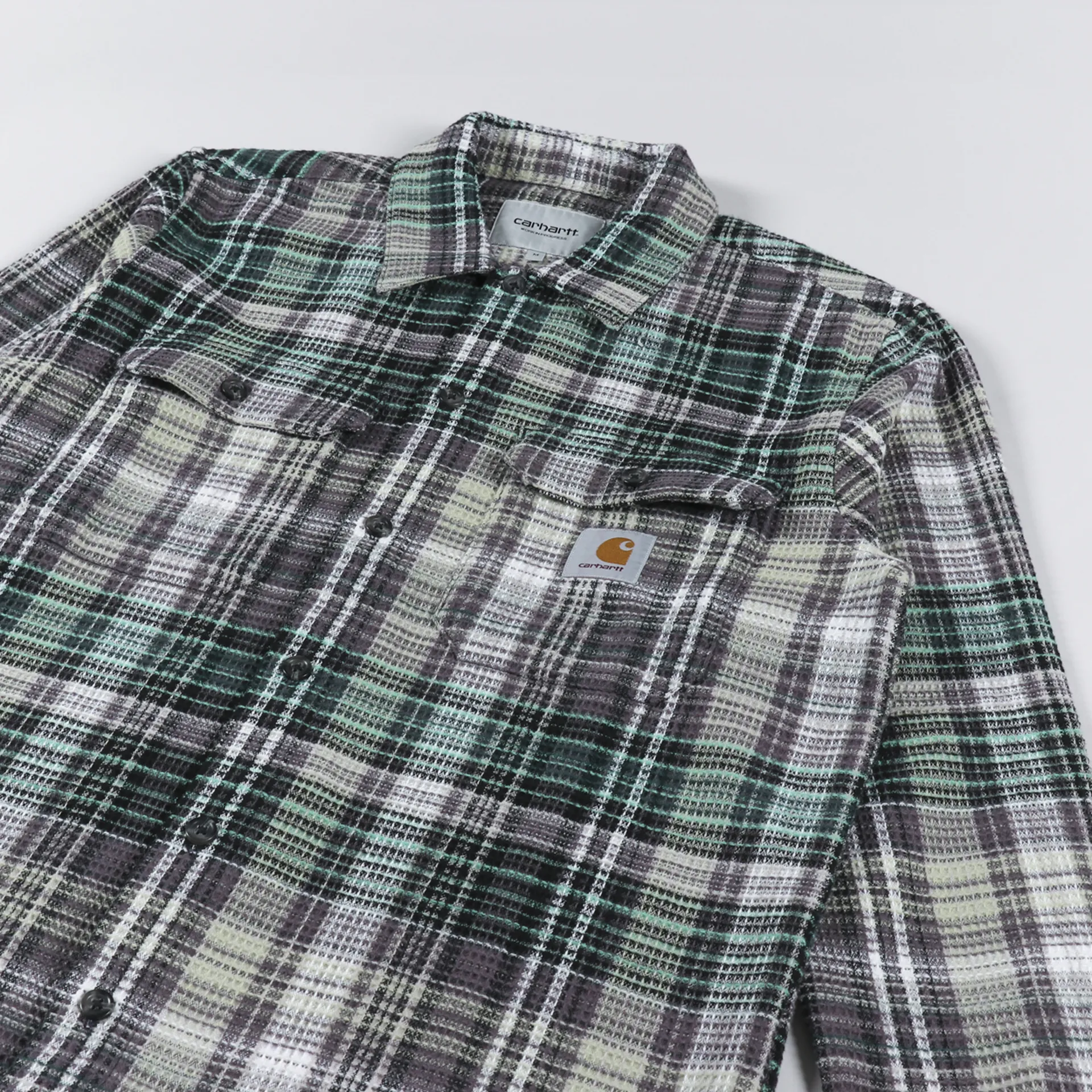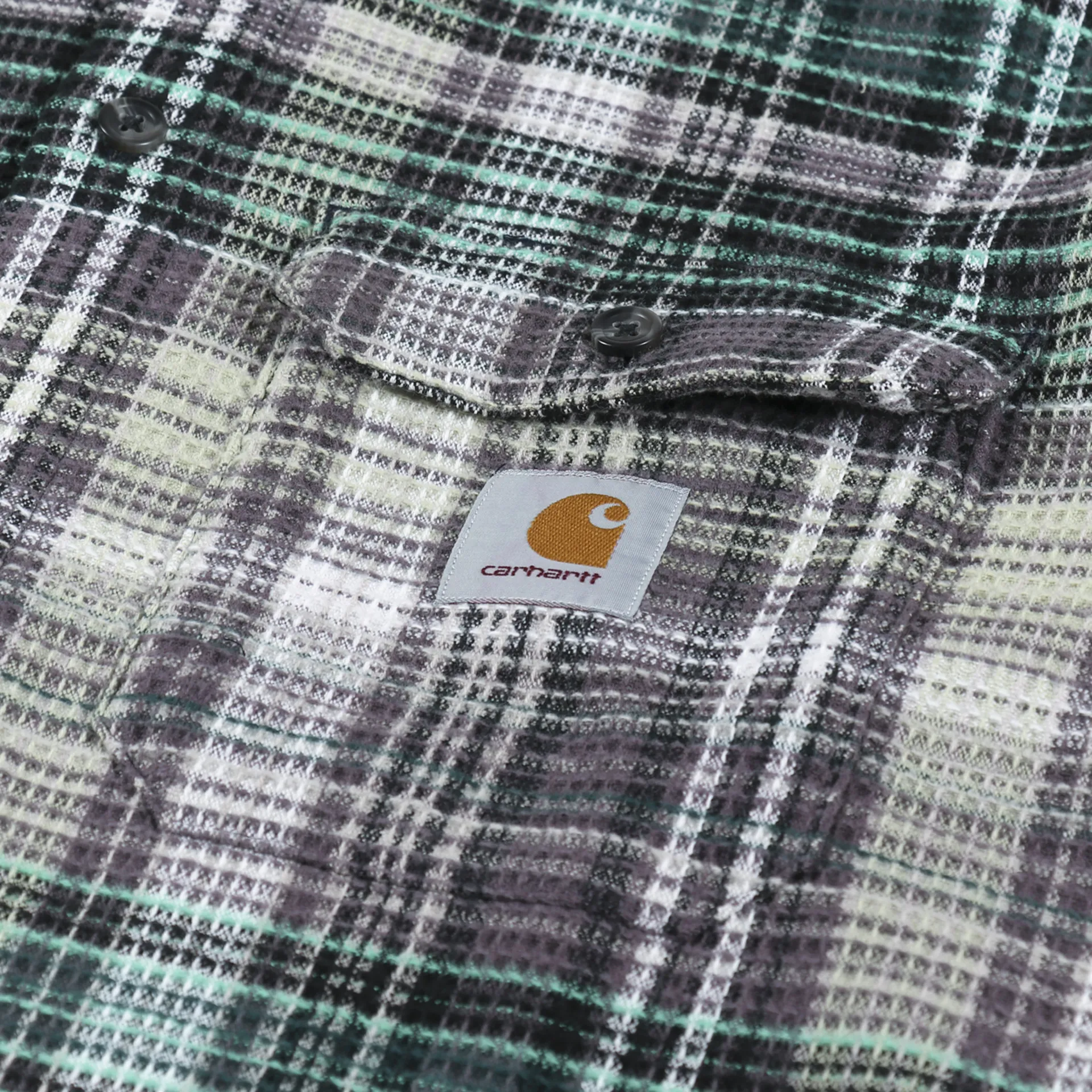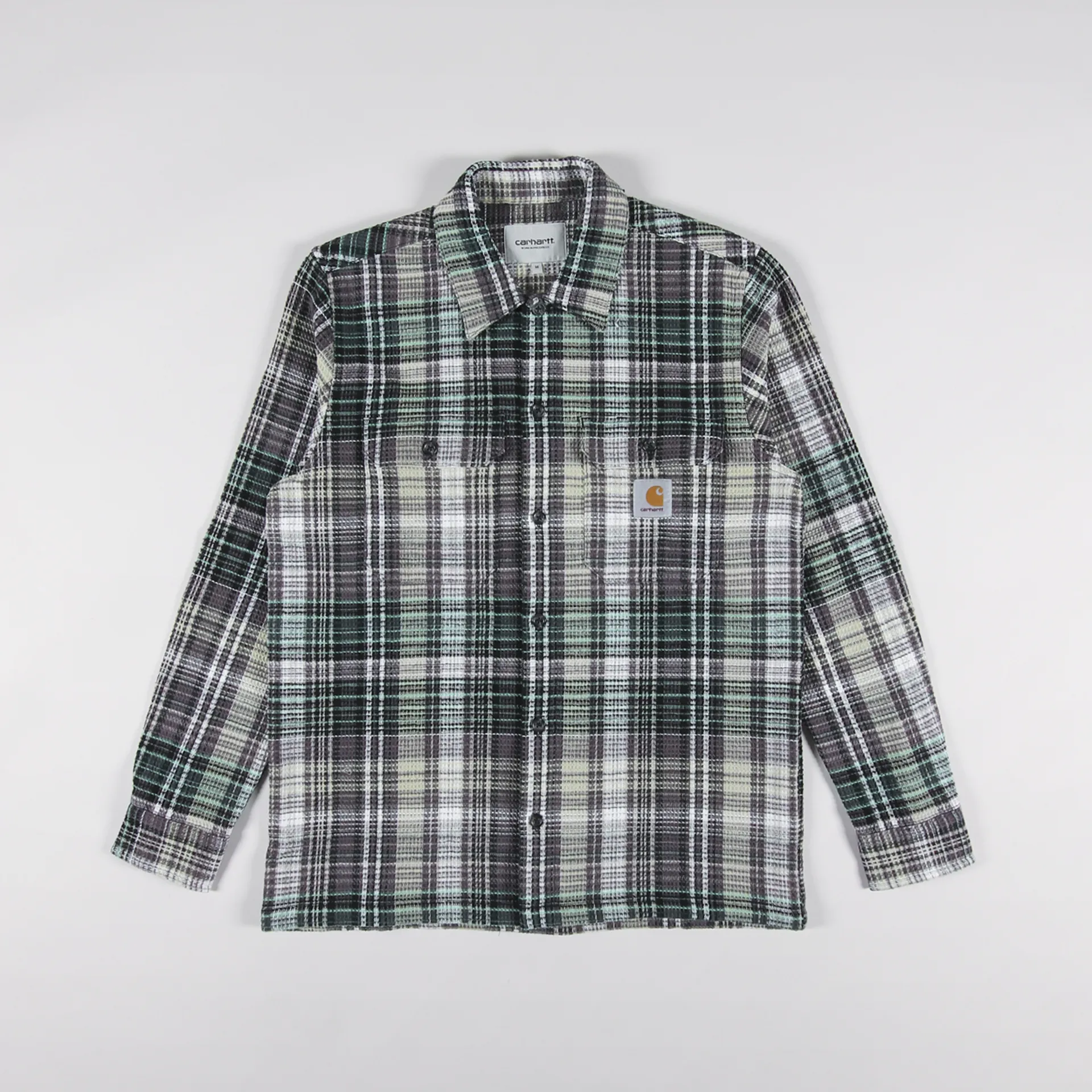 A long sleeve shirt from Carhartt WIP made from a comfortable, midweight 100% cotton waffle knit, with a buttoned front and cuffs, and two chest pockets. It has a check pattern and a woven logo patch.