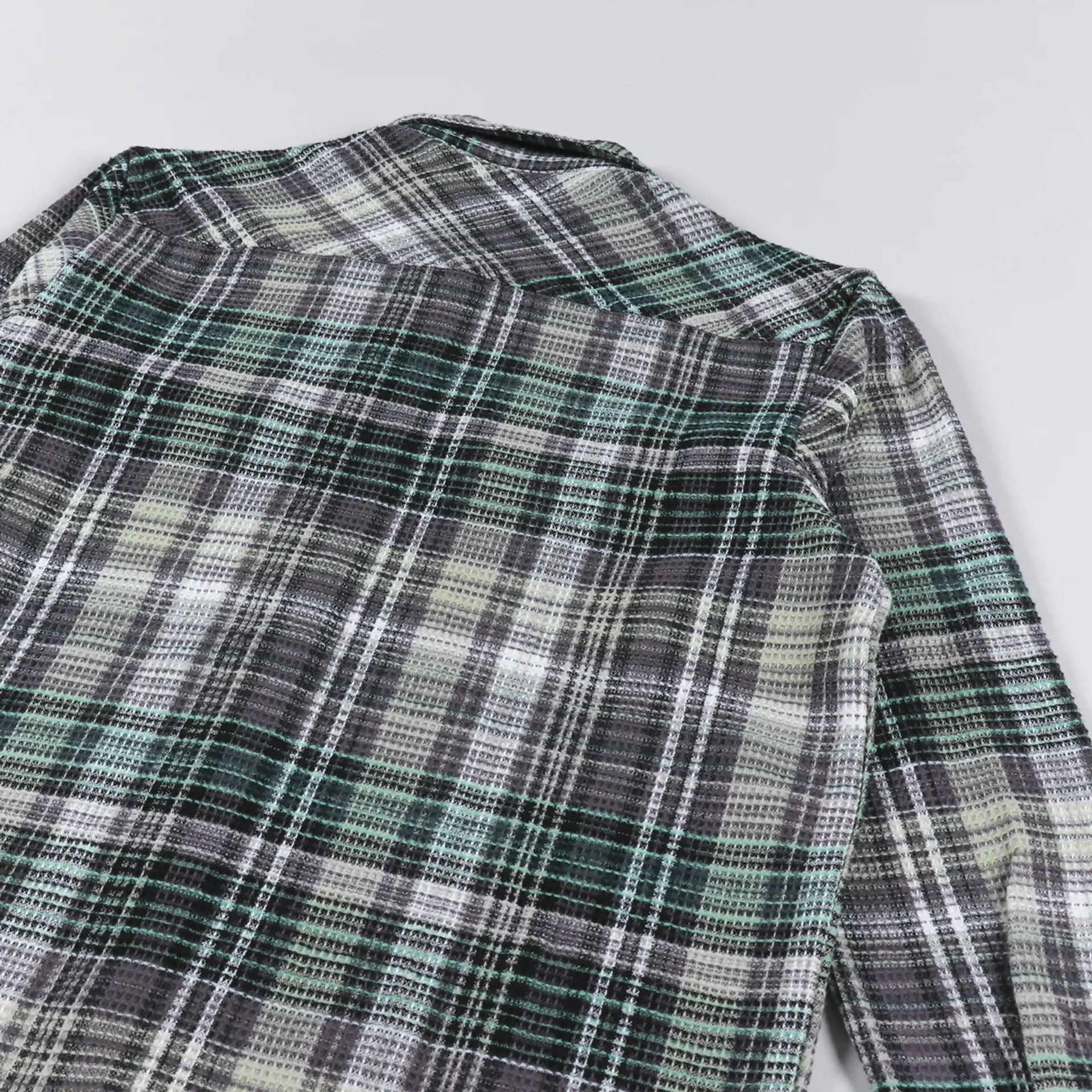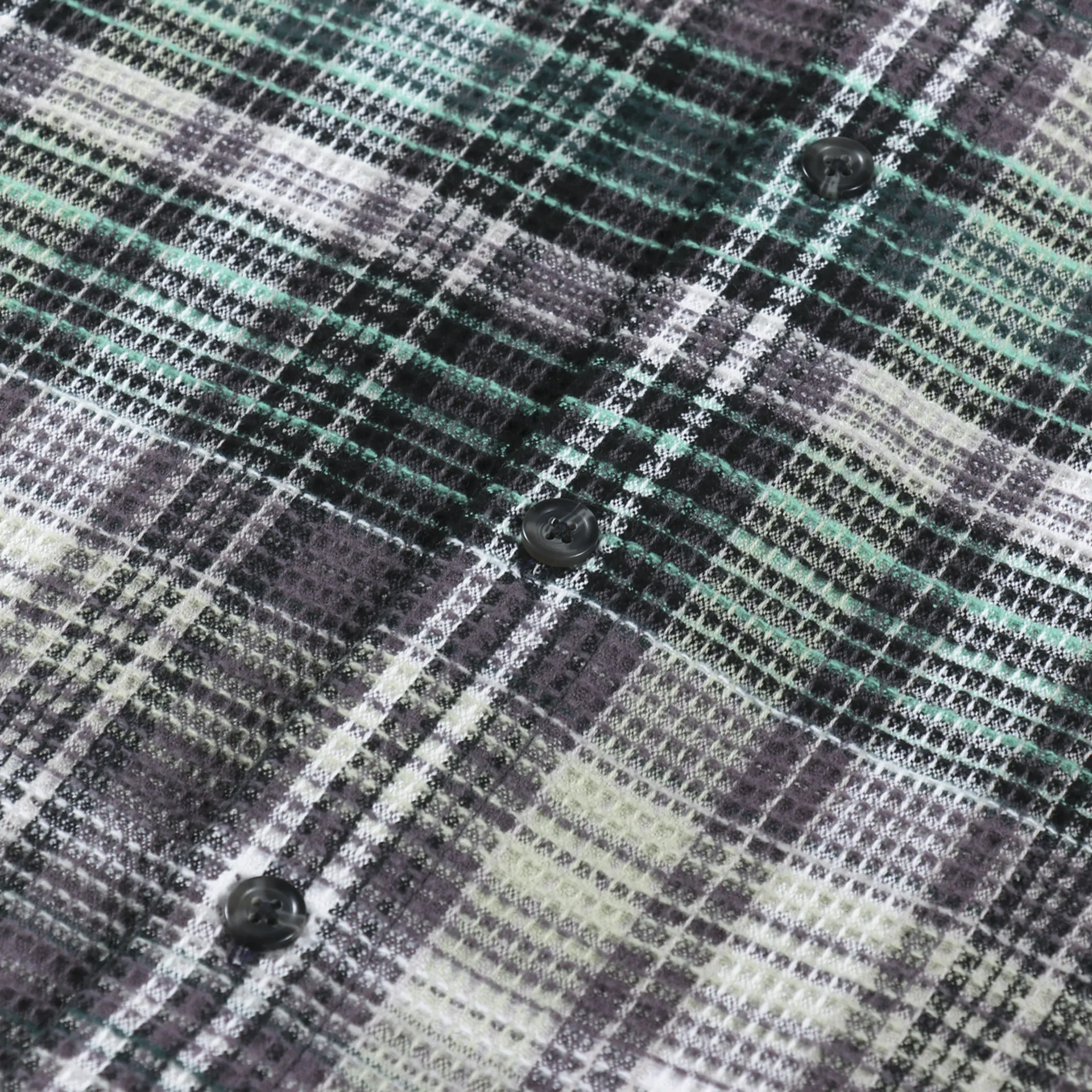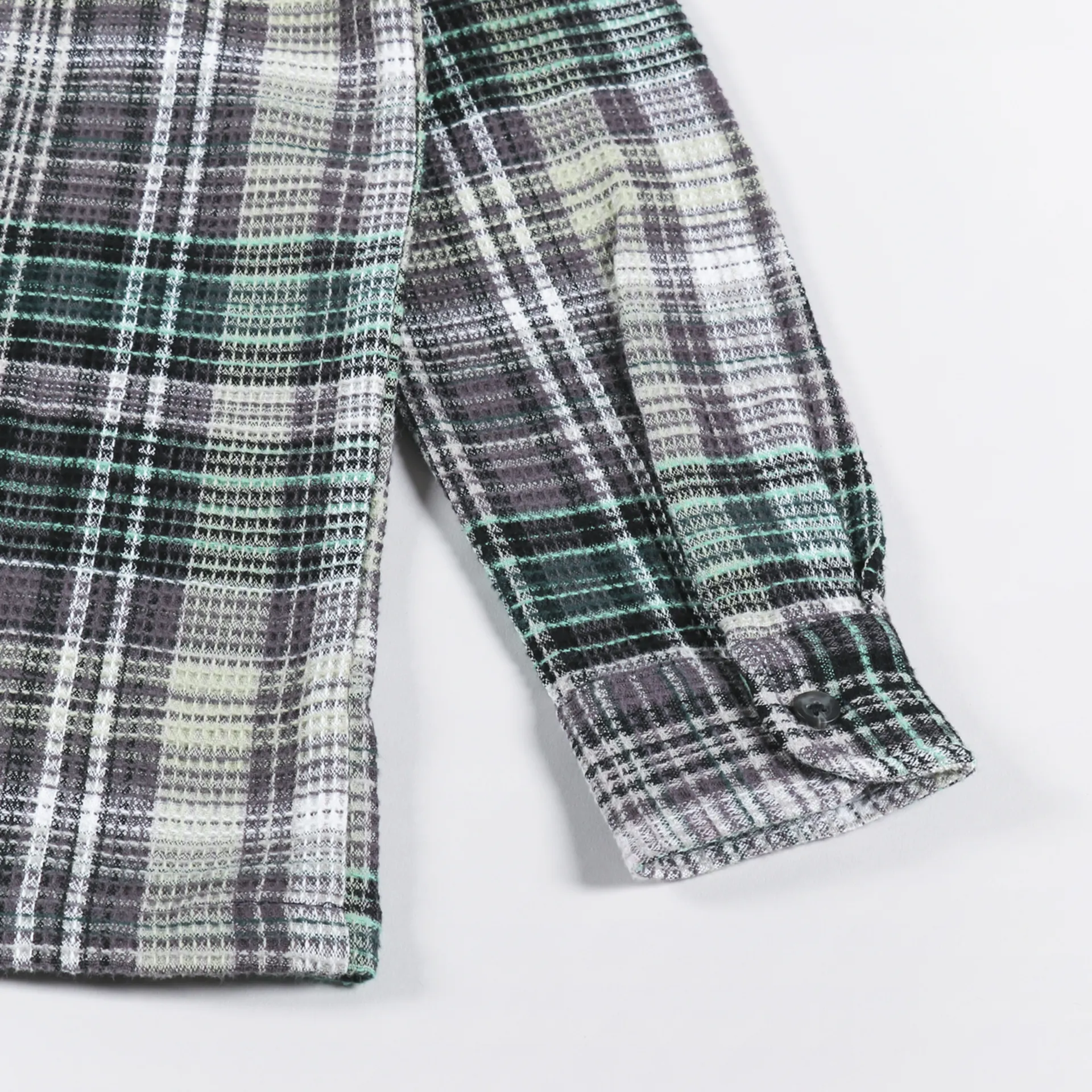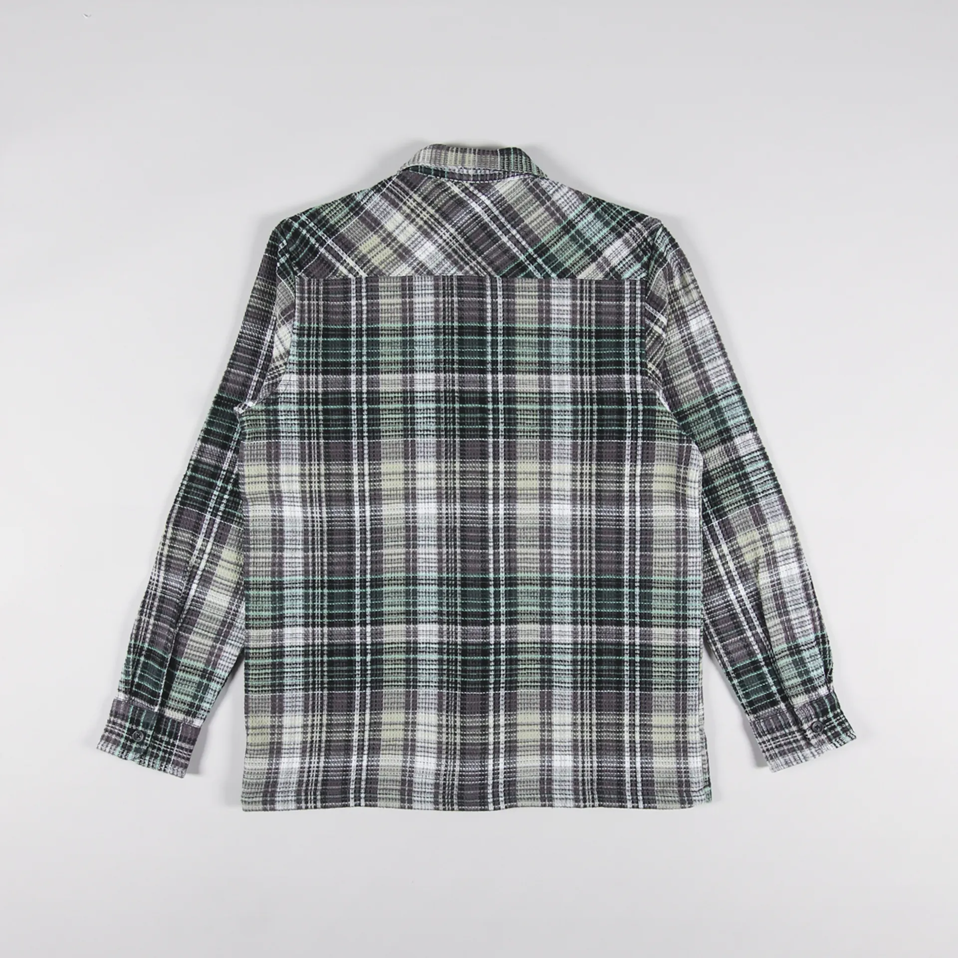 A long sleeve shirt from Carhartt WIP made from a comfortable, midweight 100% cotton waffle knit, with a buttoned front and cuffs, and two chest pockets. It has a check pattern and a woven logo patch.