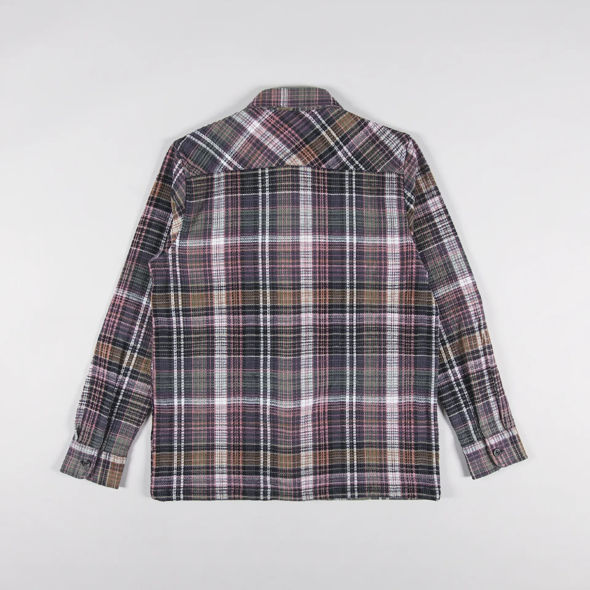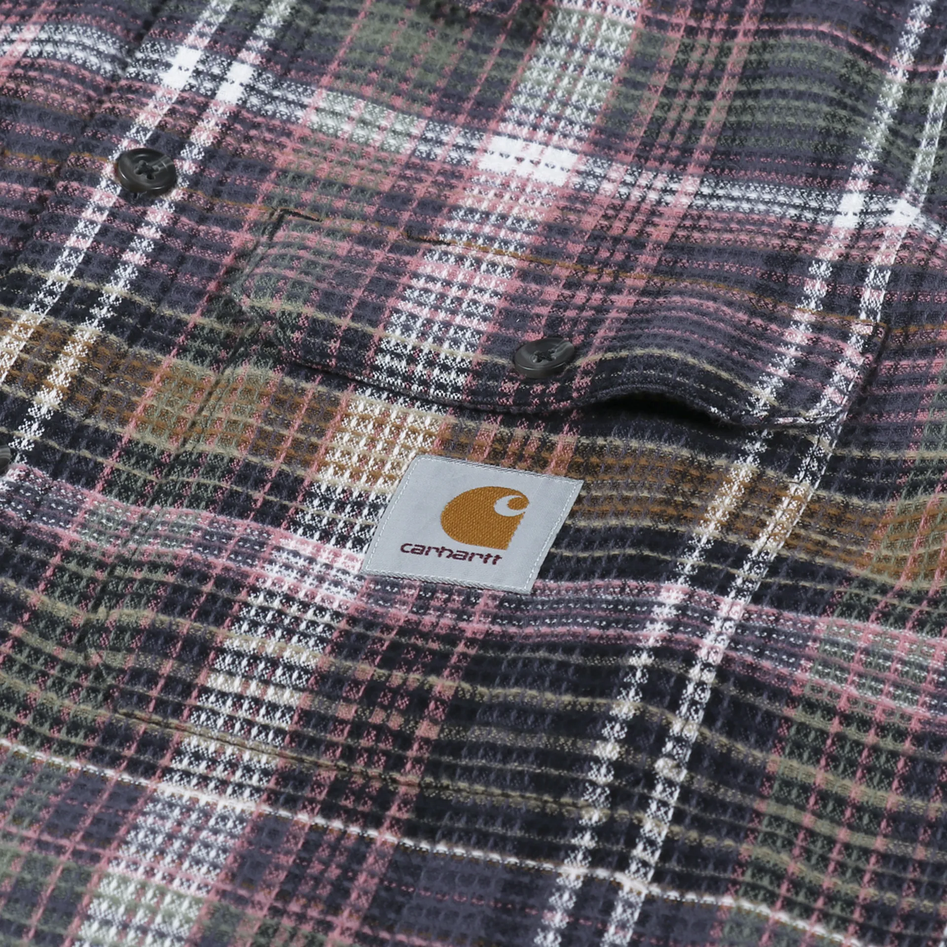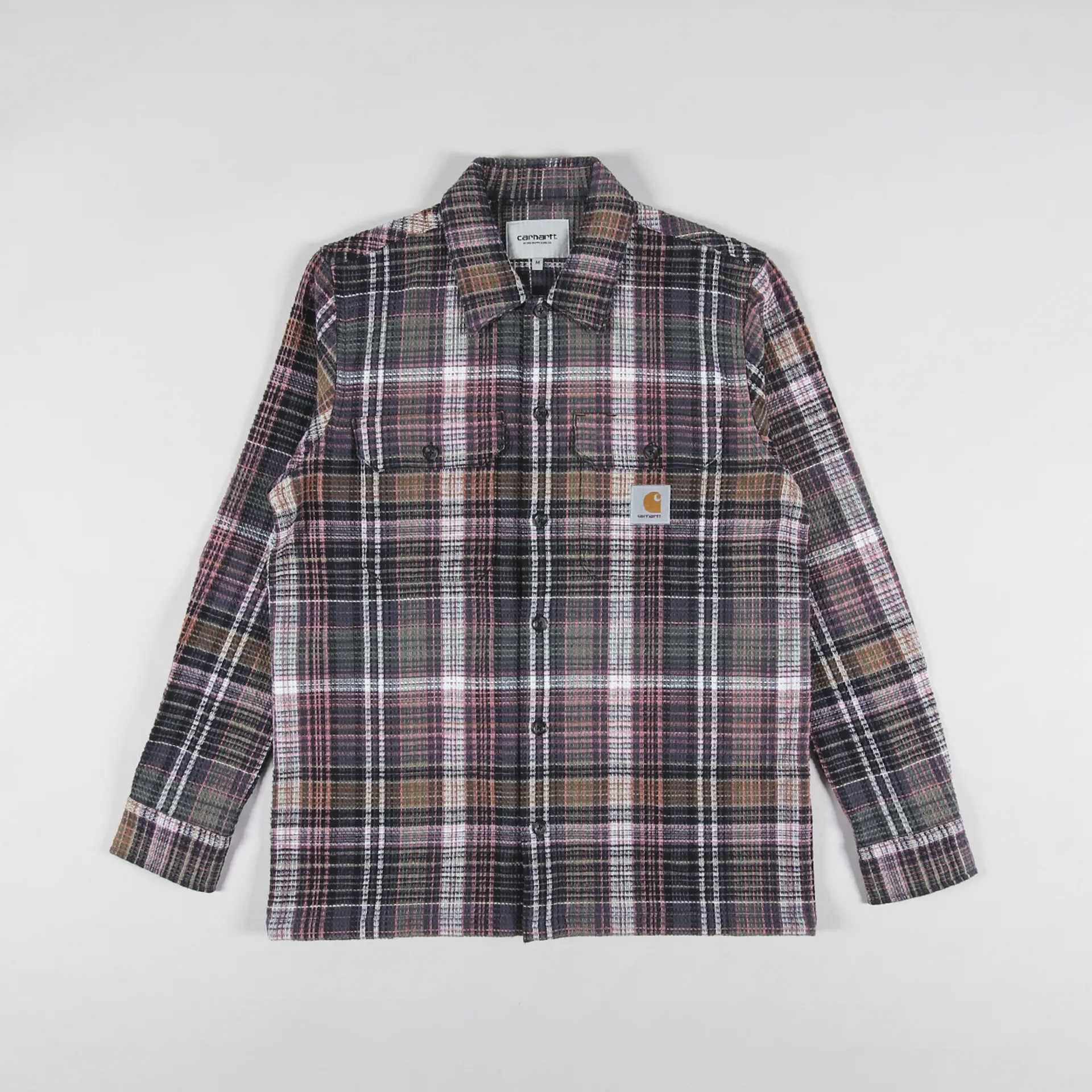 A long sleeve shirt from Carhartt WIP made from a comfortable, midweight 100% cotton waffle knit, with a buttoned front and cuffs, and two chest pockets. It has a check pattern and a woven logo patch.