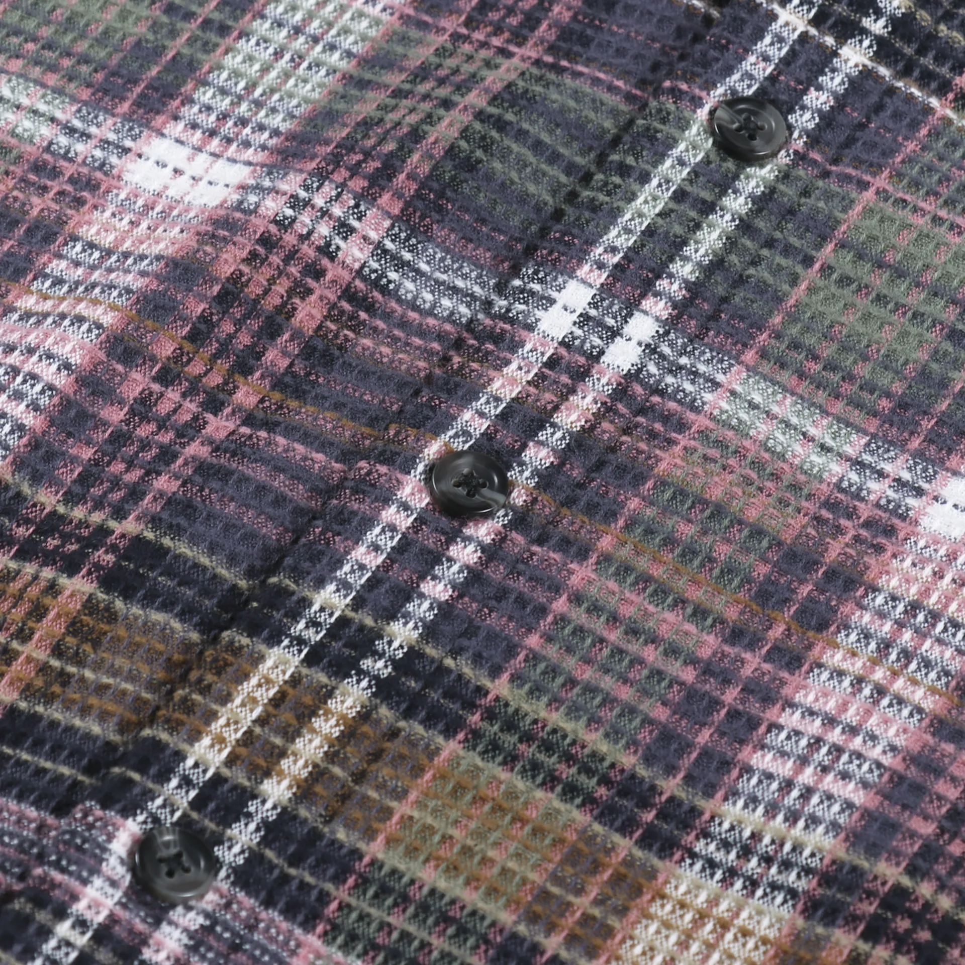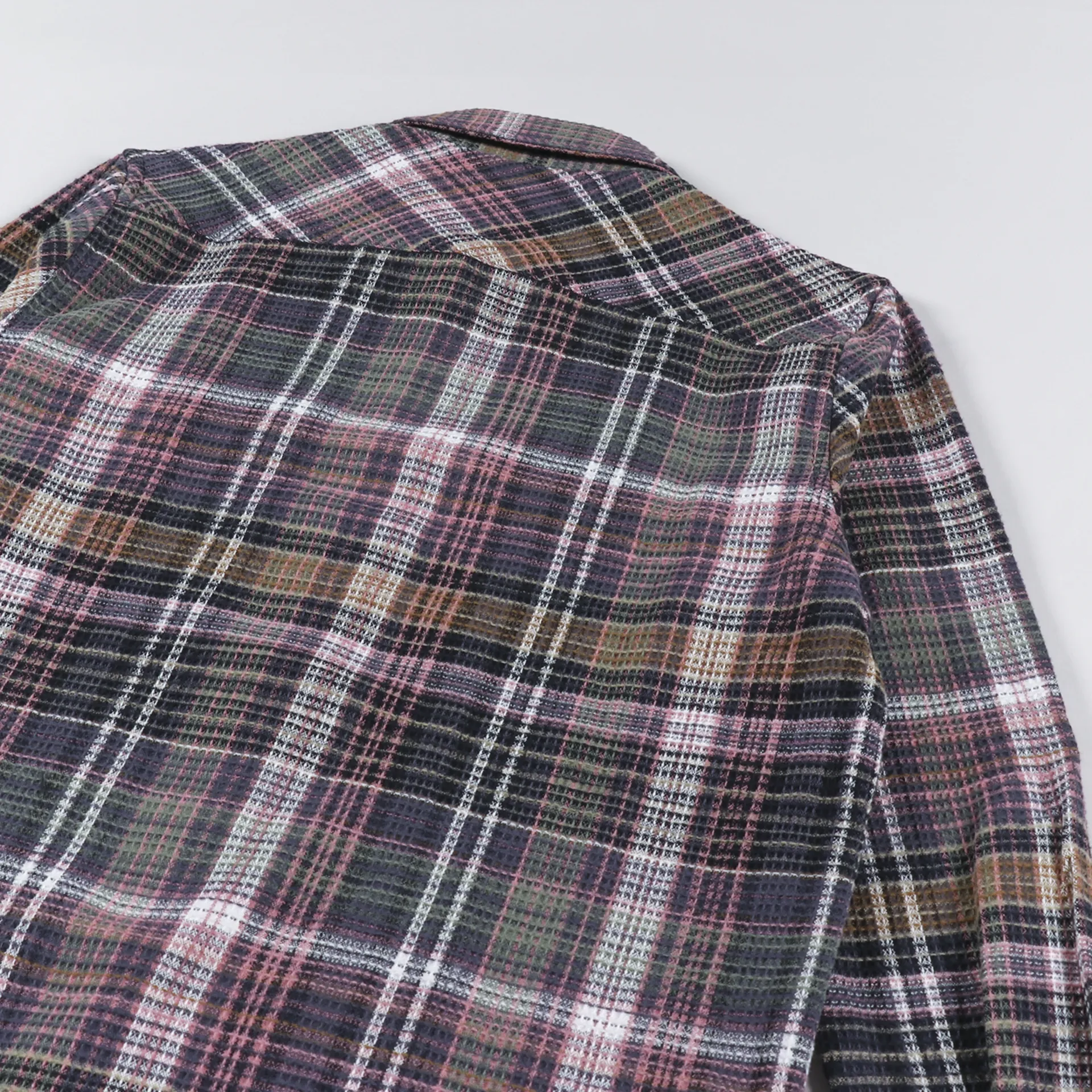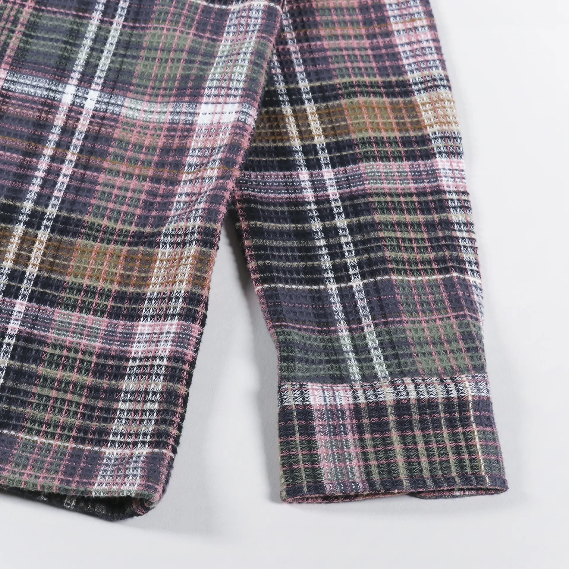 A long sleeve shirt from Carhartt WIP made from a comfortable, midweight 100% cotton waffle knit, with a buttoned front and cuffs, and two chest pockets. It has a check pattern and a woven logo patch.