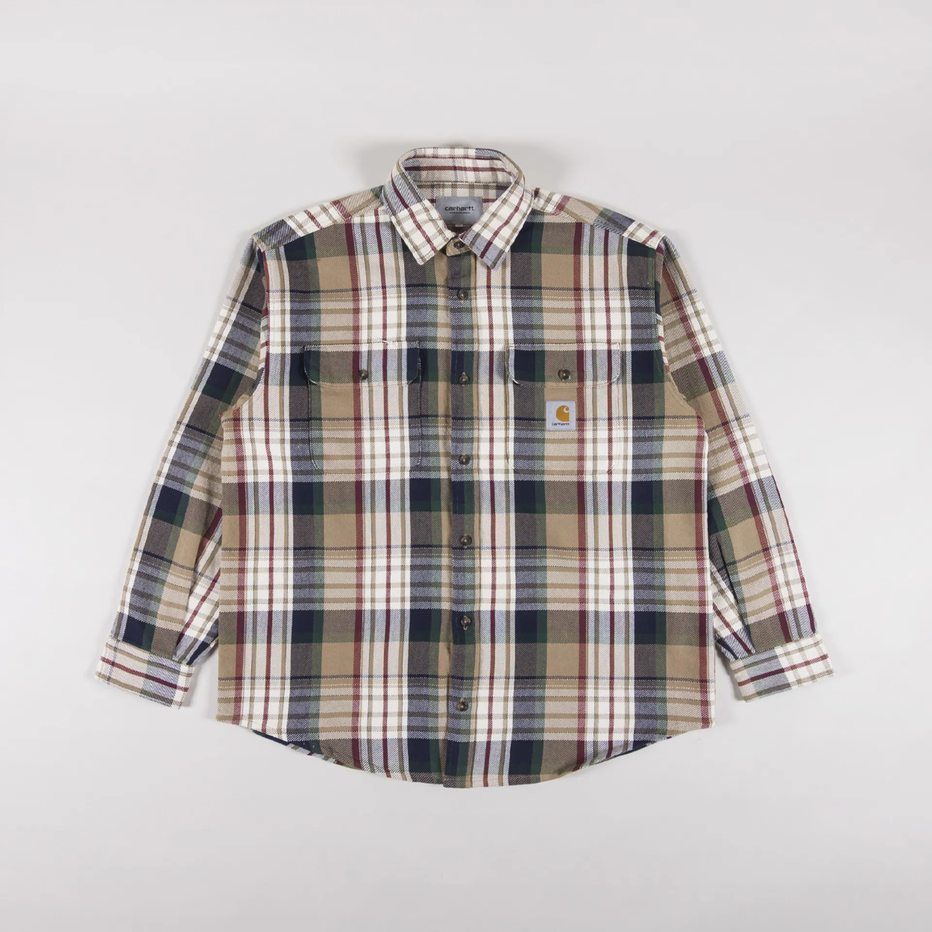 A long sleeve shirt from Carhartt WIP, constructed from midweight cotton twill with an all-over checkered pattern. It has been yarn-dyed for a complex colour configuration and garment-washed for a soft hand feel. Featuring a full button-through front, leading to a classic collar, with a curved hem and buttoned cuffs. Finished off with two buttoned chest pockets, one displaying the signature Carhartt square label.