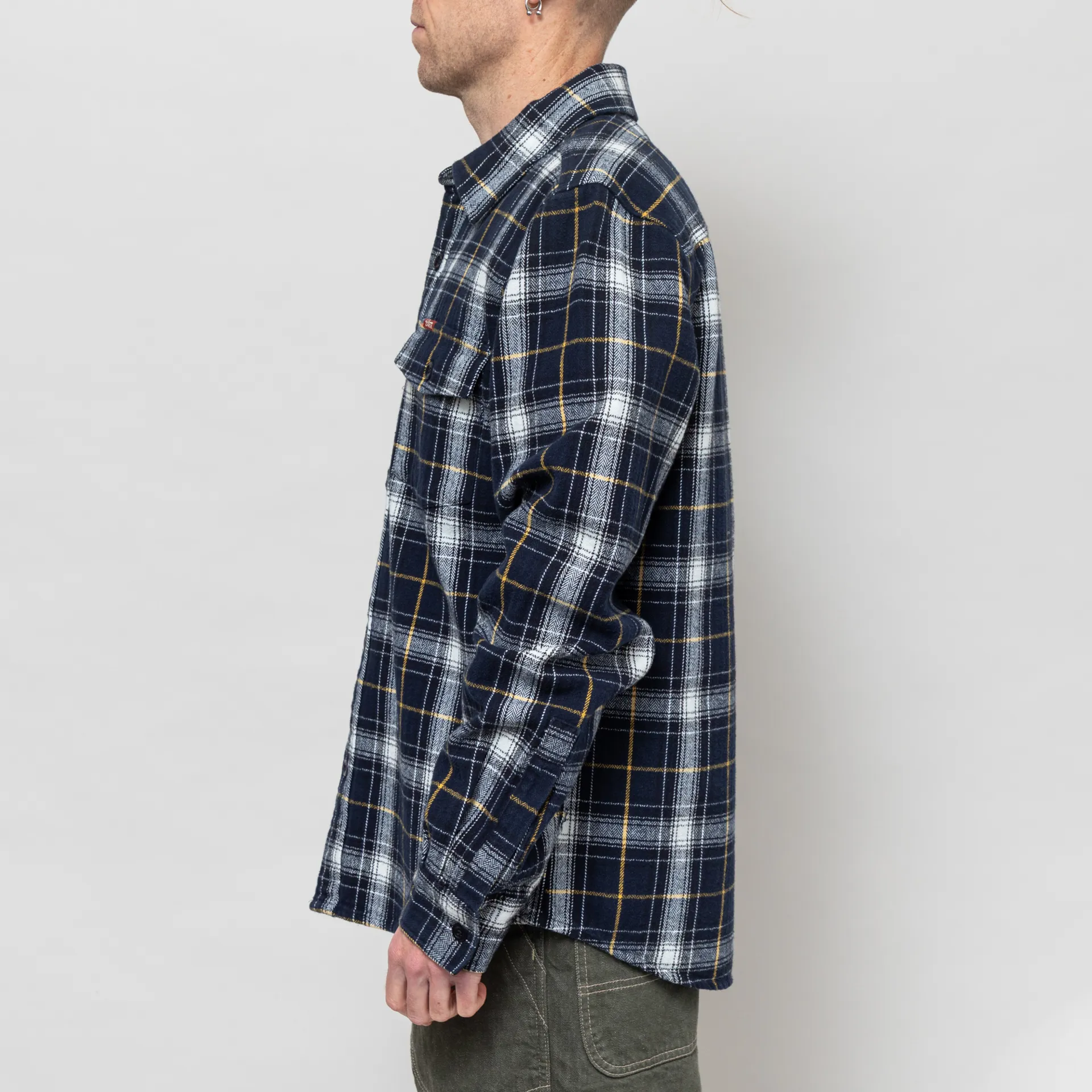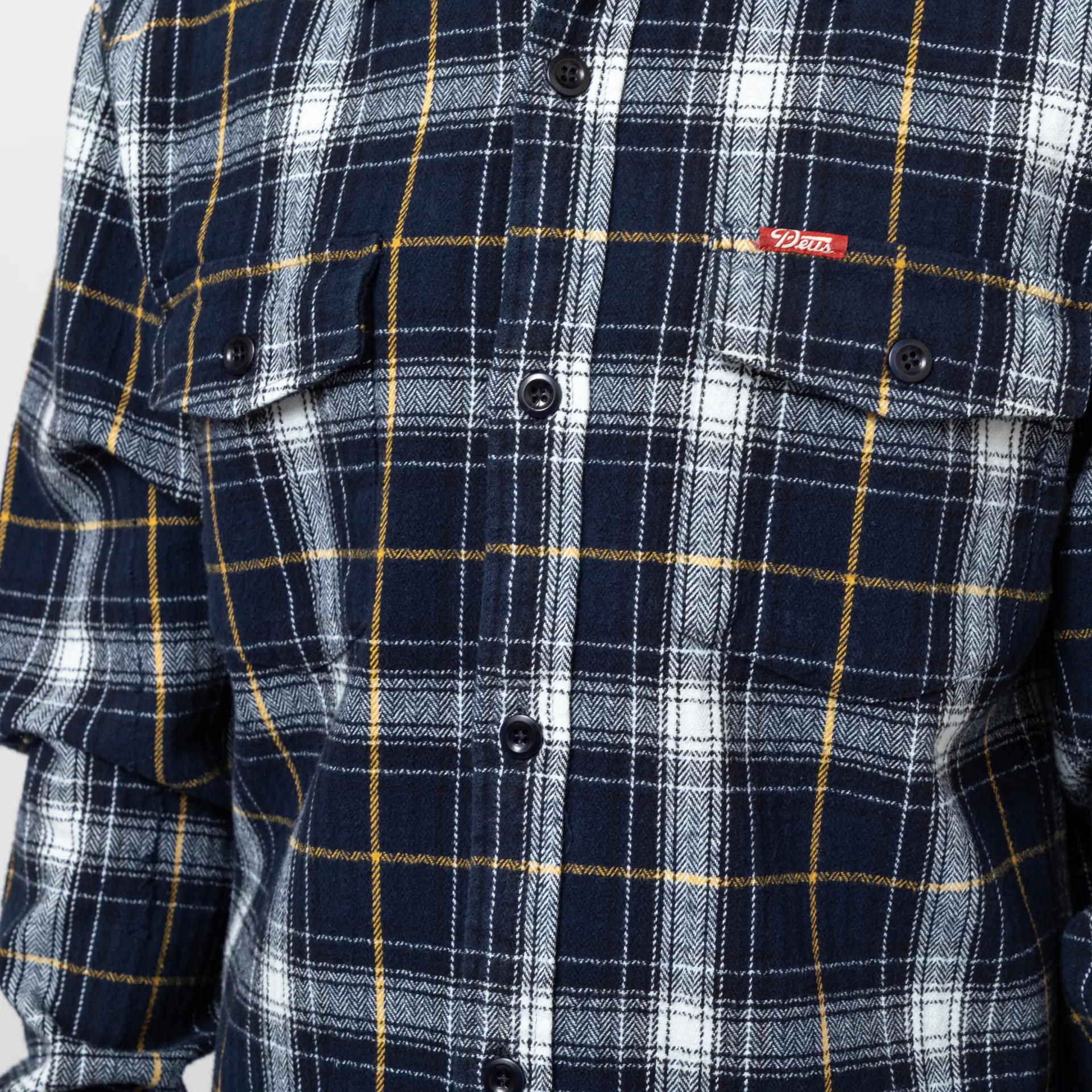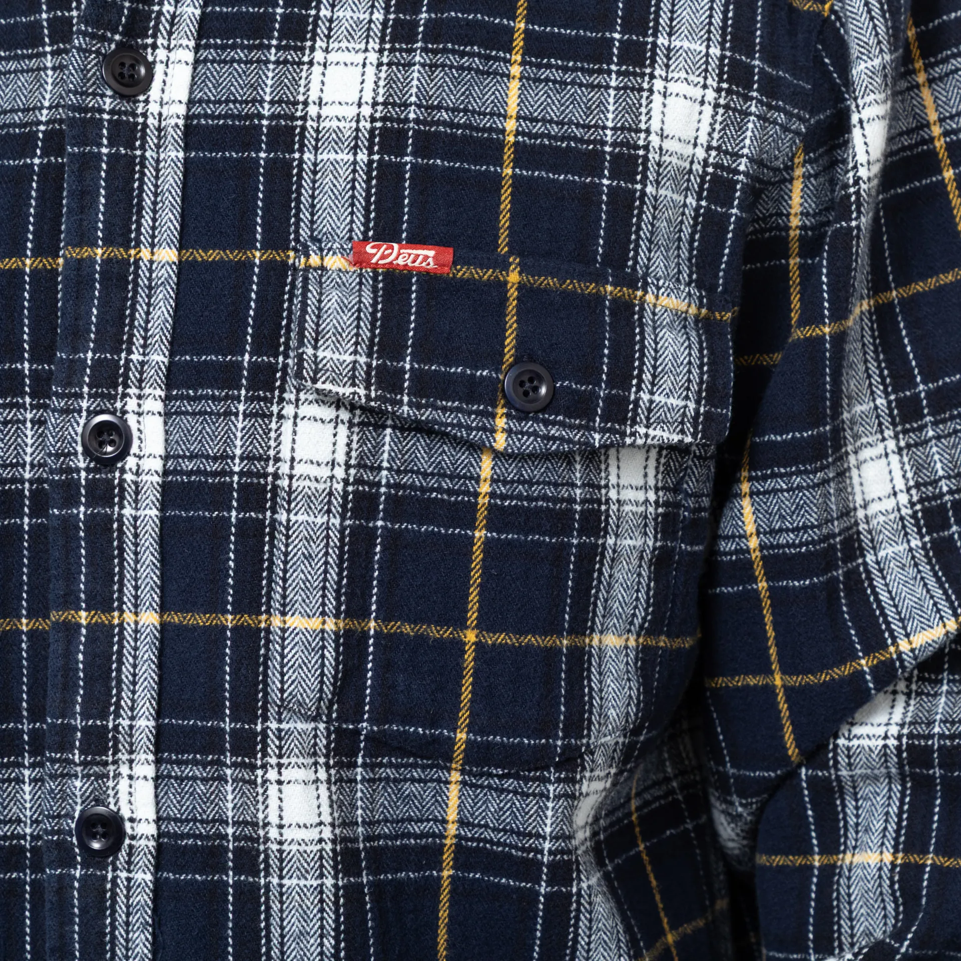 A long sleeve shirt from Deus, cut in a regular fit for everyday comfort and constructed from soft brushed cotton with a yarn-dyed check pattern. It features a full button-through front, leading to a classic collar, with a curved hem, buttoned cuffs and two chest pockets. The design is complete with a small Deus logo to the left pocket.
