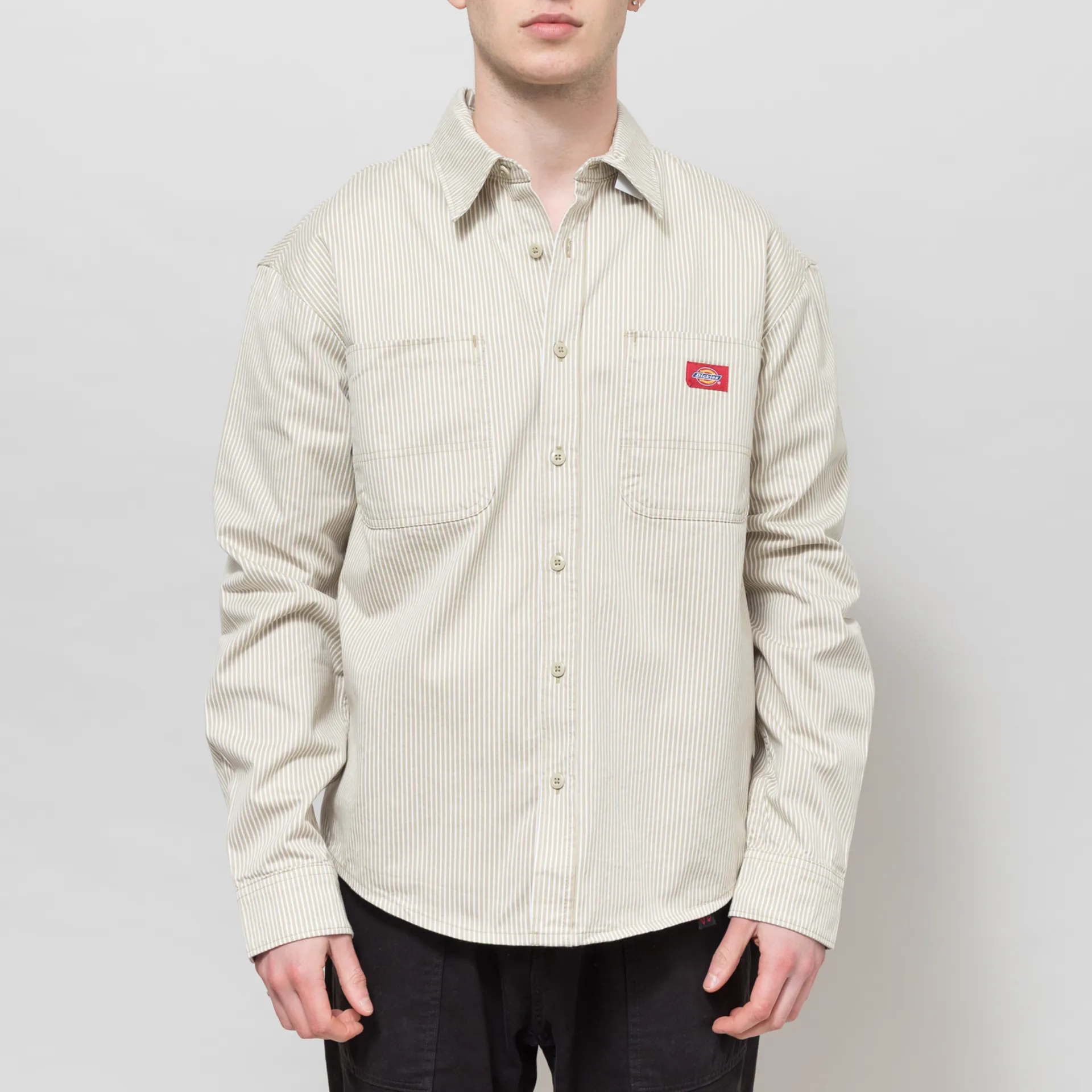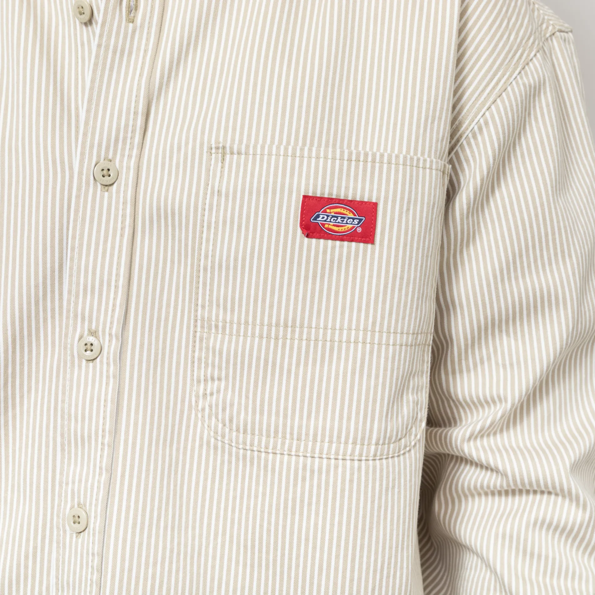 A long-sleeve striped shirt from Dickies, cut in a regular fit for everyday comfort and constructed from 7oz hickory cotton twill fabric. It features a full button-through front, leading to a pointed collar, with a curved hem and buttoned cuffs. The design is complete with two rounded chest pockets, one displaying a woven Dickies logo patch.