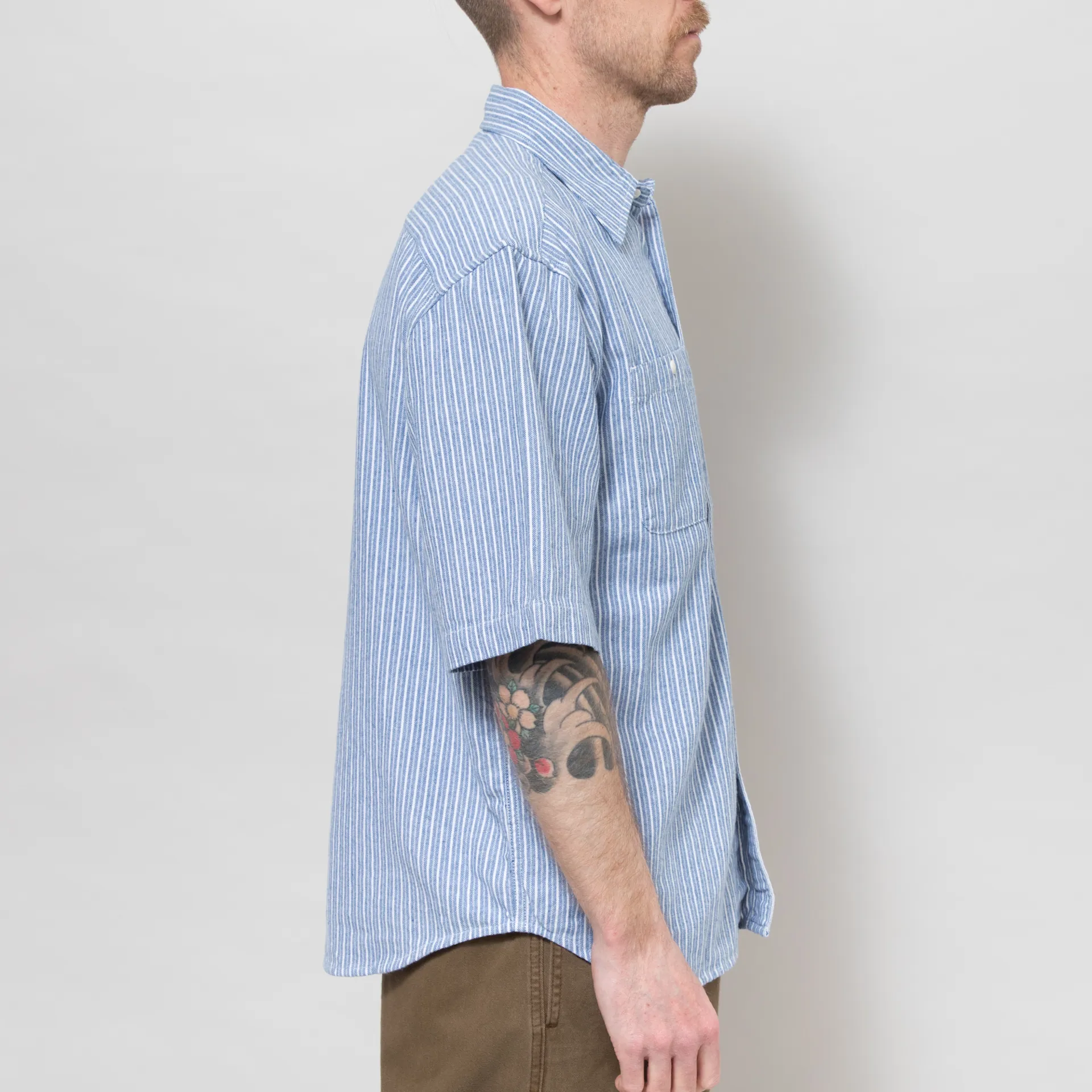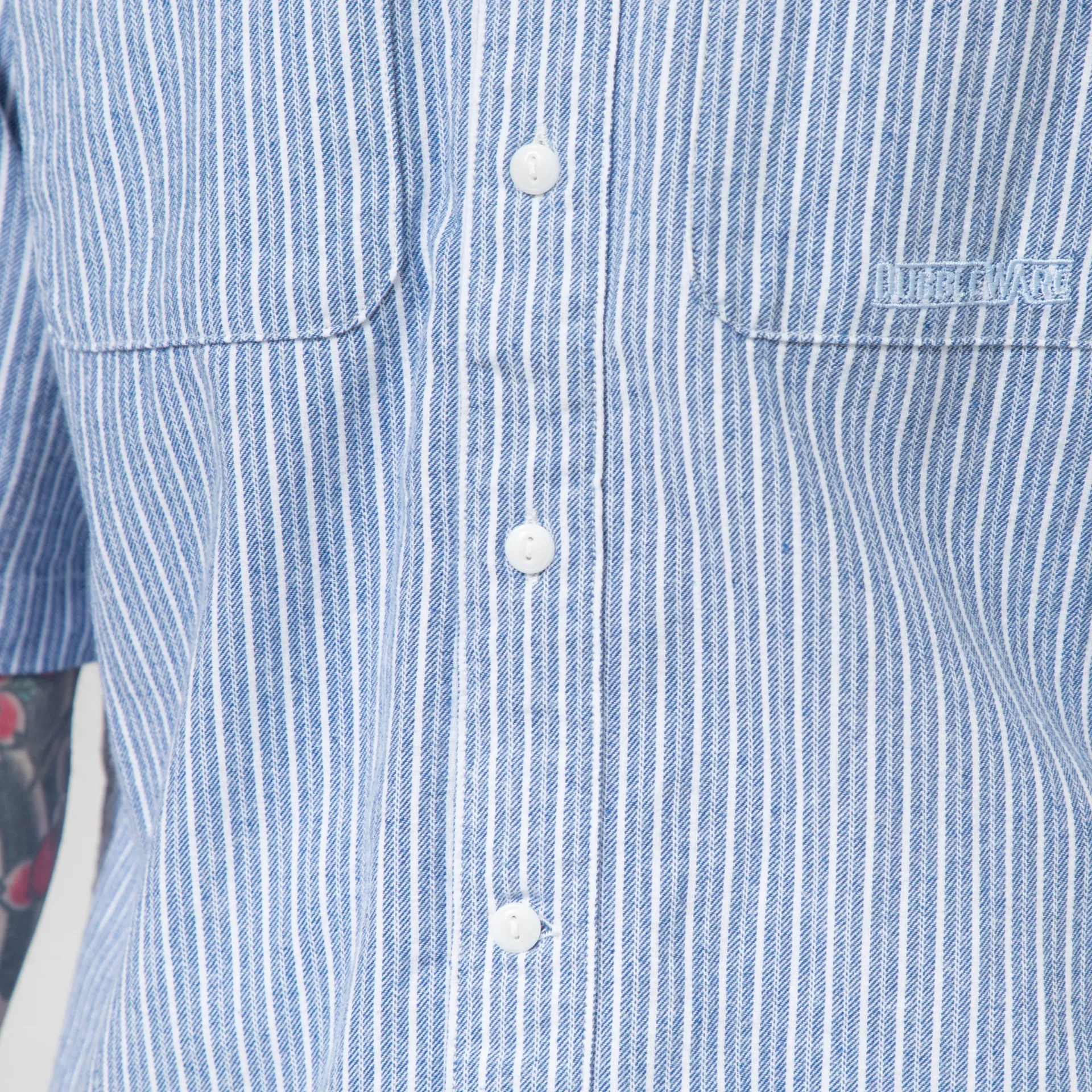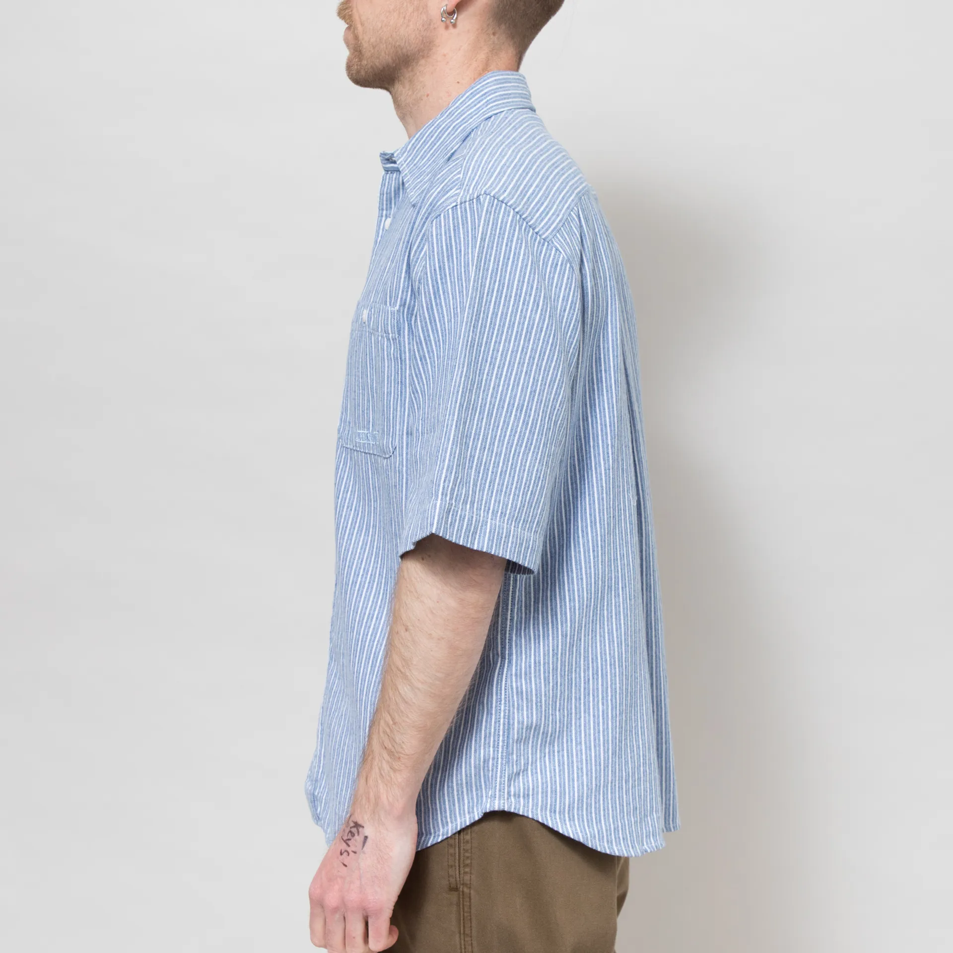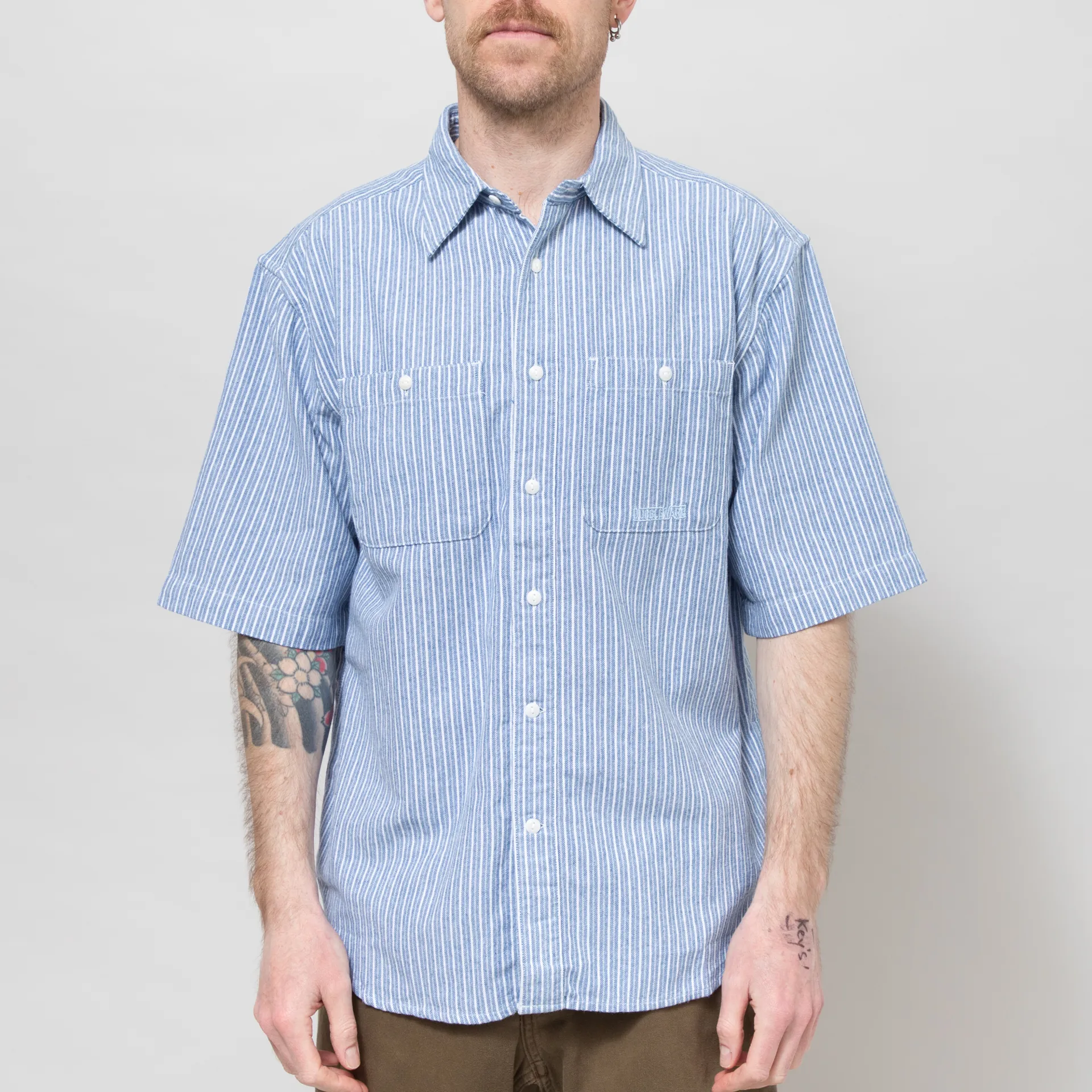 A classic workshirt from Dubbleware, cut in a slightly boxy, relaxed fit for a casual silhouette and constructed from a tough-wearing, 175GSM heavy yarn-dyed twill fabric. It features an all-over striped design, a full button placket with vintage Corozo style buttons, a curved hem, back box pleat and two buttoned chest pockets. Finished with a tonal embroidered Dubbleware logo to the chest.