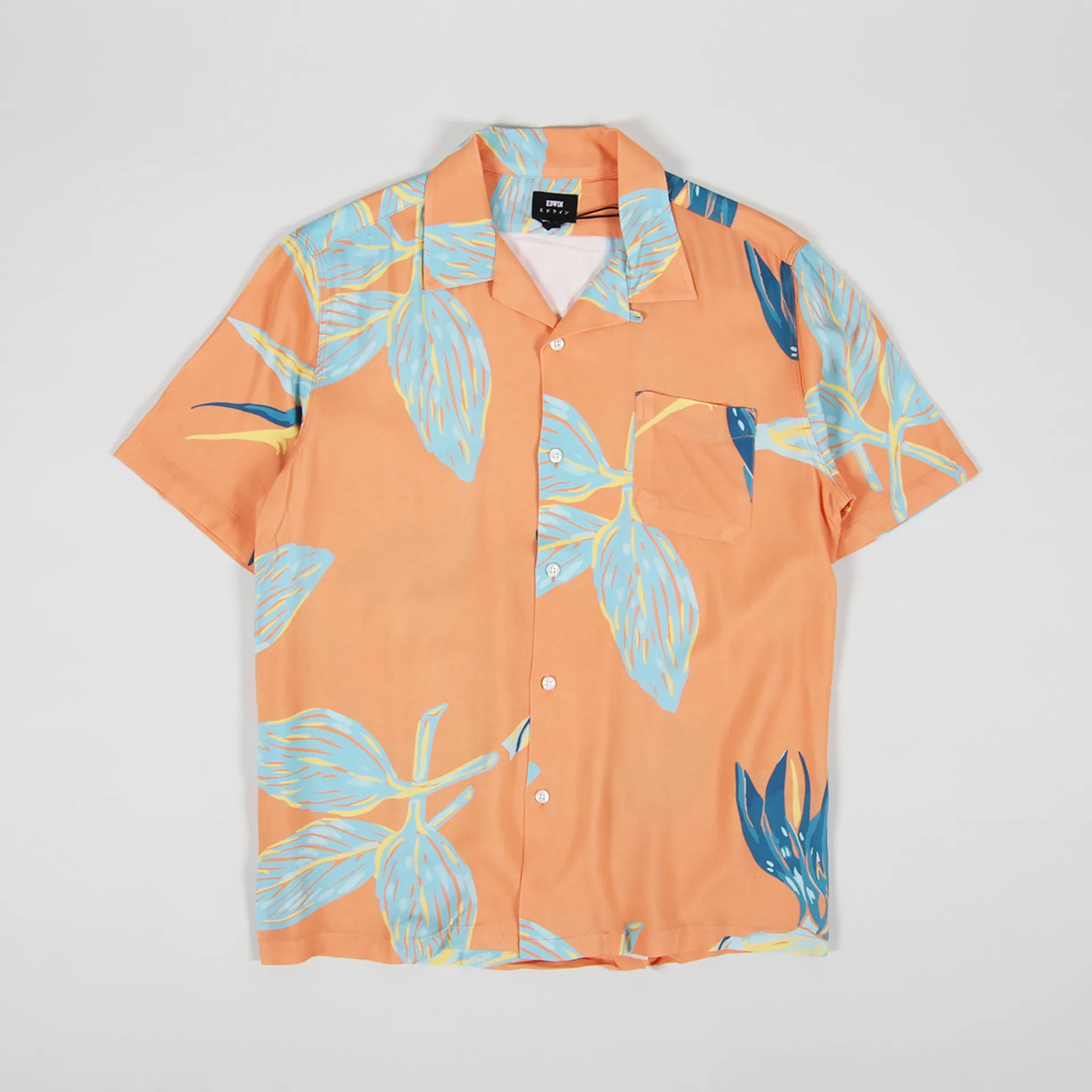 A short sleeve shirt from Edwin made from a lightweight and comfortable 100% viscose with a Bird Of Paradise graphic design and a single chest pocket.