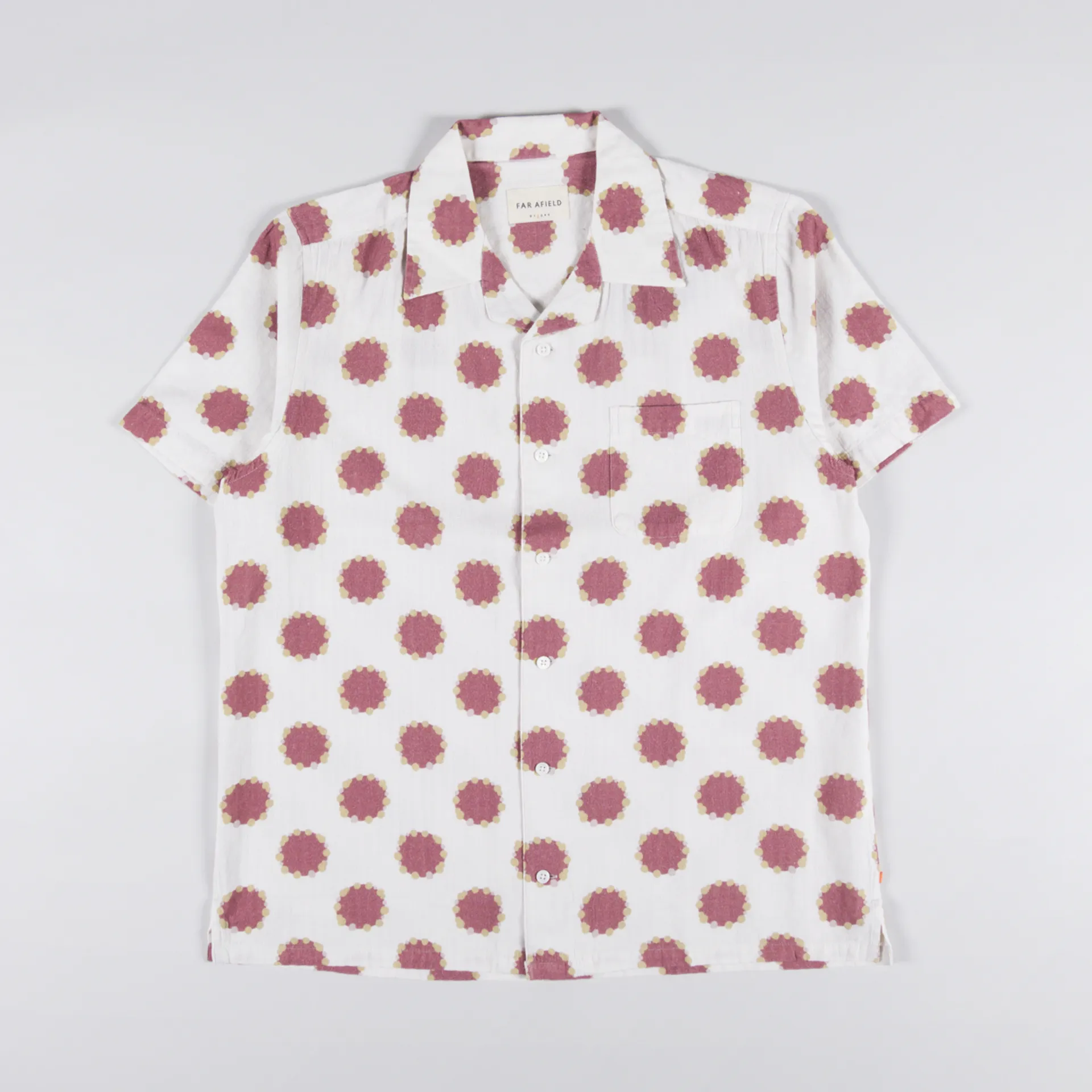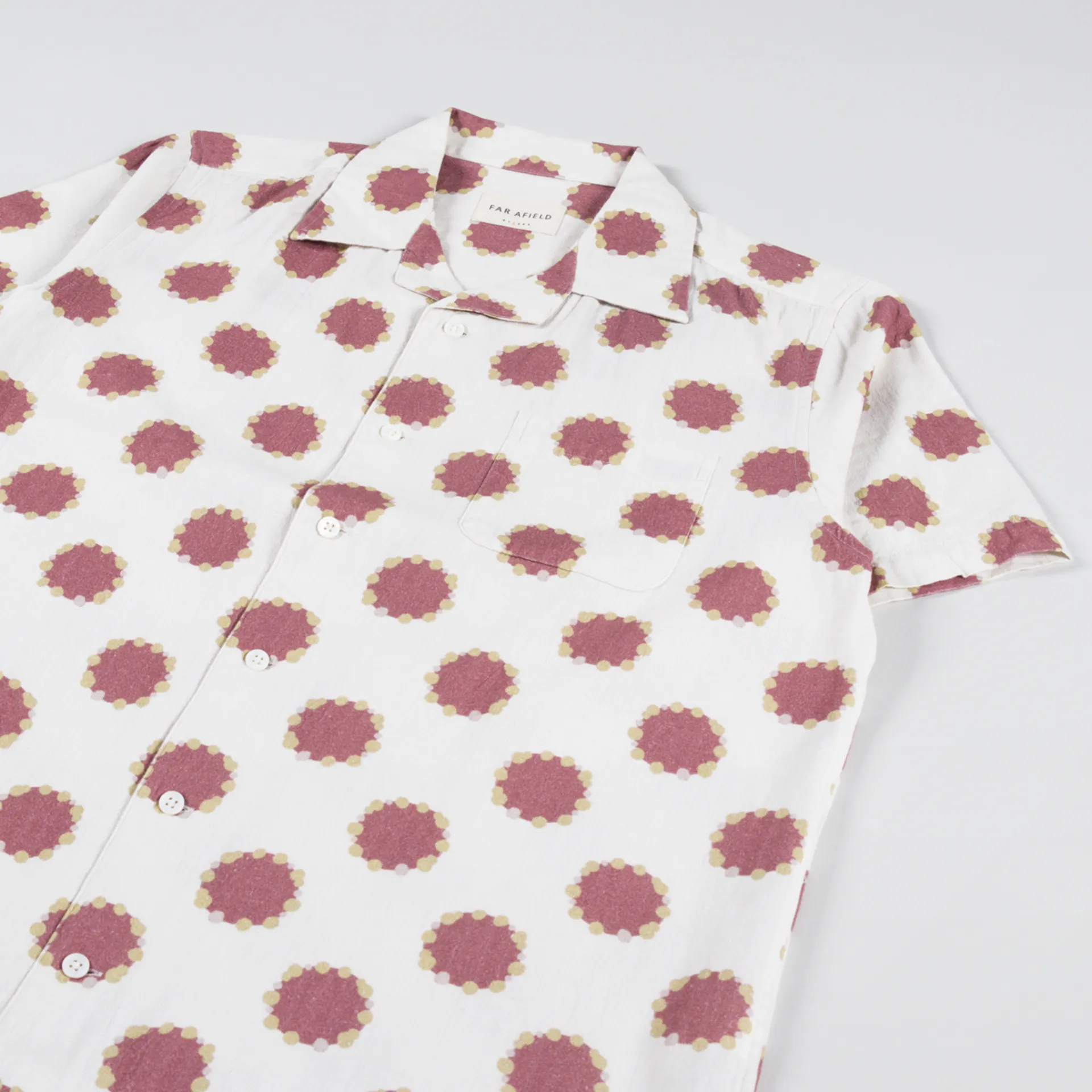 A short sleeve shirt from Far Afield, made from a comfortable woven canvas of 100% Better Cotton Initiative, with a buttoned front, camp collar, chest pocket and a jacquard Spotlight design.