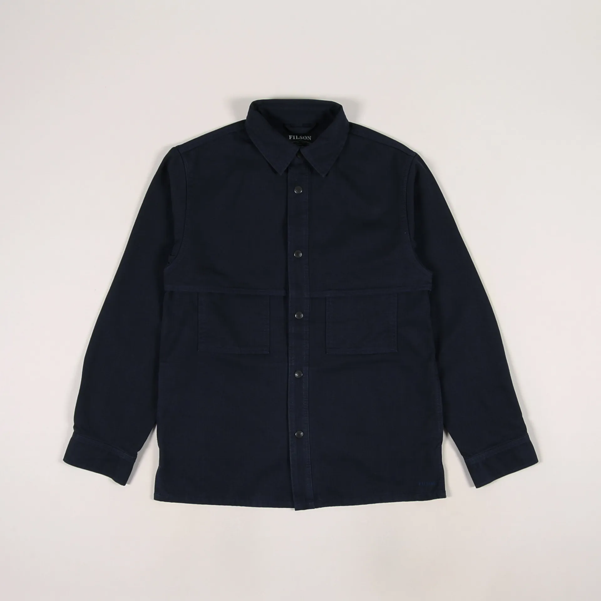 A long sleeve overshirt from USA outdoor brand Filson made from a comfortable yet durable herringbone weave of 100% cotton with a snap-up front and cuffs. It has two patch pockets to the chest hidden by a yoke overlay, and it has subtle handwarmer pockets.