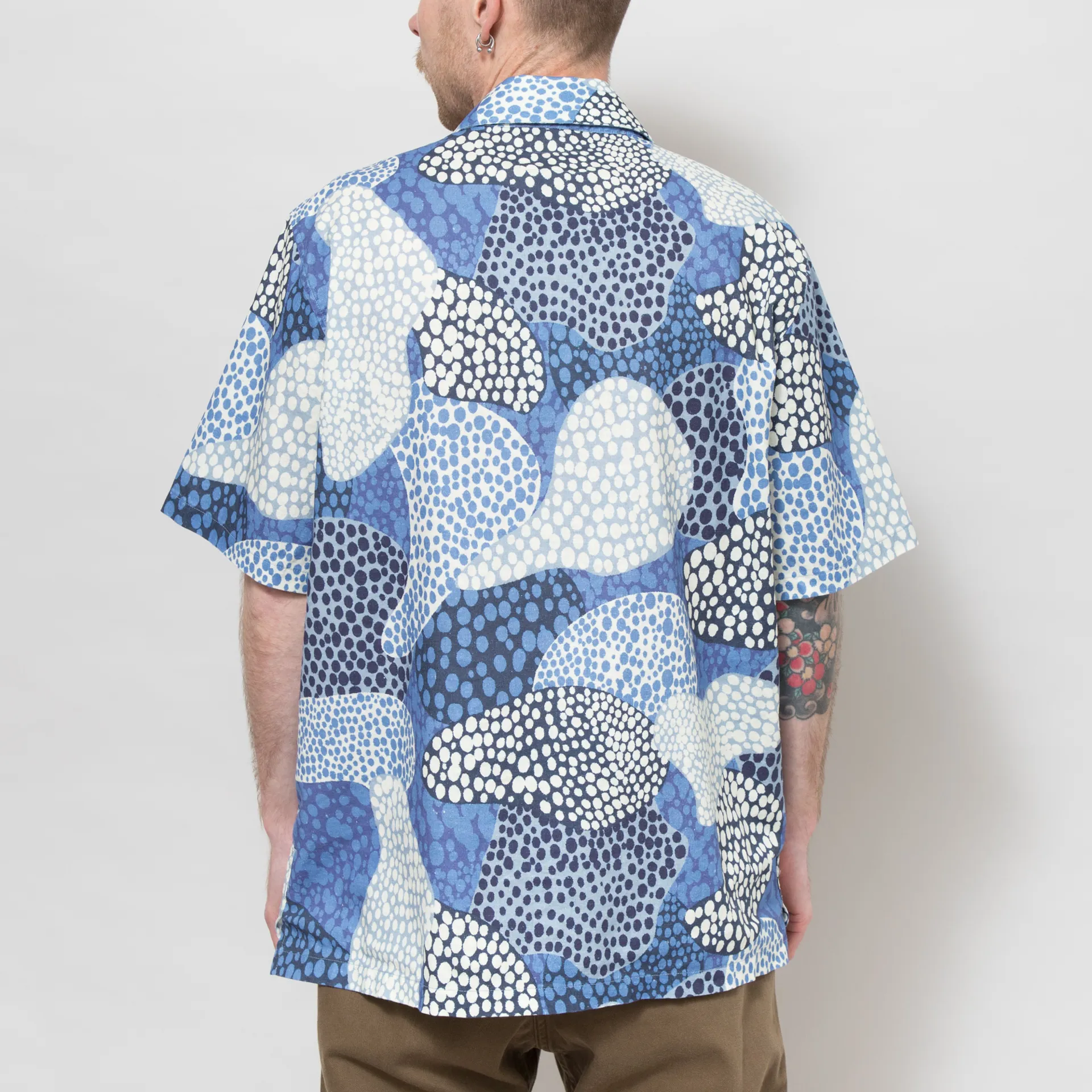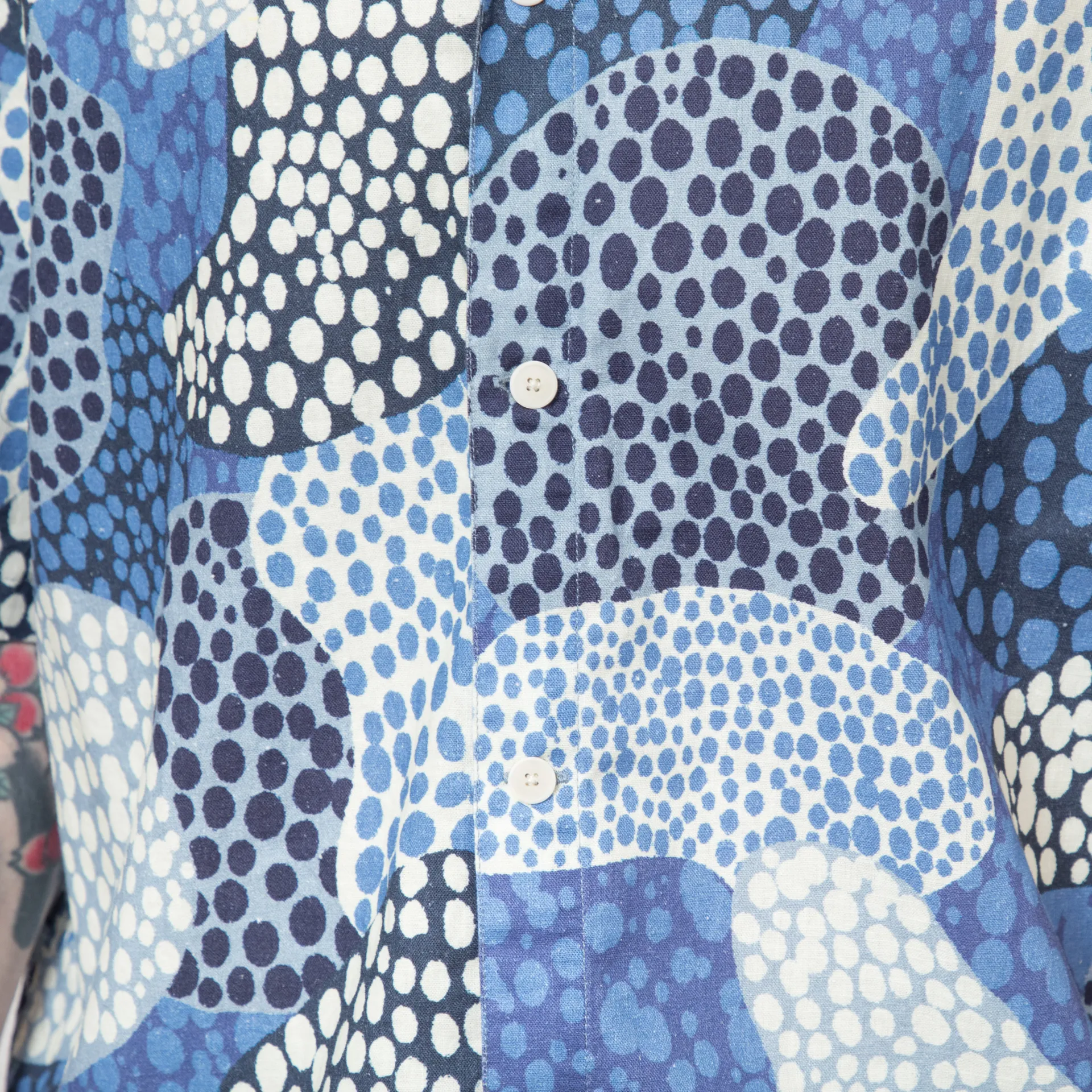 A lightweight summer shirt from Folk, cut in a relaxed fit for a casual silhouette and constructed from a breathable linen blend. It features an all-over bold dot print artwork by Folk, each shirt being unique, with a corozo nut button placket, a half moon stand collar and a single pocket at the chest. Finished with the signature Folk tab at the side seam.