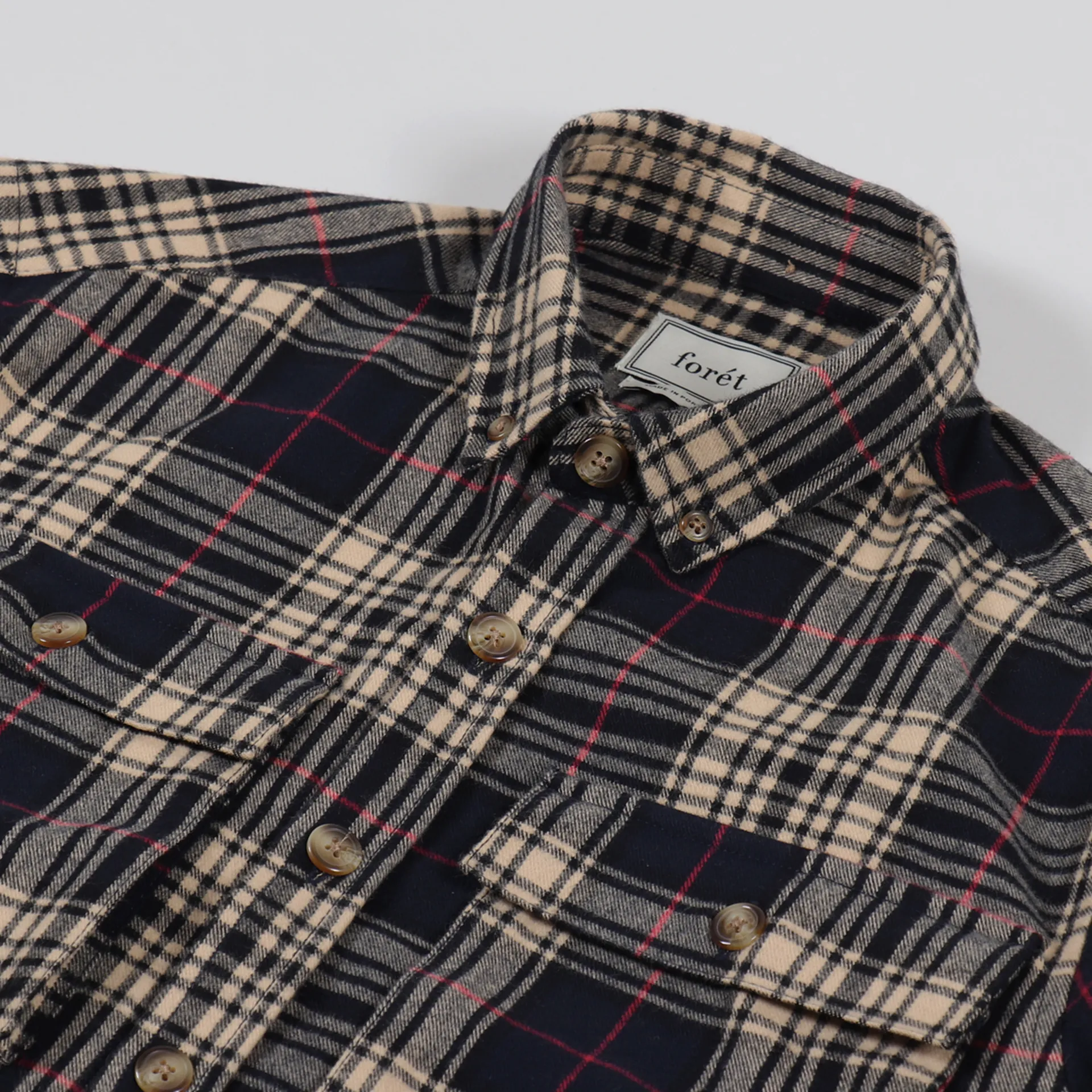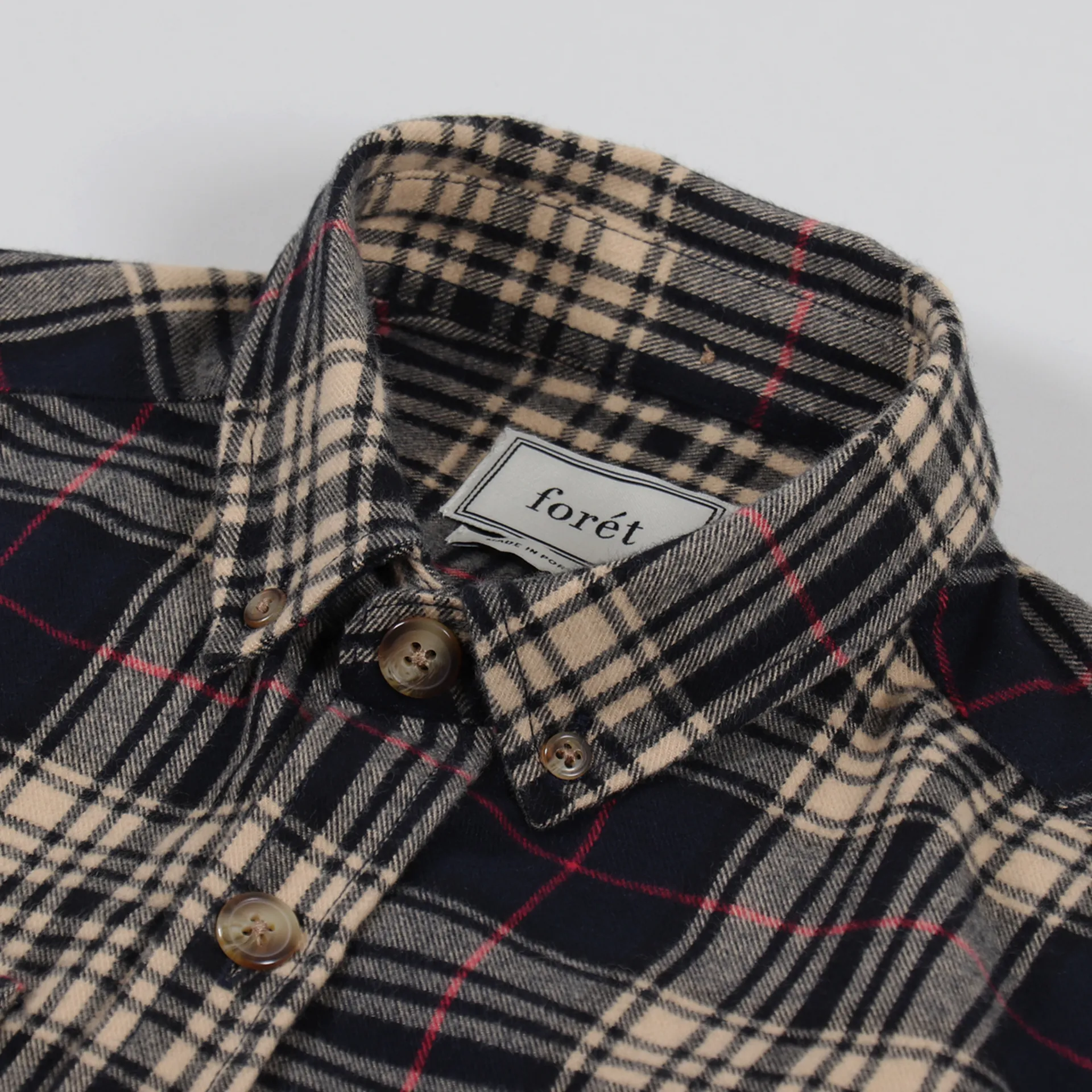 A long sleeve flannel shirt from Denmark's Foret, made from 100% cotton in a durable yet super soft brushed twill with a buttoned front, cuffs and chest pockets.