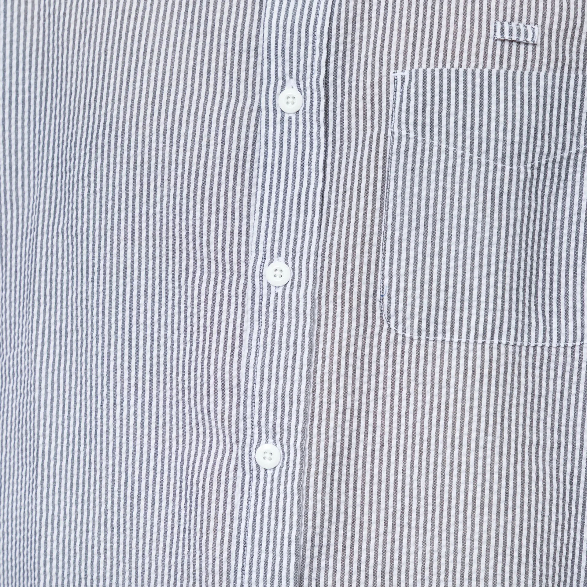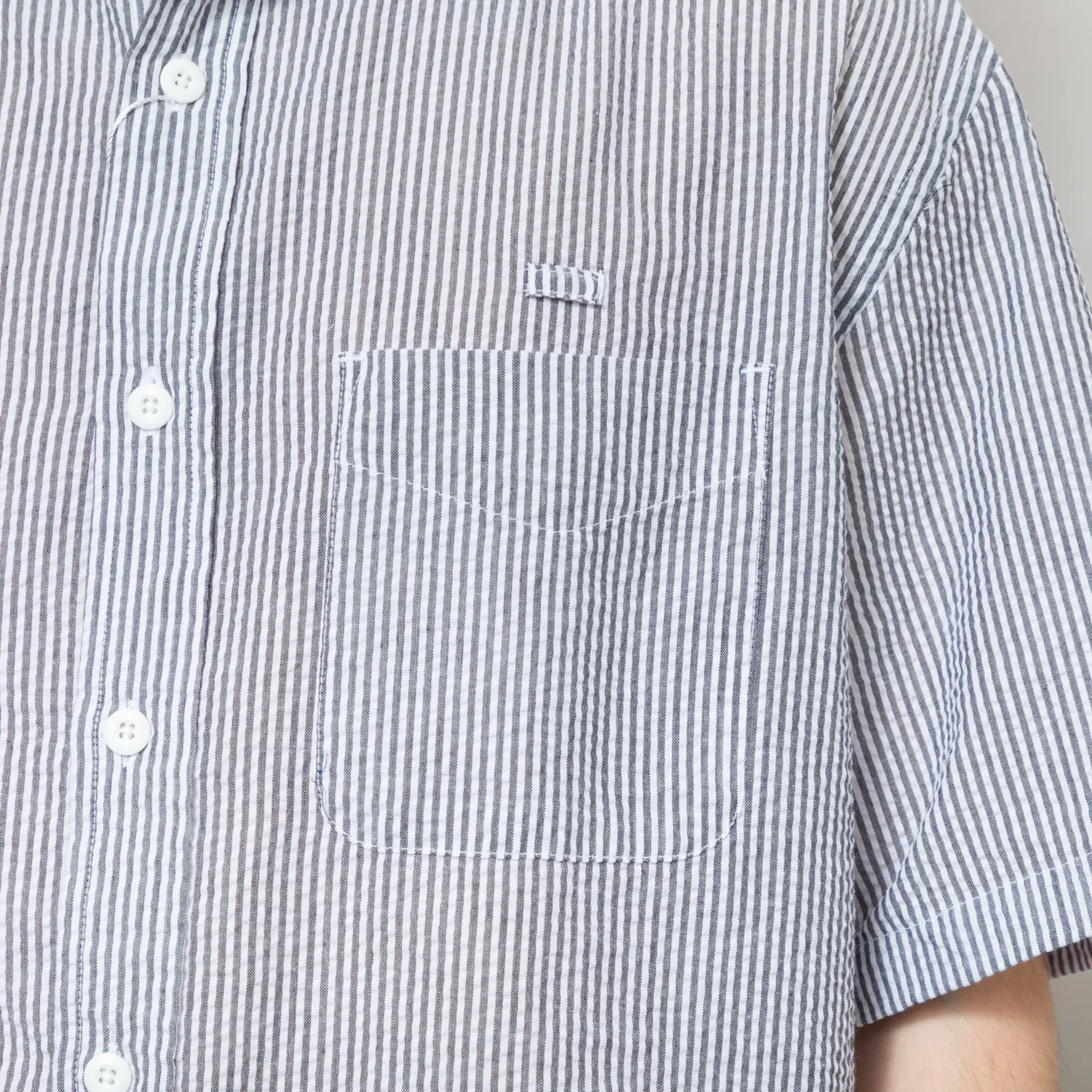 A striped shirt from Frizmworks, cut in a loose fit for a laidback silhouette and constructed from durable cotton seersucker fabric. It features a full button-through front with a classic collar, a curved hem, and a back box pleat for added structure. The design is complete with slightly oversized half sleeves and a single patch pocket at the chest.