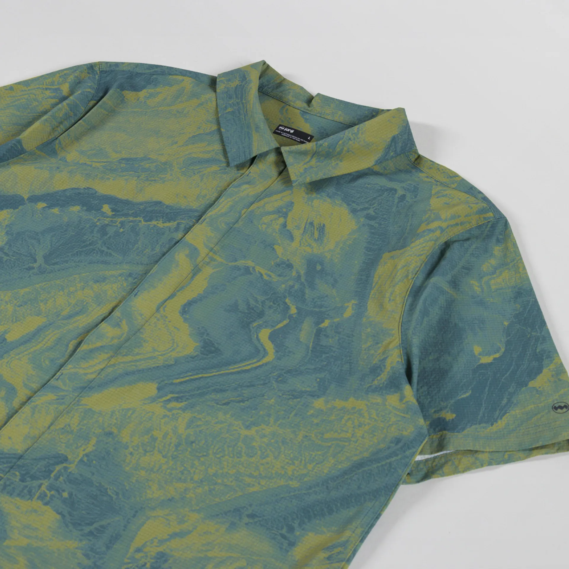 A lightweight shirt from Janji, constructed from quick-drying, breathable stretch fabric with an all-over print.