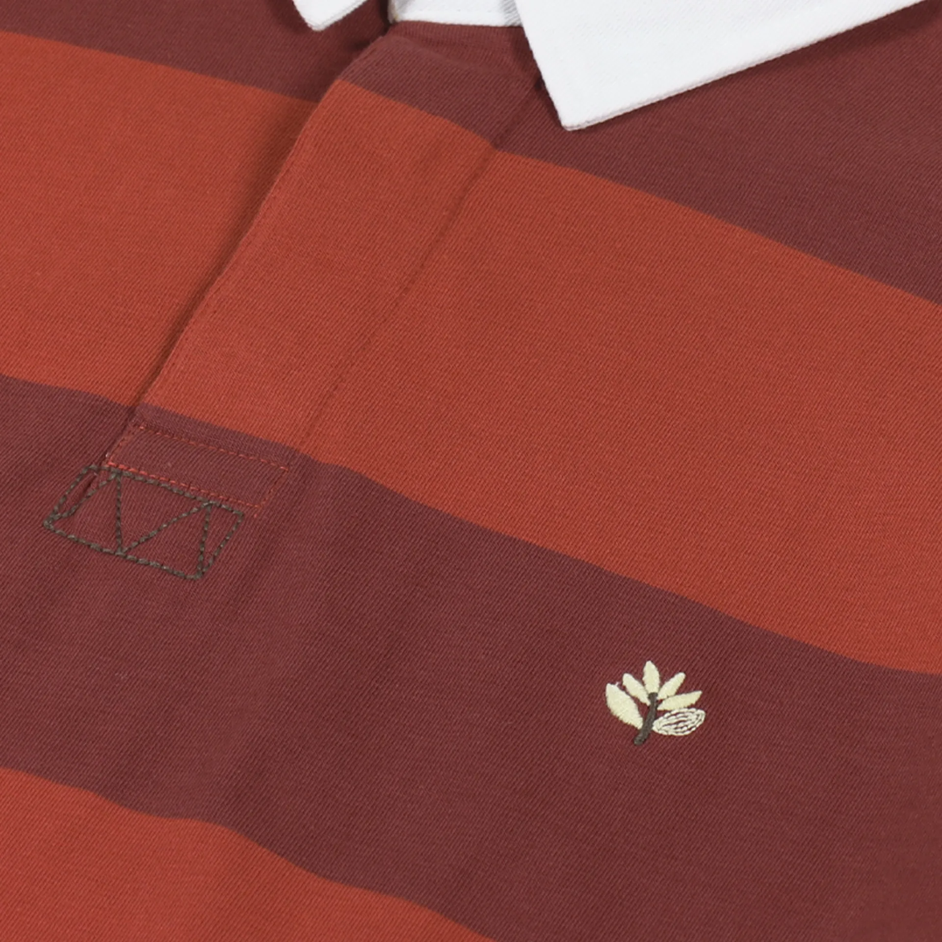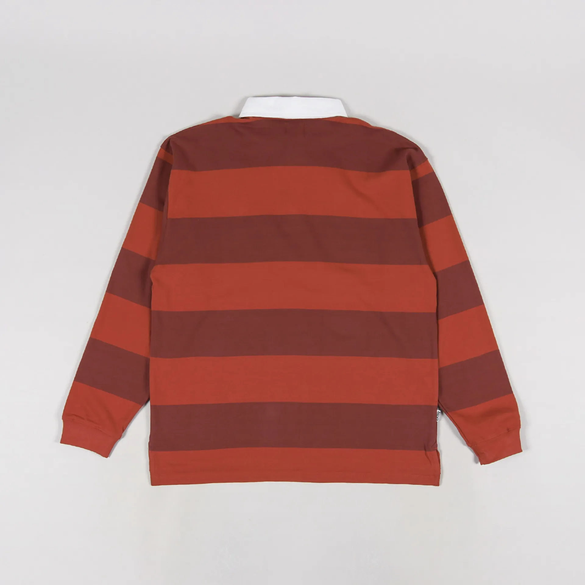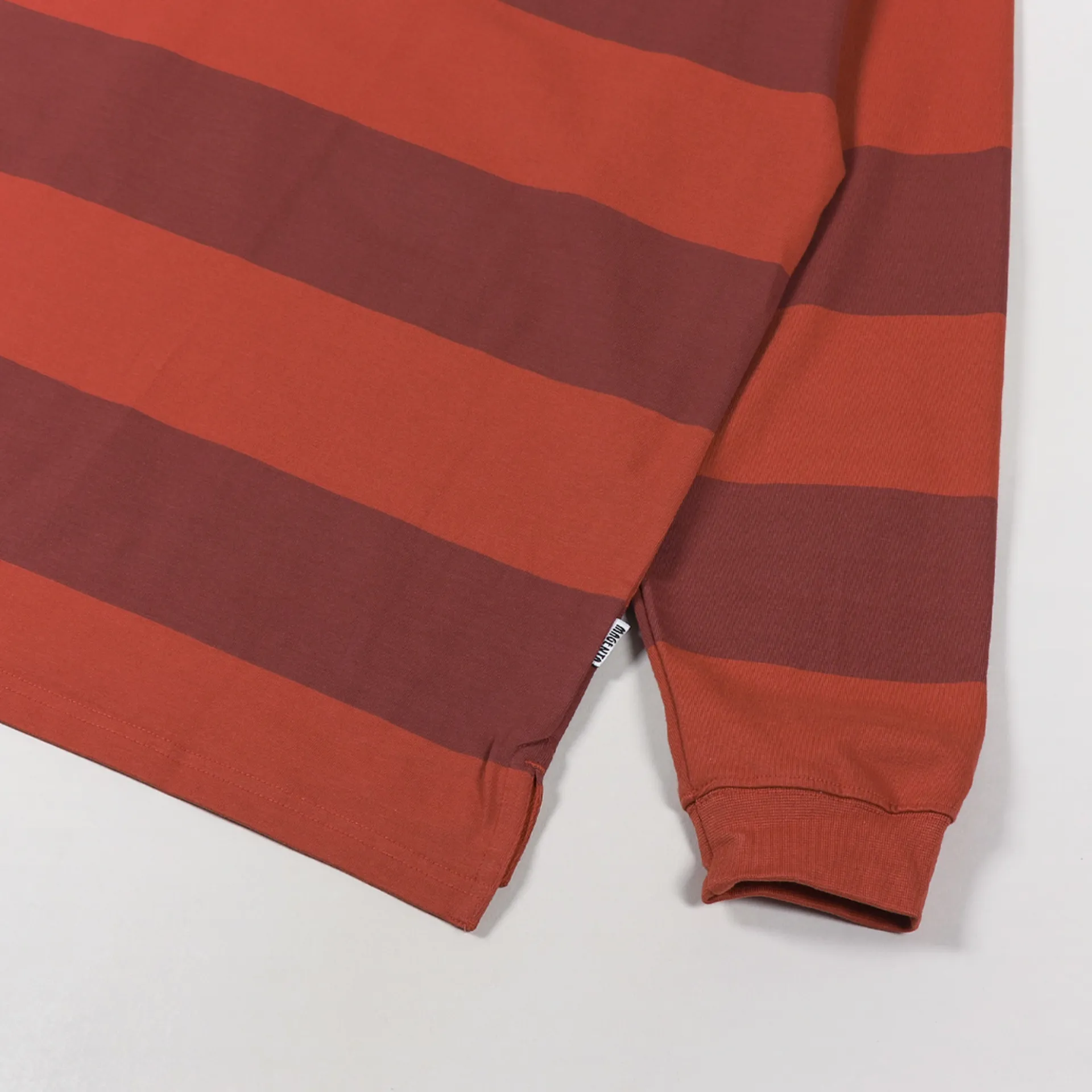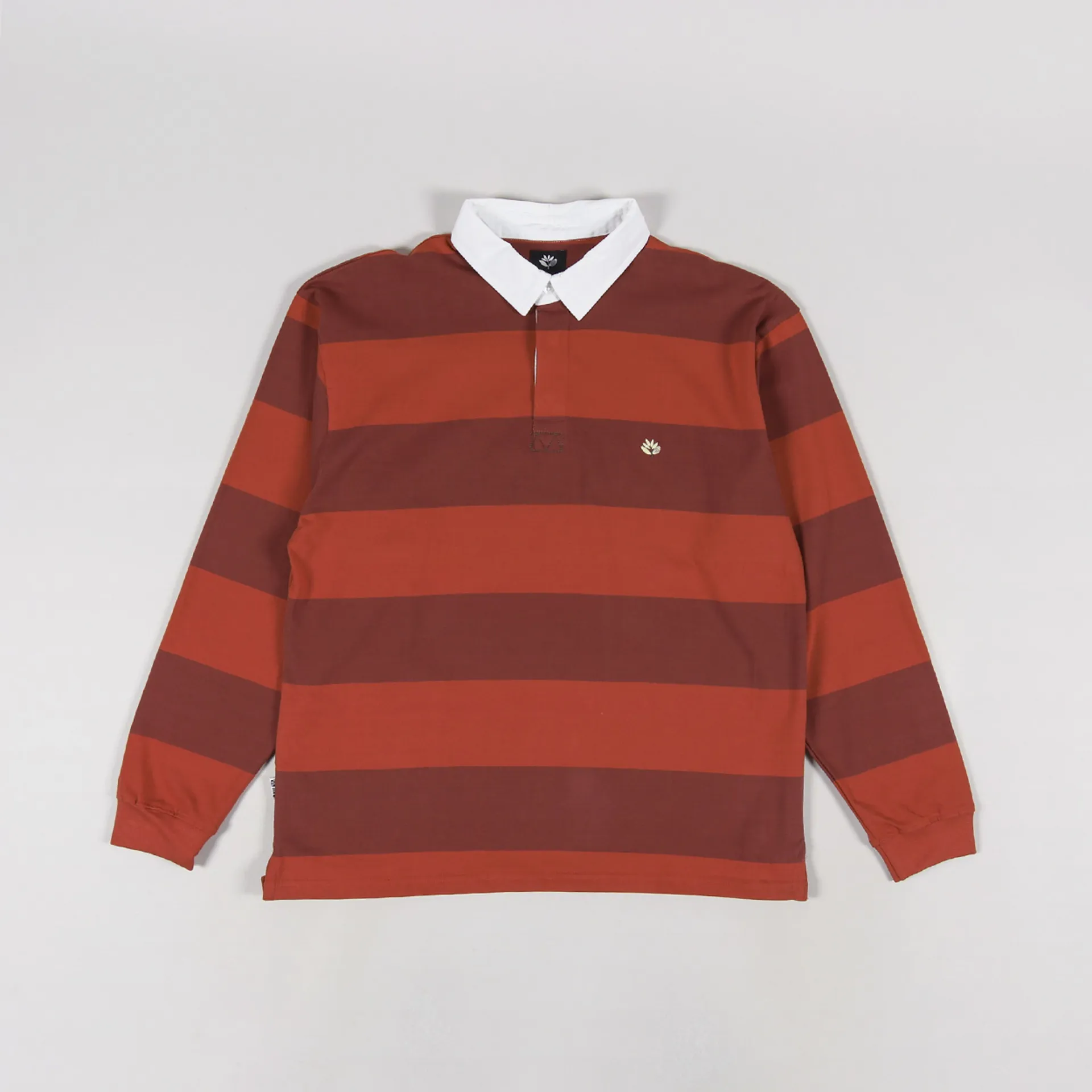 A long sleeve rugby shirt from Magenta Skateboards made from a comfortable jersey of 100% cotton with a buttoned neck and twill collar, ribbed cuffs, a striped pattern and an embroidered logo to the chest.