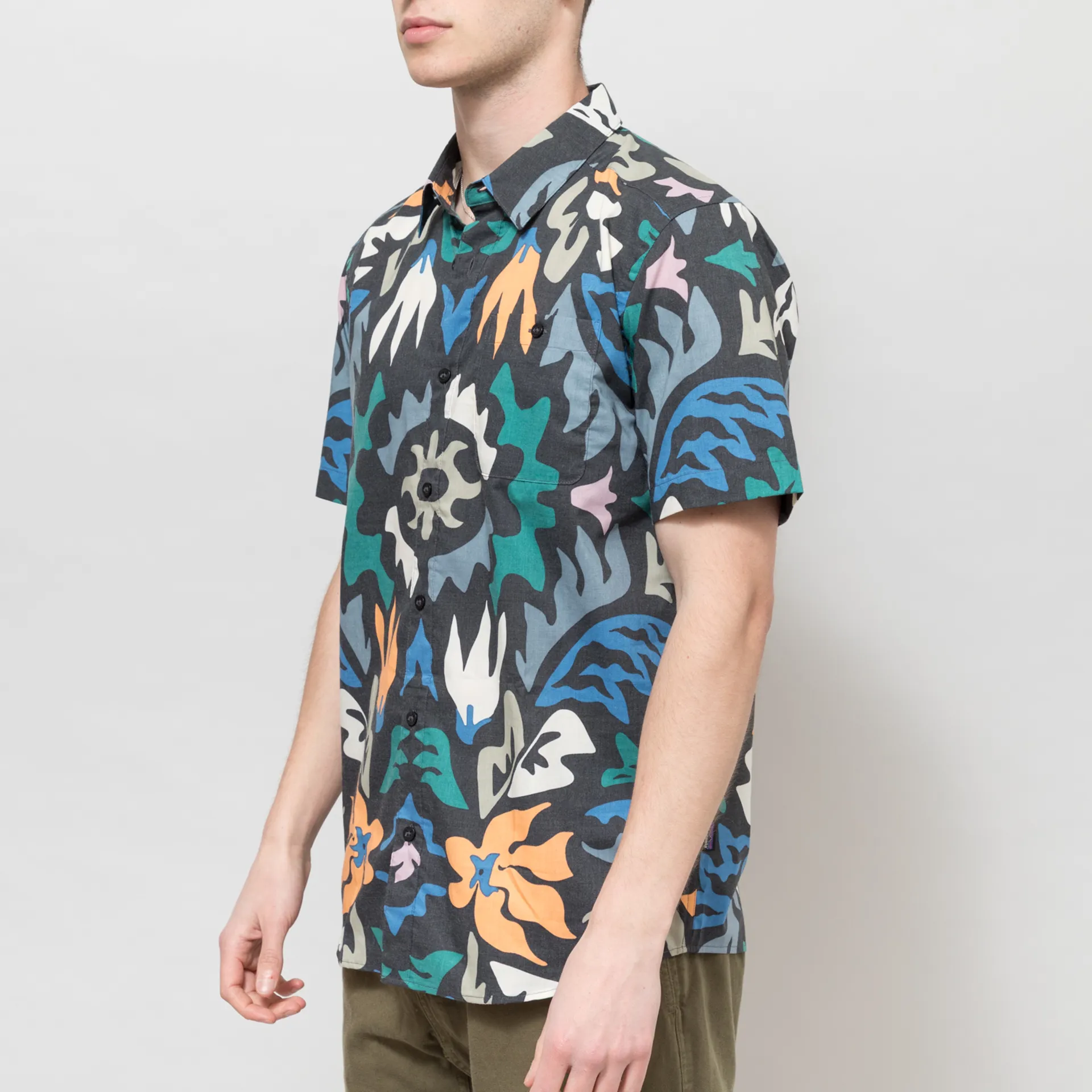 A short sleeve shirt from Patagonia made from a blend of organic cotton and recycled polyester with a buttoned chest pocket and a woven logo tag to the side.