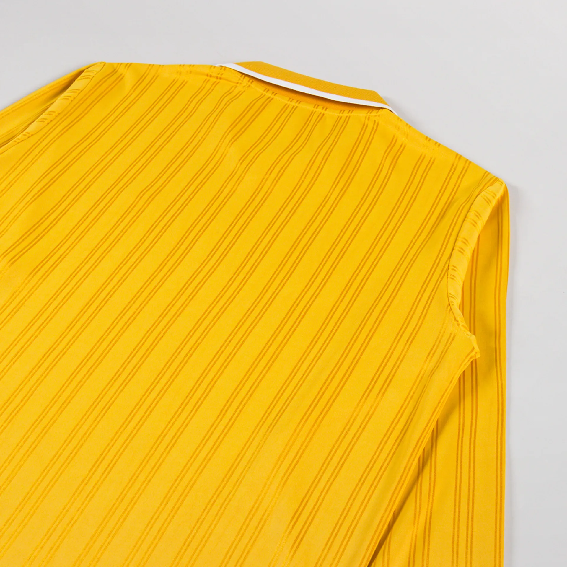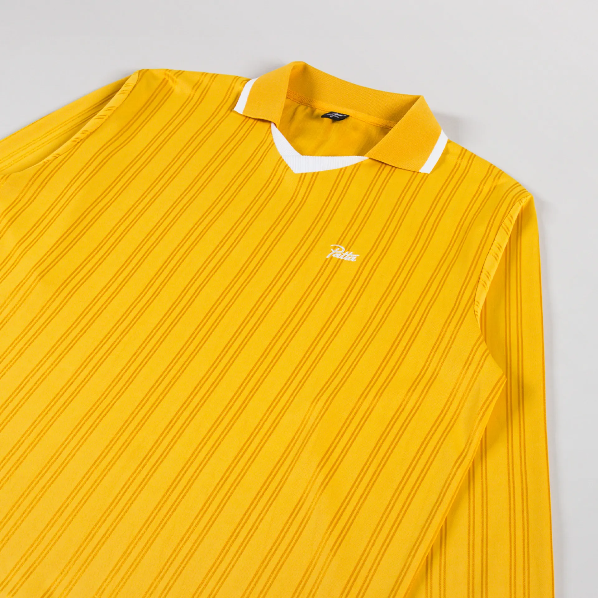 A long-sleeve jersey from Patta, inspired by vintage football aesthetics and cut in a slightly relaxed fit for a casual silhouette. It's constructed from midweight polyester, with an intricate jacquard stripe pattern throughout. Featuring a classic collar and ribbed cuffs, both with subtle tipping, then finished with an embroidered Patta logo at the chest, nice and simple.