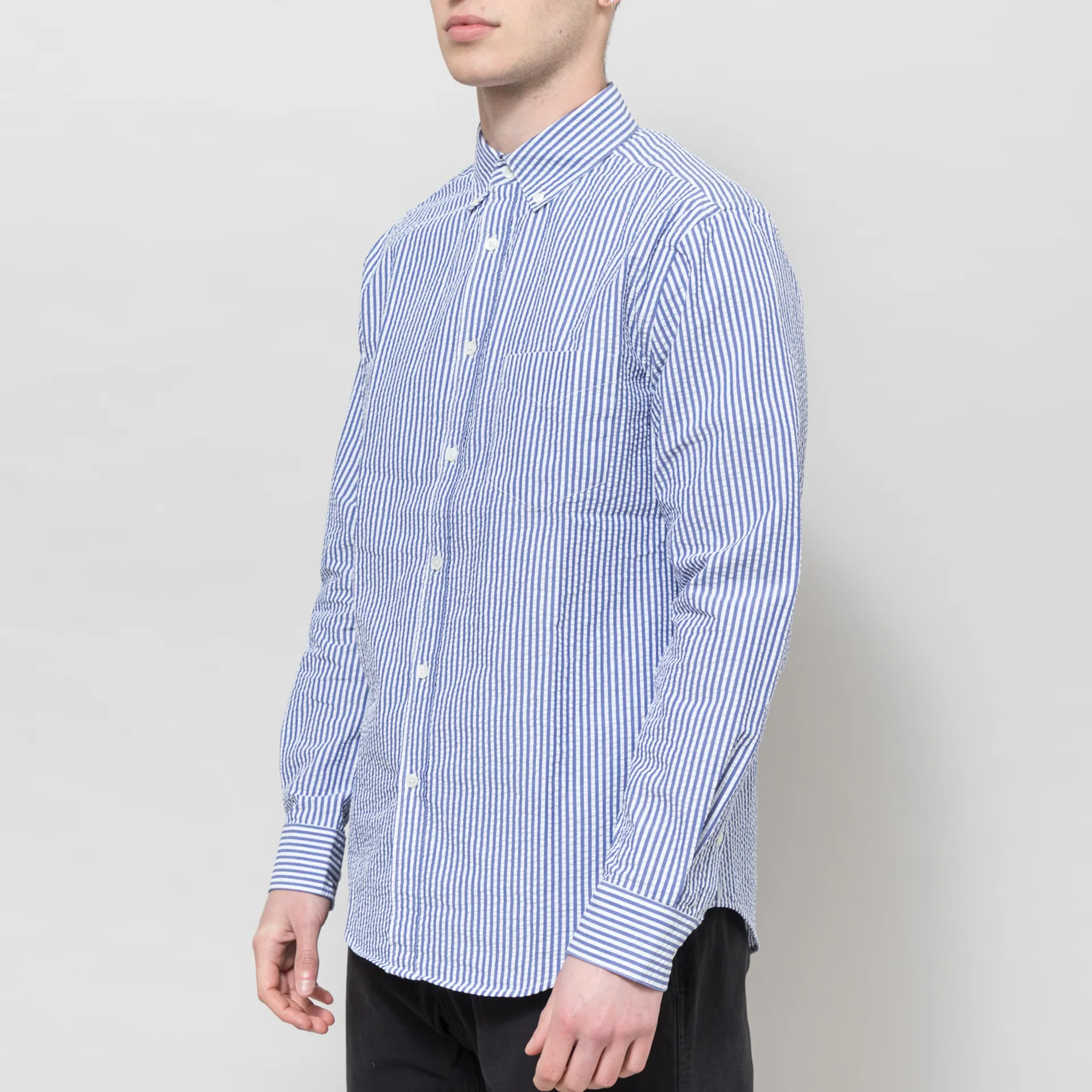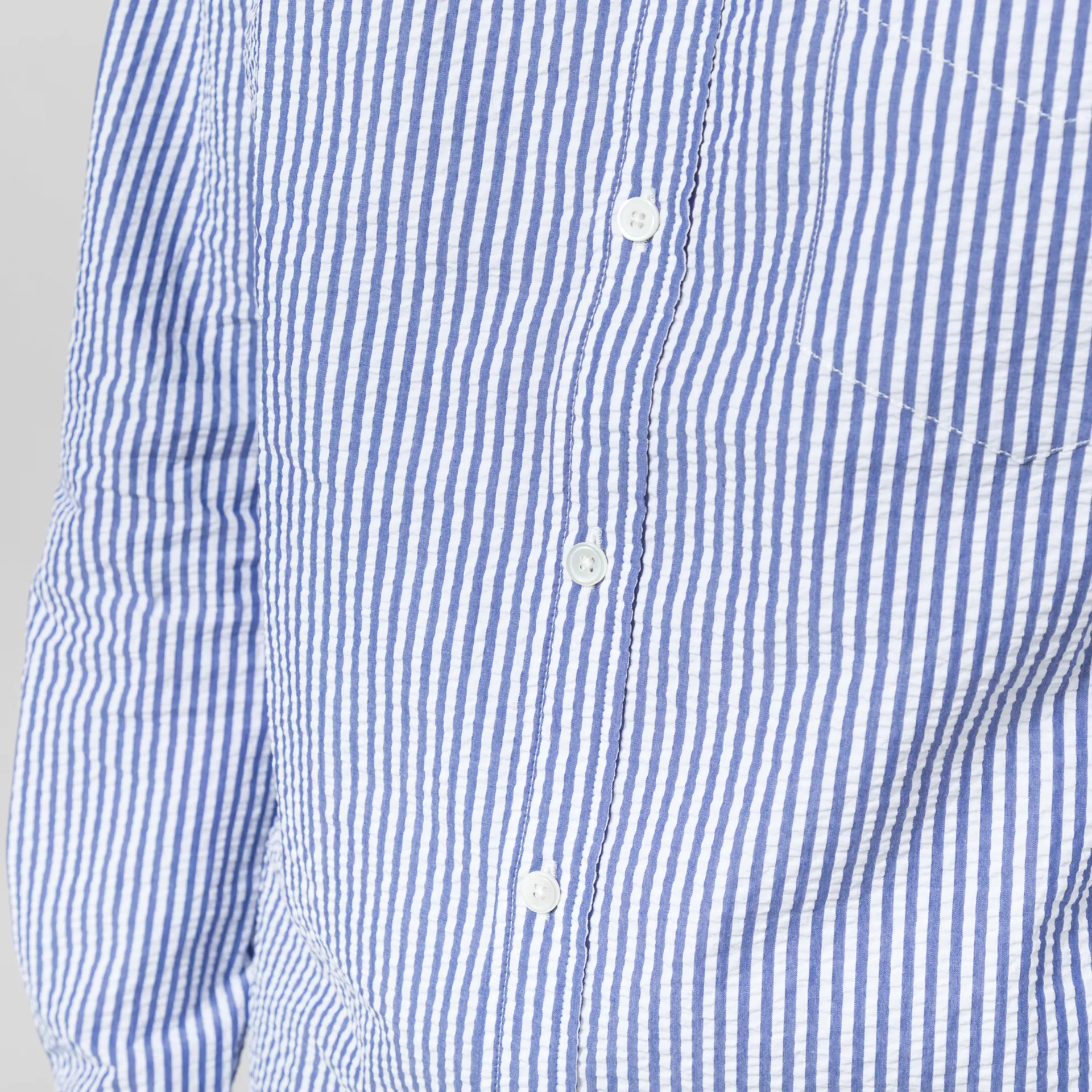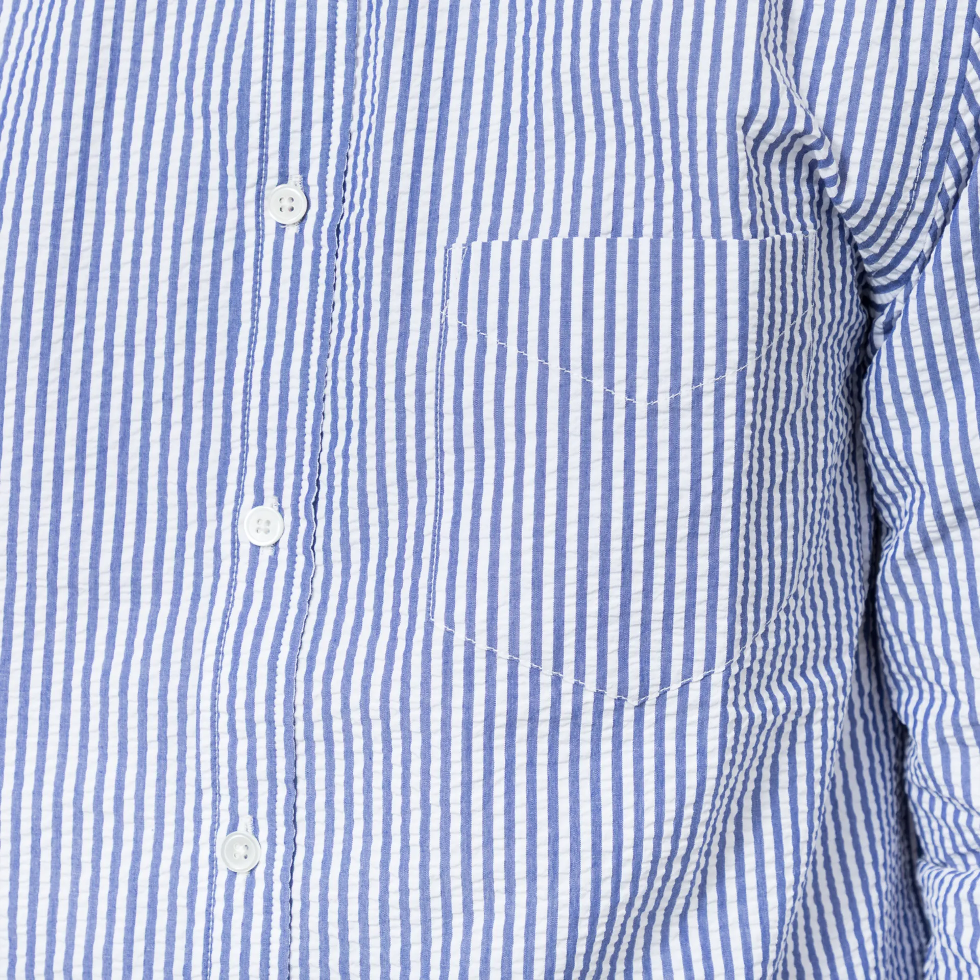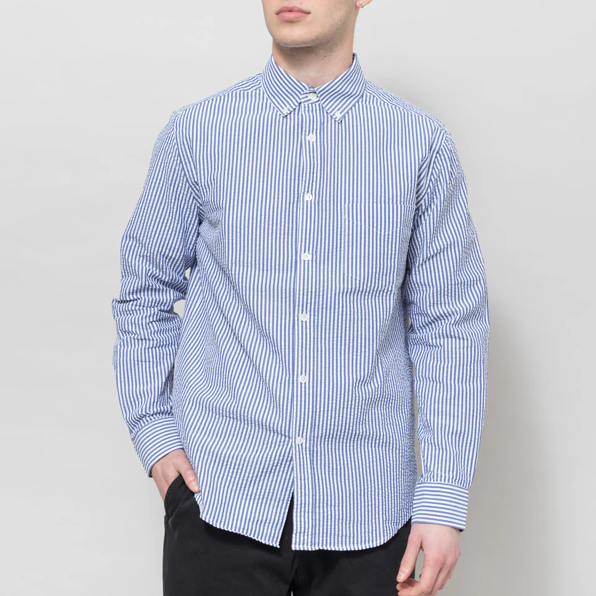 The Atantico Stripe Shirt from Portuguese Flannel is cut in a regular fit for everyday comfort, crafted from lightweight and airy cotton seersucker fabric. It has Shell of Mother Pearl buttons through the front, a button-down collar, curved hem and buttoned cuffs to adjust. Finished off with a back box pleat for added structure and a single pocket to the chest.