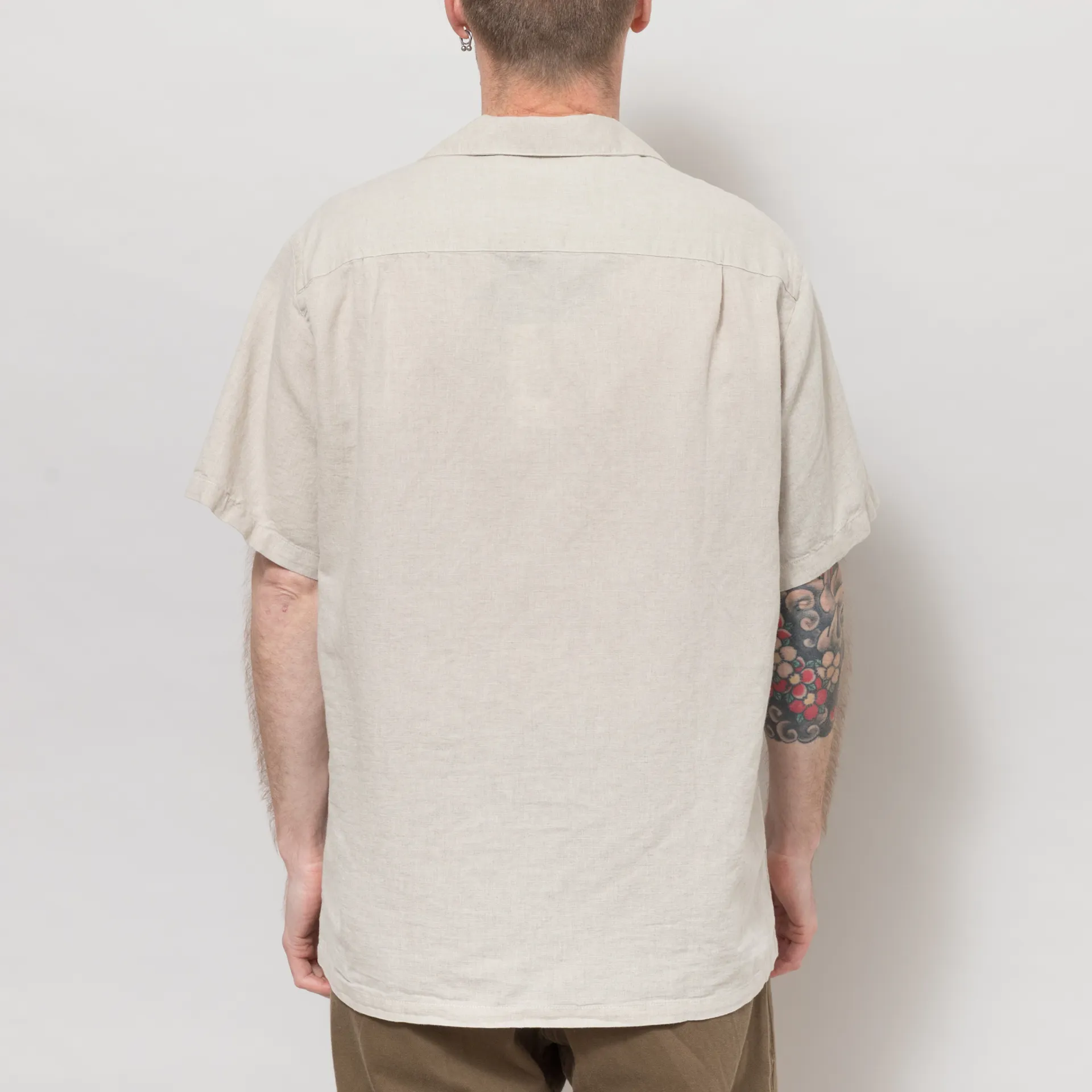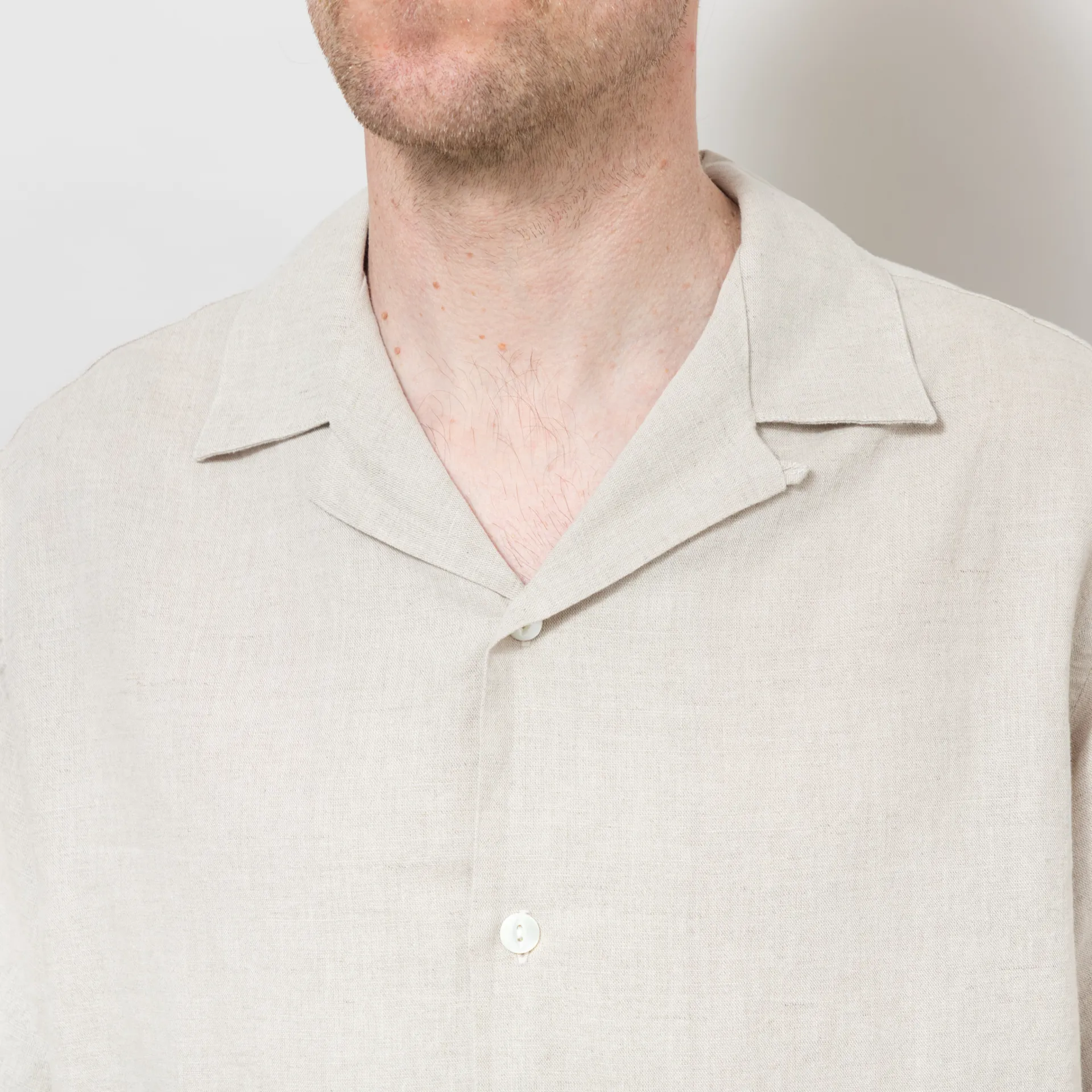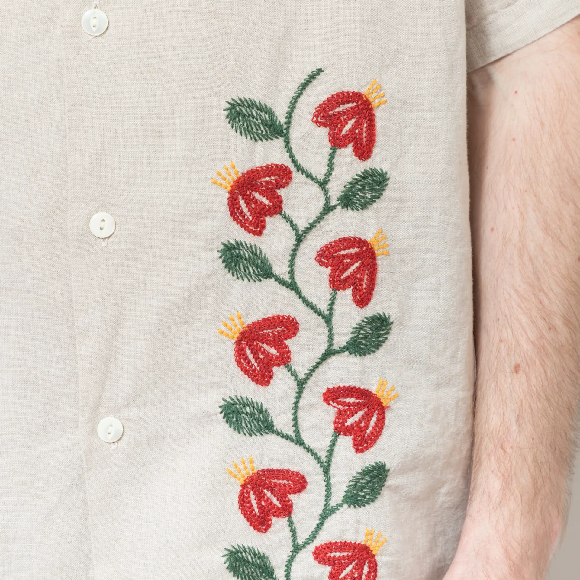 A short-sleeve shirt from Portuguese Flannel, constructed from a lightweight linen/cotton blend and cut in a regular fit for everyday comfort. Featuring shell of Mother Pearl buttons through the front, leading to a classic camp collar, with a straight hem and embroidered details across the front.