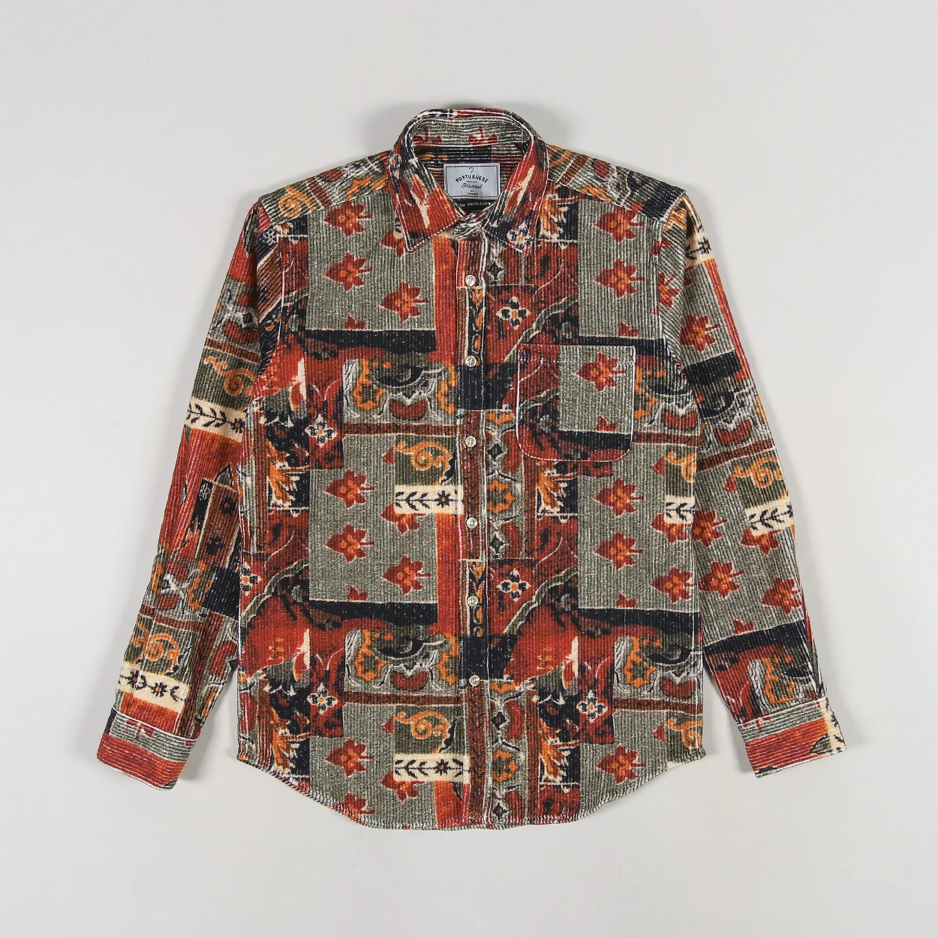 This shirt is made from an 8 wale corduroy fabric, made from a midweight 100% cotton. It has a buttoned front and cuffs using Urea buttons, and it features a single chest pocket to the left. It features a graphic AOP design.