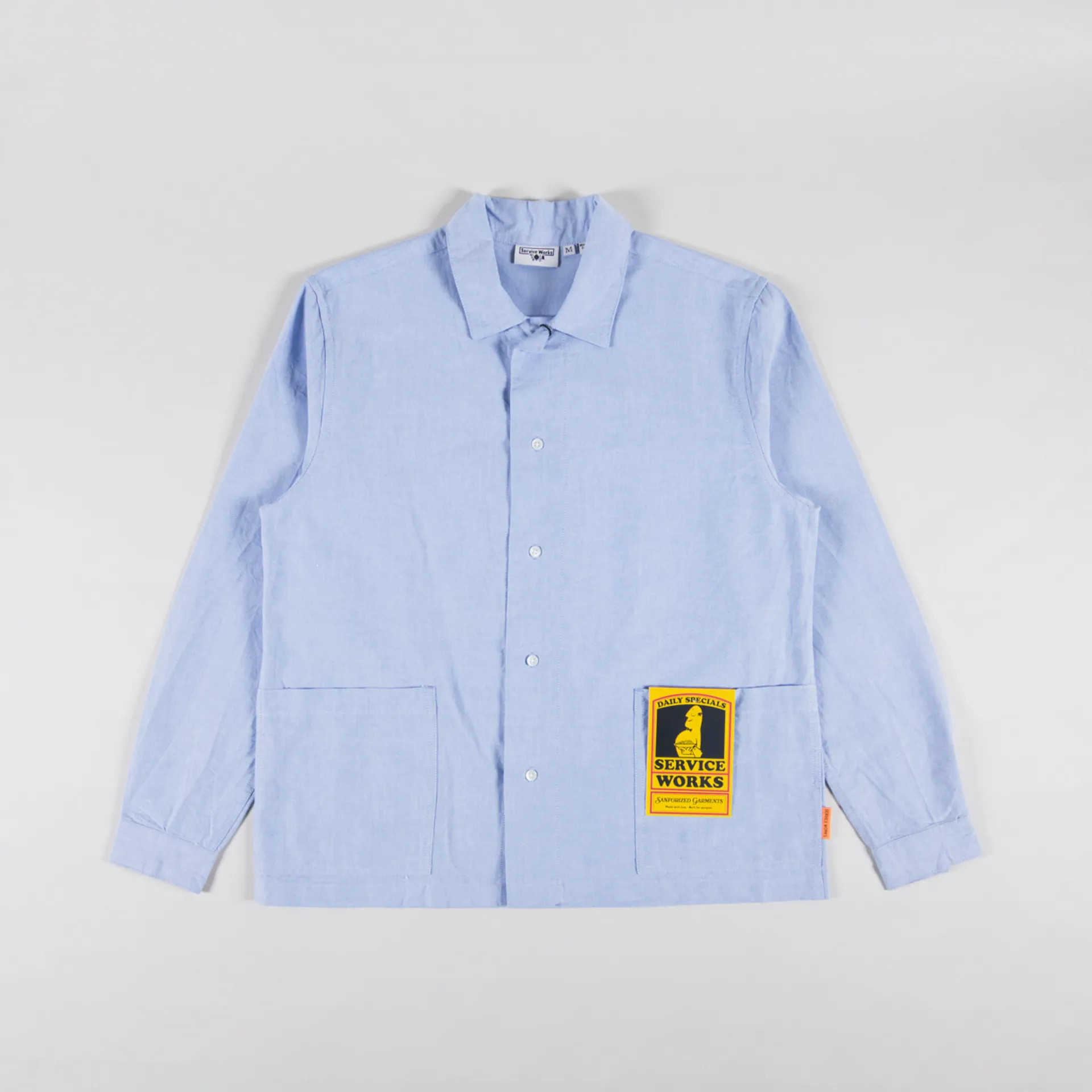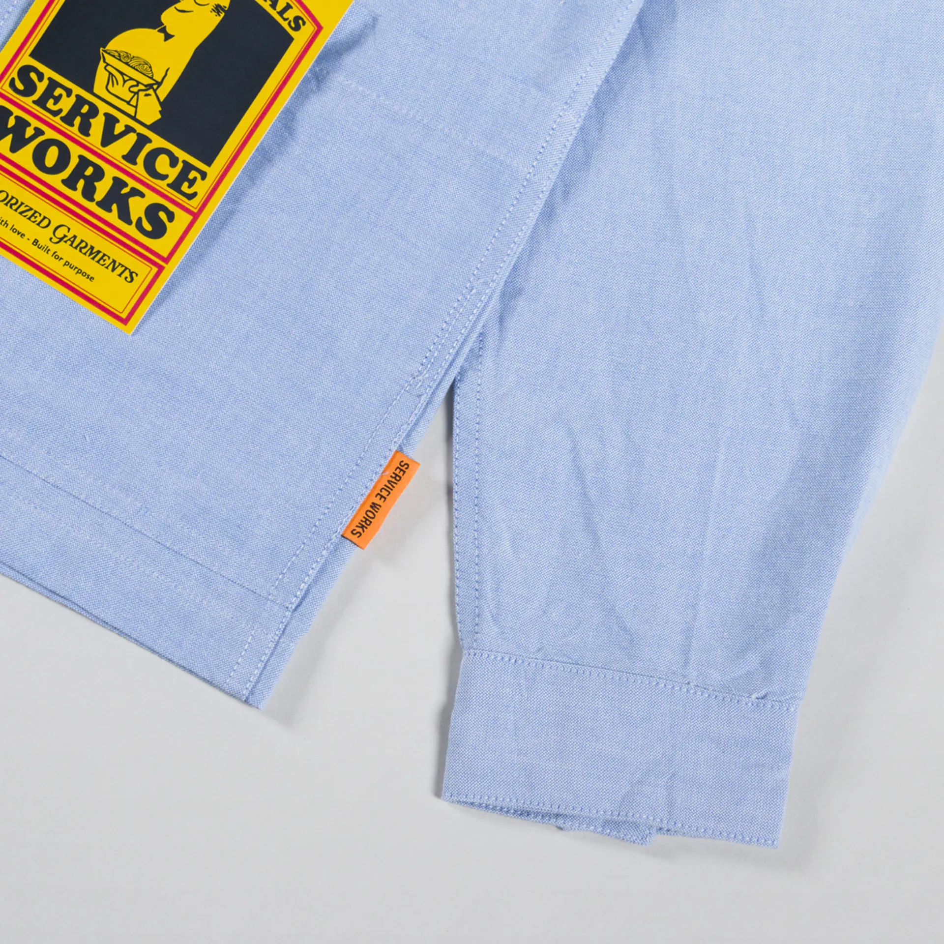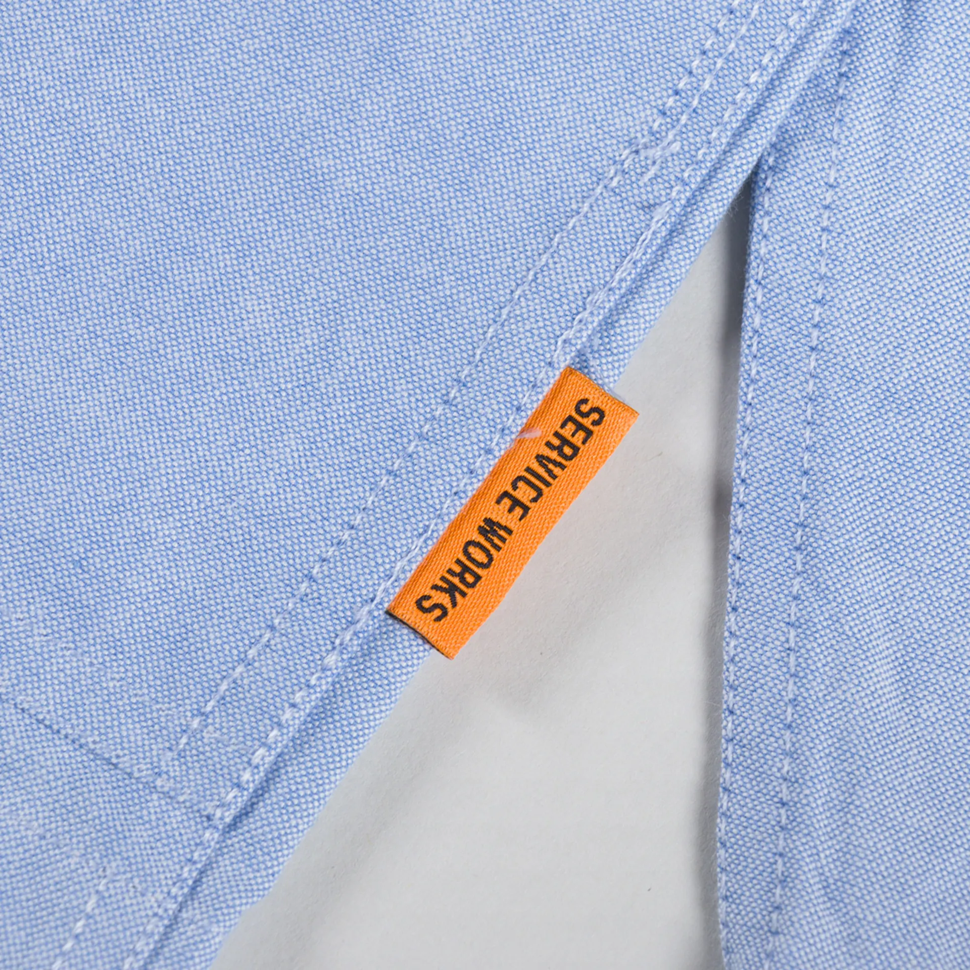 A long sleeve waiters shirt from Service Works, cut in a regular fit for everyday wear and constructed from 165gsm GOTS-certified organic cotton. It features a wide, buttoned placket, leading to a classic flat collar, with a straight hem and buttoned cuffs. The design is complete with two seam-mounted pockets, a back box pleat for structure and a Service Works flag label at the side seam.
