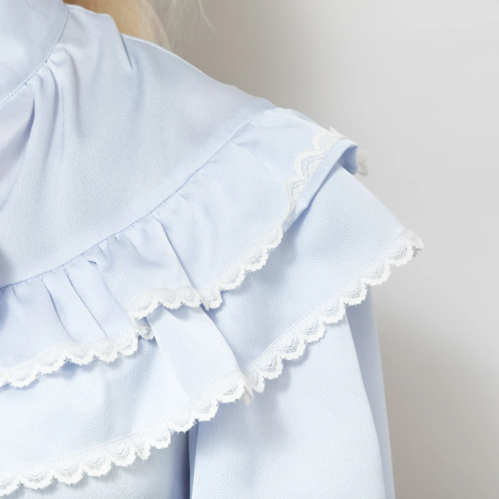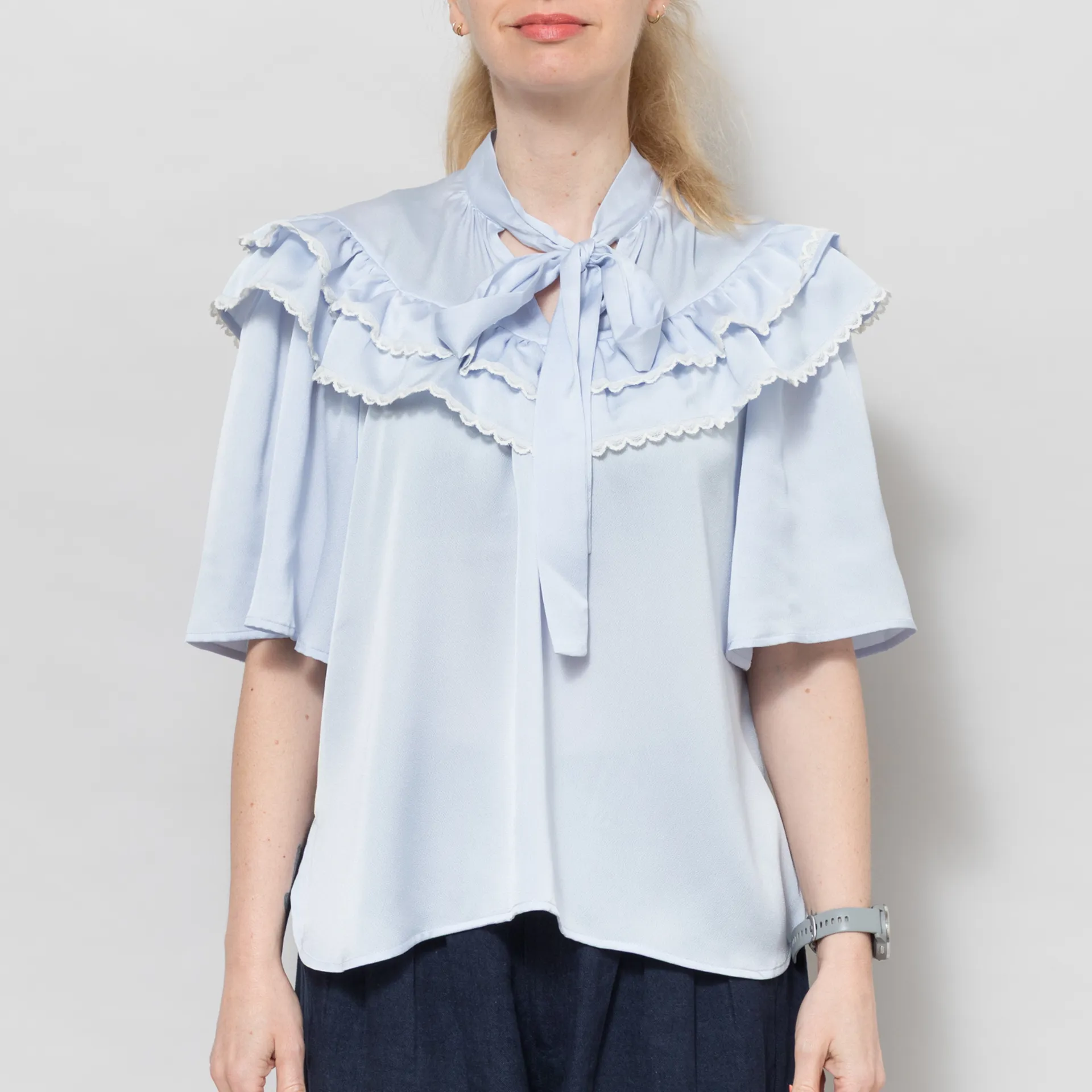 A blouse from Stella Nova, cut in a loose fit for a casual silhouette and crafted from lightweight recycled polyester. It has decorative ruffles across the shoulders and back, a tie closure at the front and short, loose sleeves to finish.
