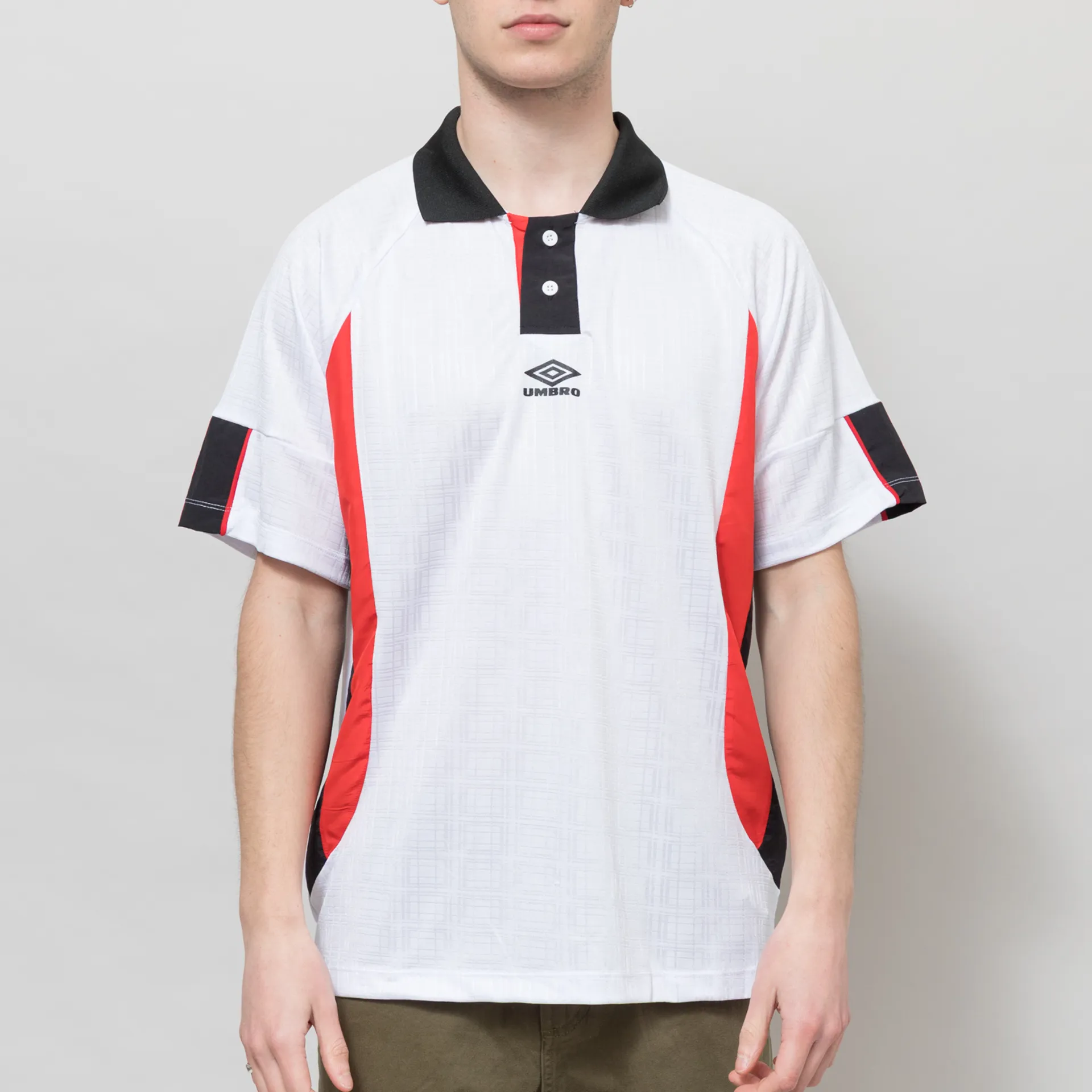 A football shirt from Umbro, cut in a boxy fit for a casual silhouette and constructed from breathable nylon taslan with an all-over shiny check pattern. It features a two-button placket leading to a classic flat collar. With contrast panel details and a small Umbro logo to the centre of the chest.