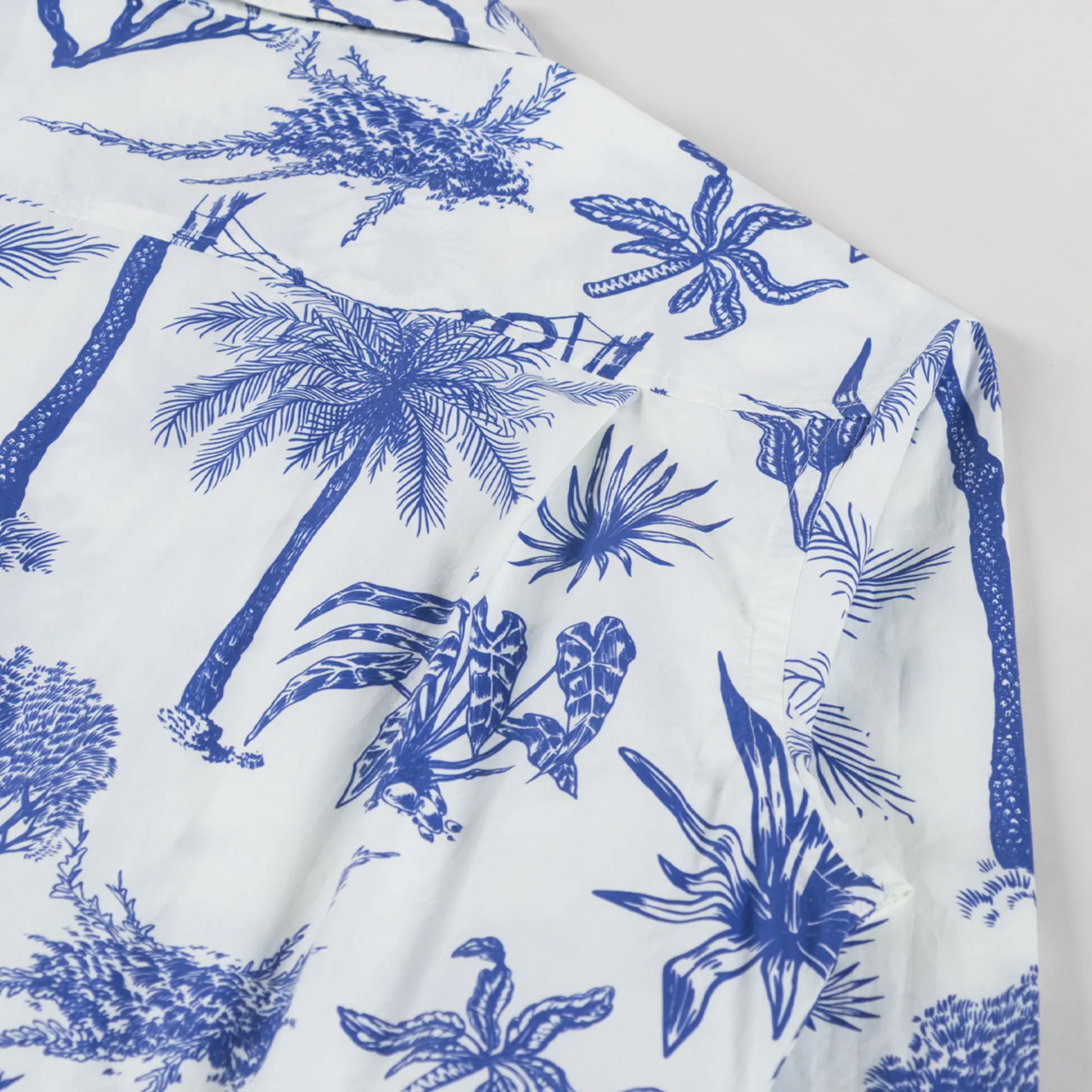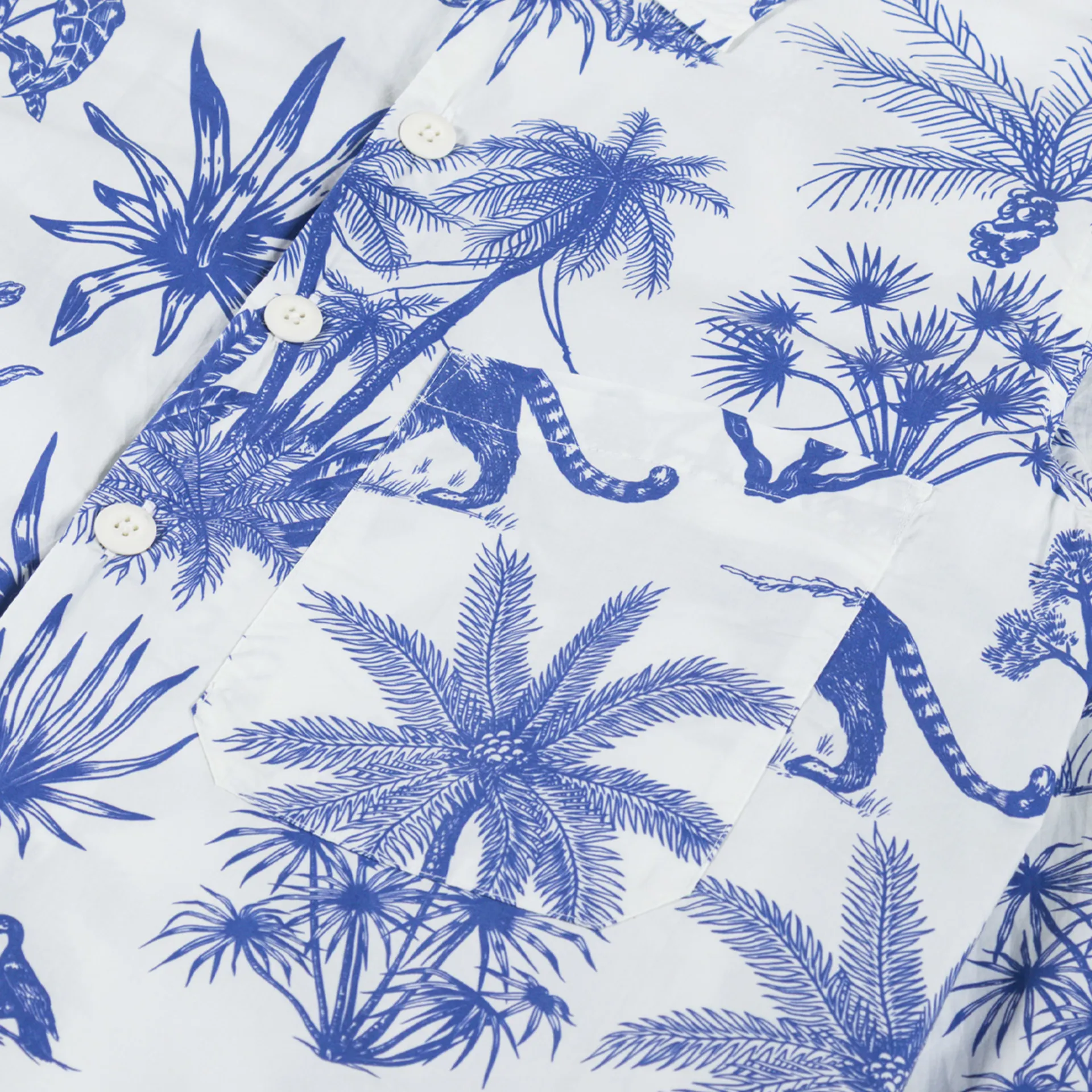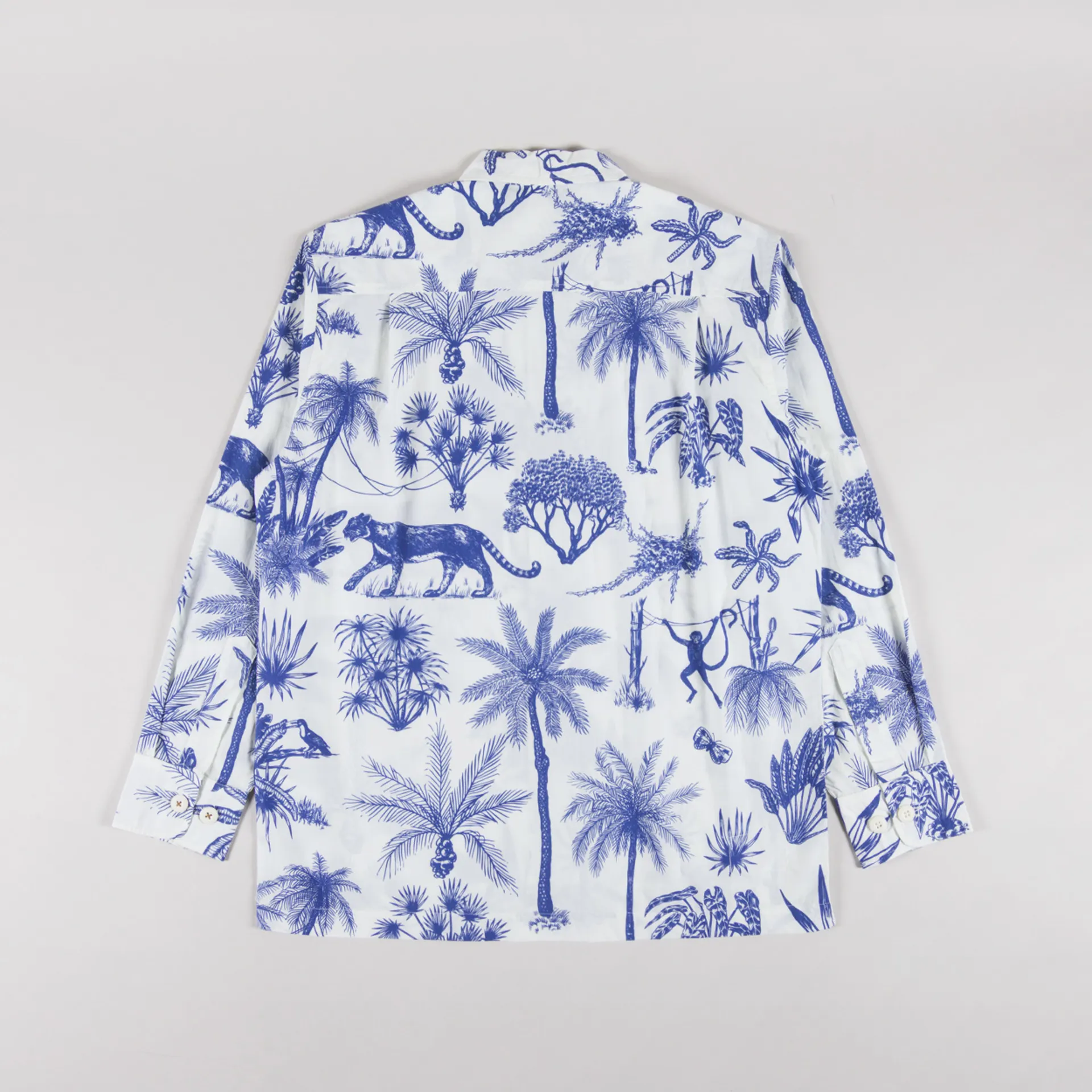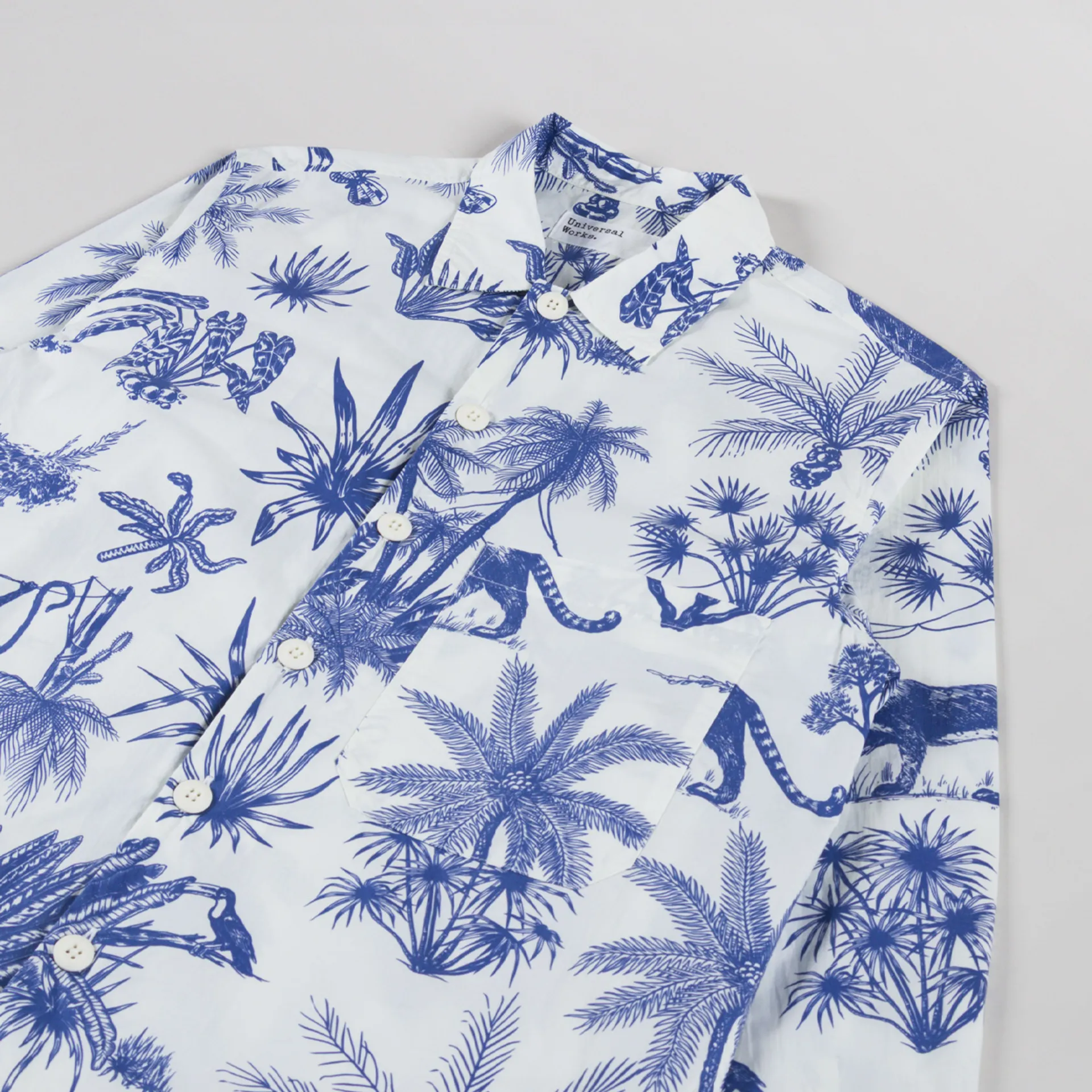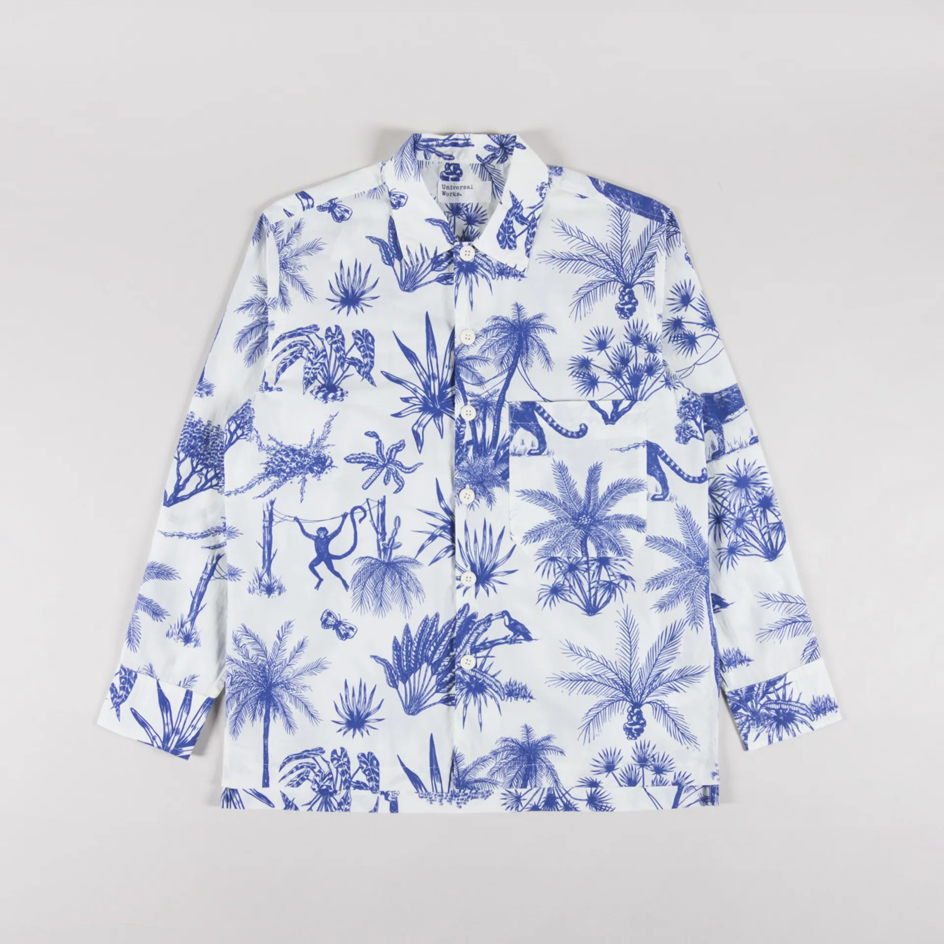 A shirt from Universal Works, cut in a loose fit for a laidback silhouette and constructed with Jungle Toile Poplin, a redrawn exclusive print which nods to traditional toile, subverted to show tropical flora and fauna. Printed on a crisp white cotton poplin. It features a button-through front, leading to a classic collar, with a straight hem, buttoned cuffs and finished with a single pocket to the chest.