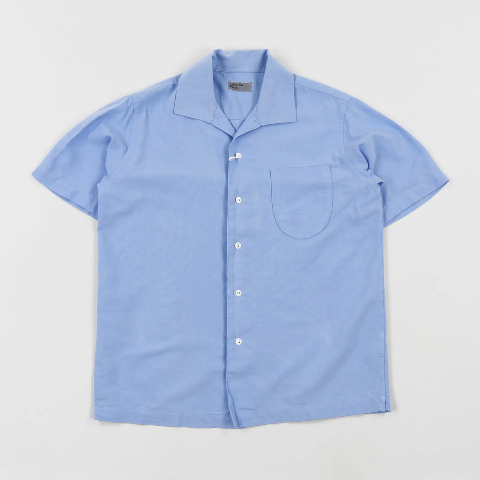 A short sleeve shirt from Universal Works made from a 100% cotton oxford fabric with an open camp collar and a button-up front, featuring a single rounded chest pocket.