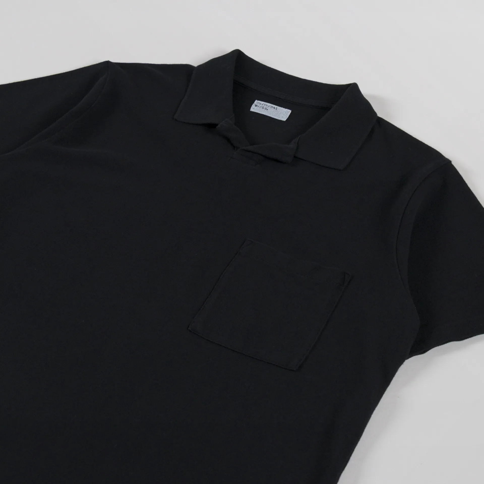 A polo shirt from Universal Works, cut in a regular fit for everyday wear and constructed from Piquet, a knitted cotton often found in sports tops due to its small honeycomb-like texture, which reduces skin contact. It features a short placket front, leading to a single-piece collar with no fastening, designed to be worn with an open neck for a casual feel. Finished with a stepped hem, small side vents, a single chest pocket and an embroidered UW patch.