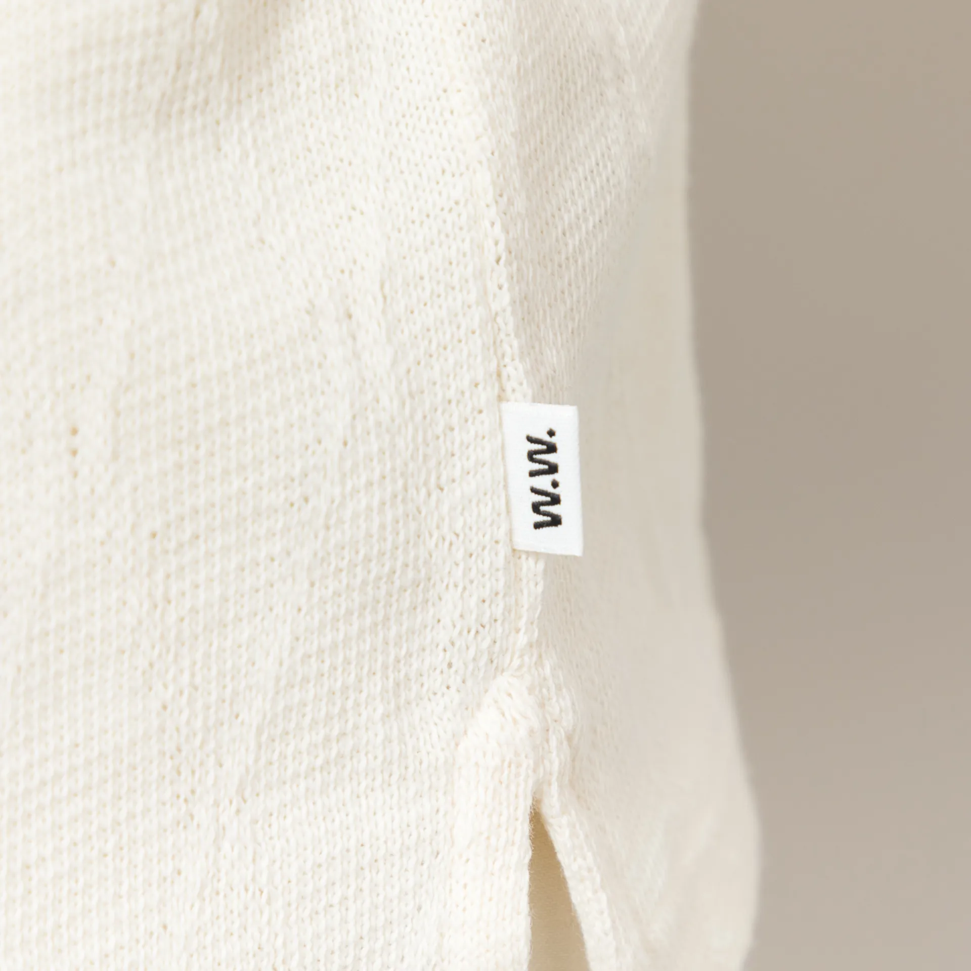 A polo shirt from Wood Wood, cut in a loose fit and crafted from textured organic cotton. Featuring a two-button placket, a classic polo collar and side splits at the hem. Finished with a simple flag label at the side seam.