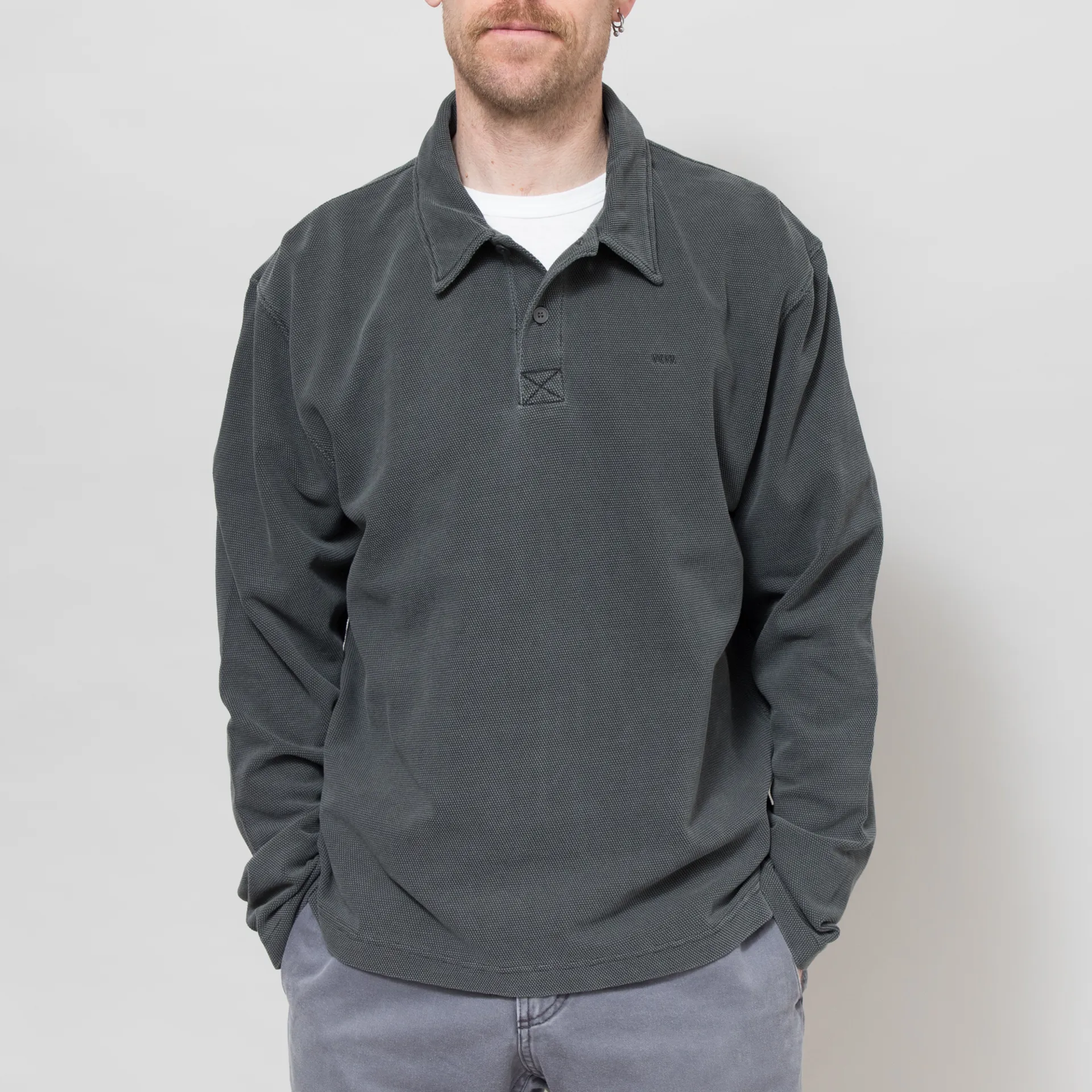A long-sleeve polo from Wood Wood, cut in a relaxed fit for a casual silhouette and constructed from smooth, matte-textured cotton. It features a two-button placket and standard collar, with a slightly dropped hem, a woven flag label at the side seam and a subtle embroidered logo at the chest.