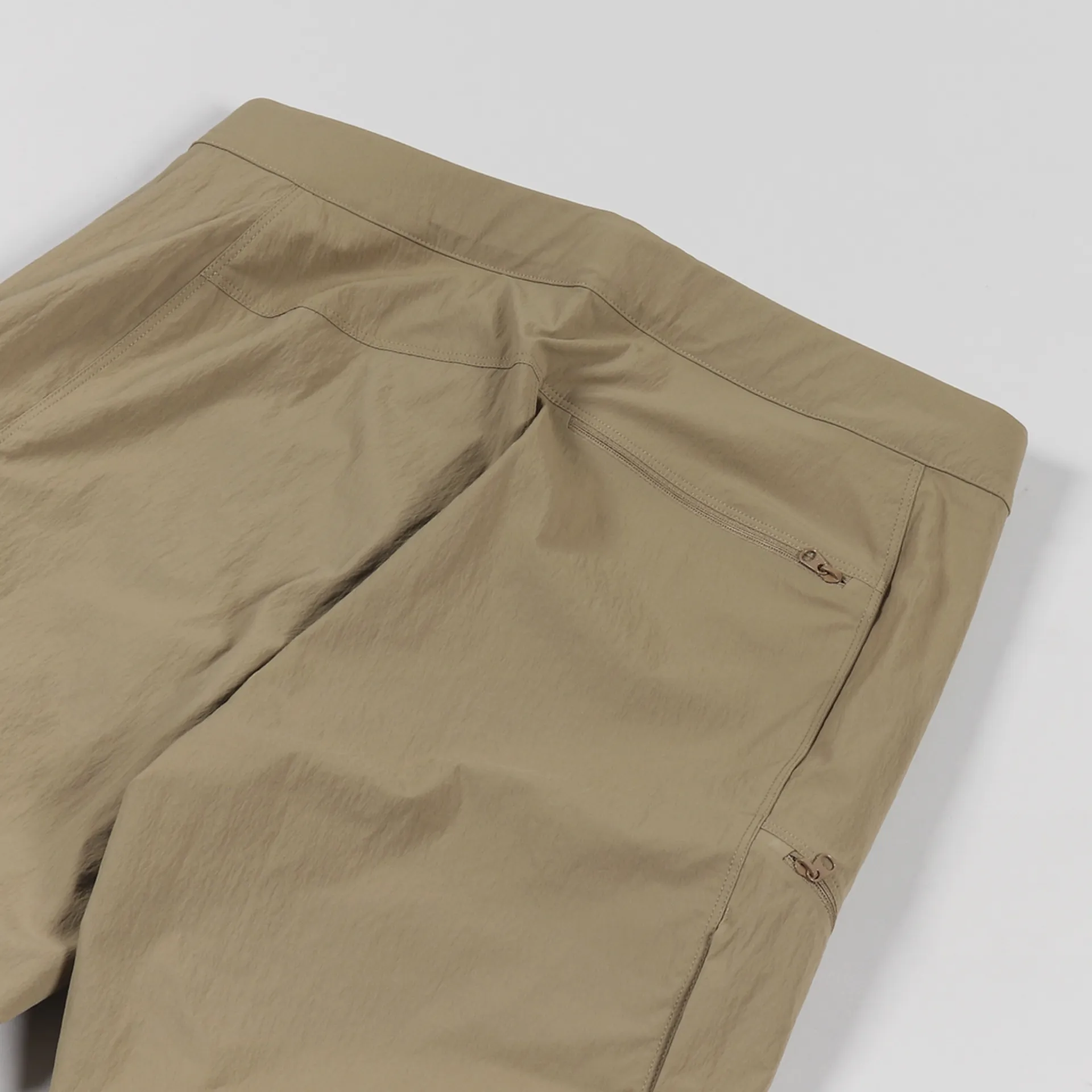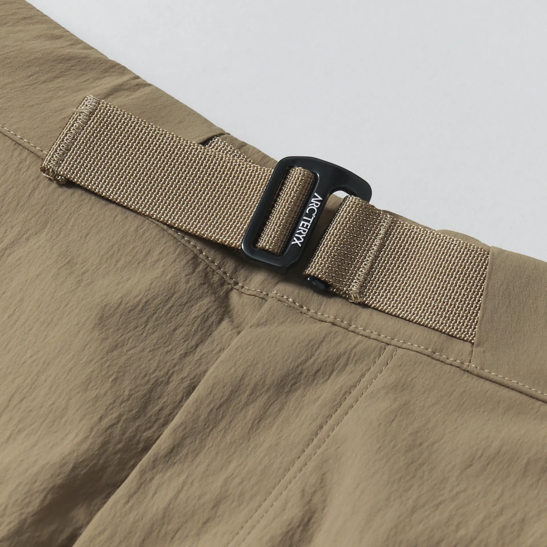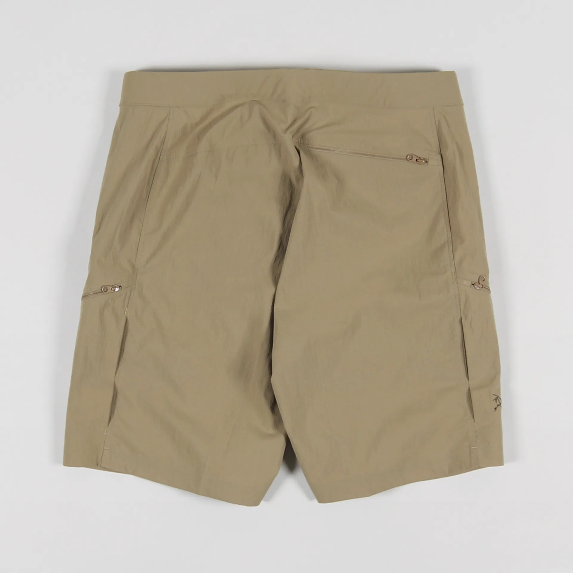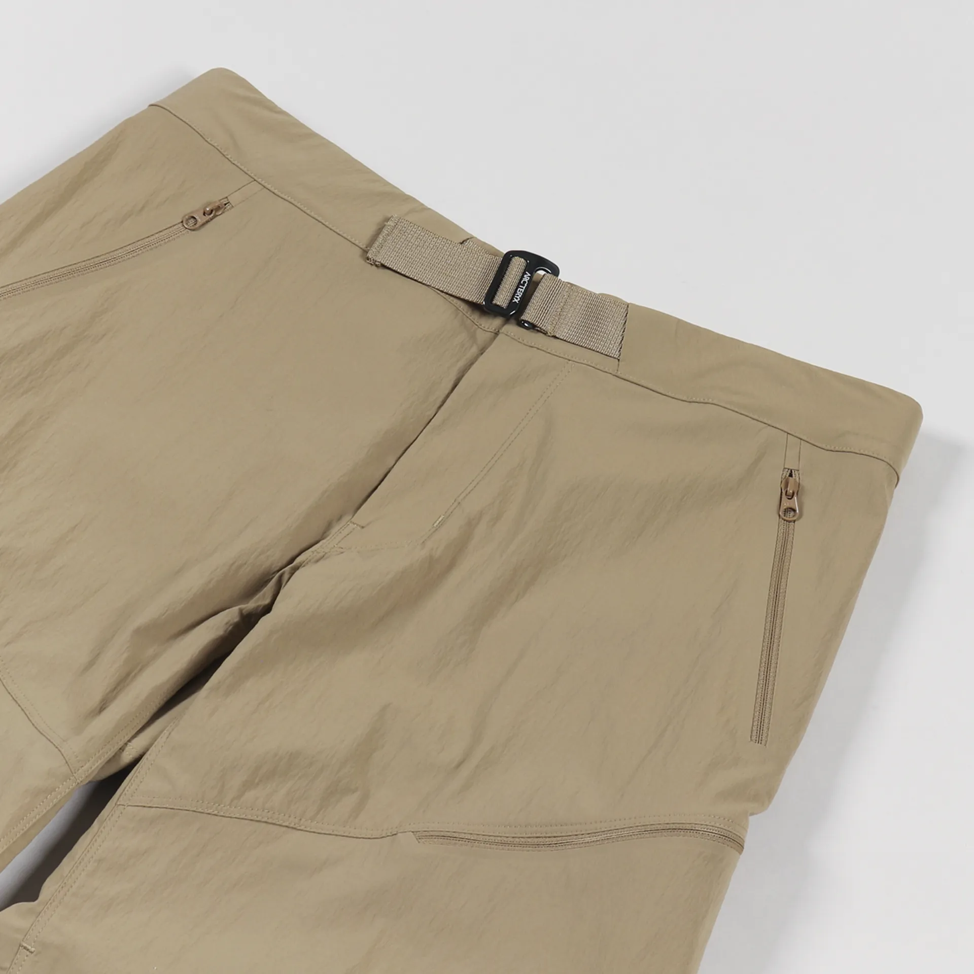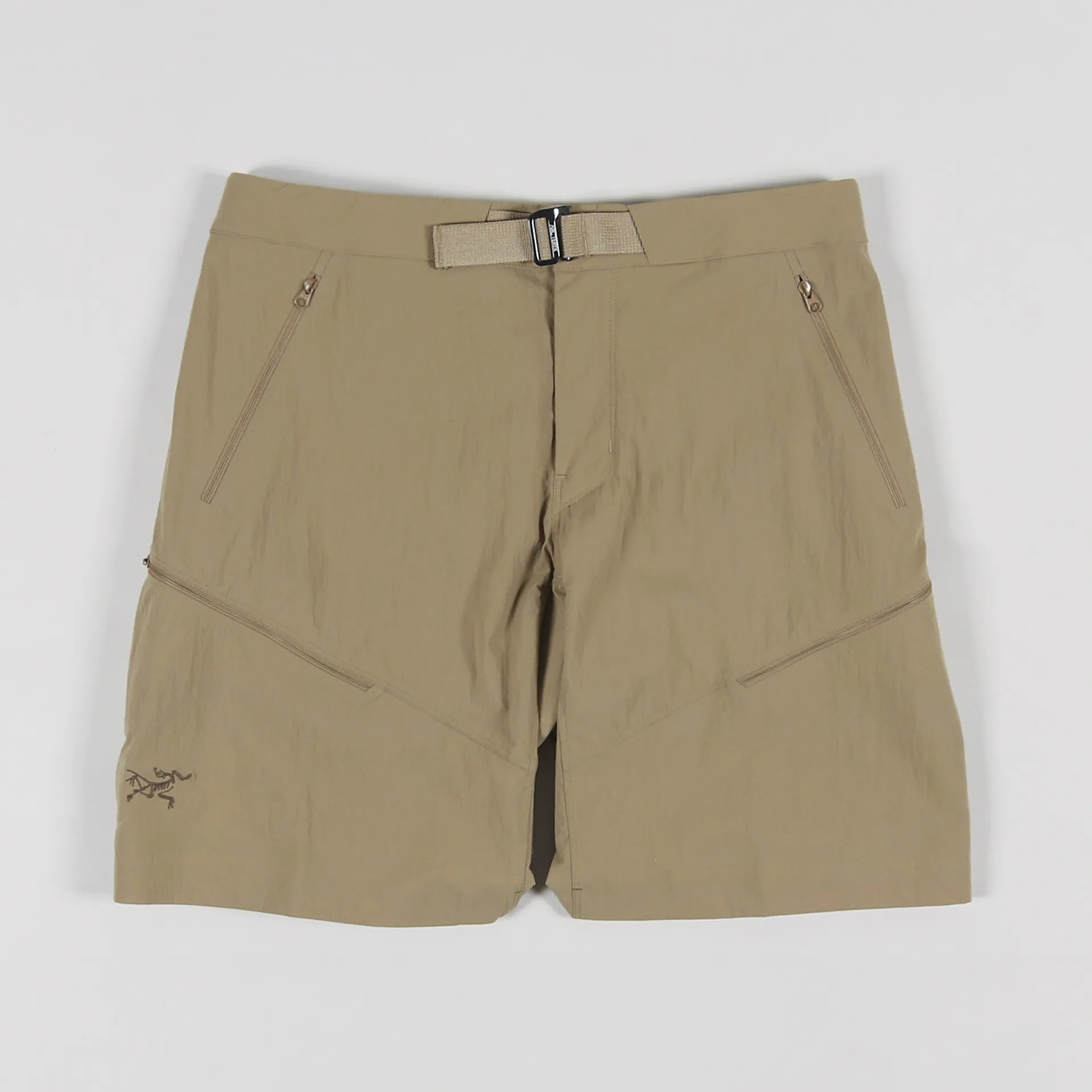 A pair of shorts from Arc'teryx made from a TerraTex stretch woven material of 94% nylon and 6% elastane with a DWR treatment, a woven climbing belt and five zippered pockets. They have an embroidered logo to the leg.