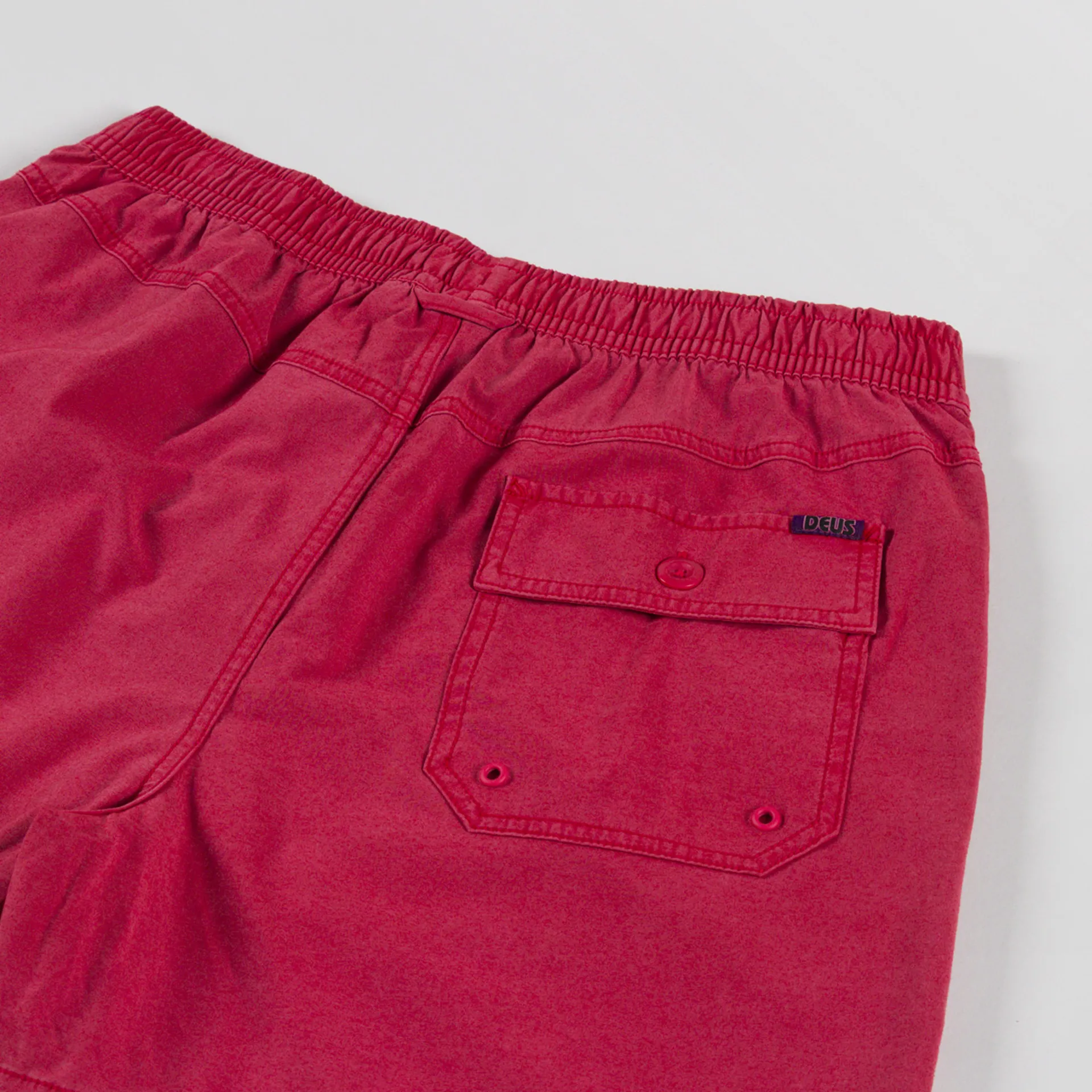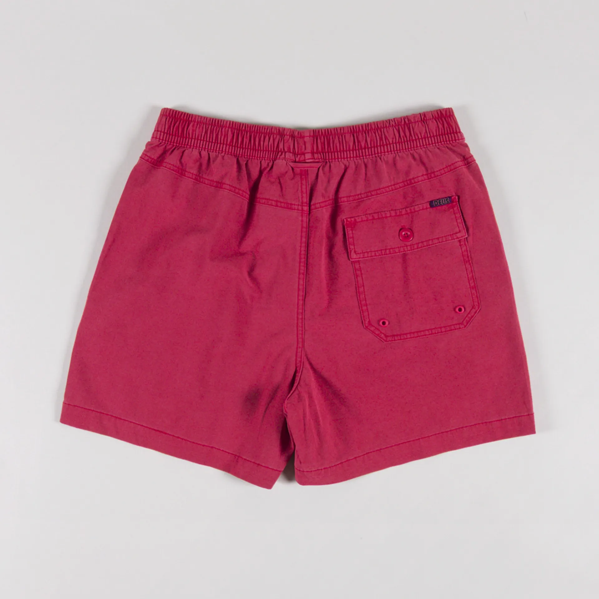 A pair of swimmers from Deus, cut in a regular fit for everyday comfort and constructed from a durable cotton, polyester and elastane blend that has been garment dyed with a heavy enzyme stone wash for a worn-in look. They feature an elasticated waistband with adjustable drawstrings, two side seam pockets, a single buttoned pocket at the back with drainage holes and are finished with the signature Deus Customs patch.