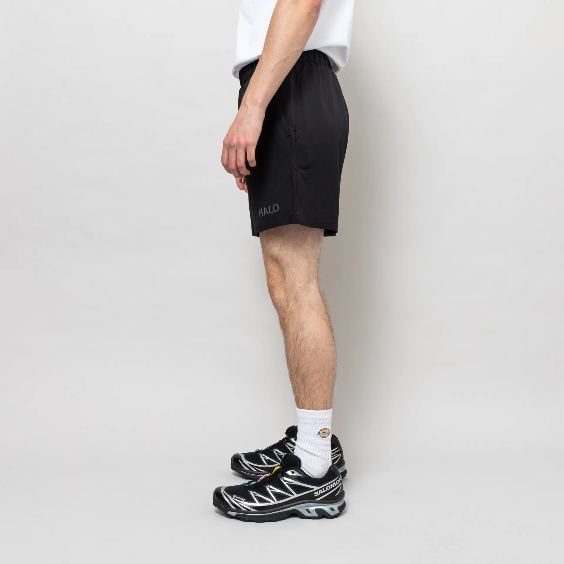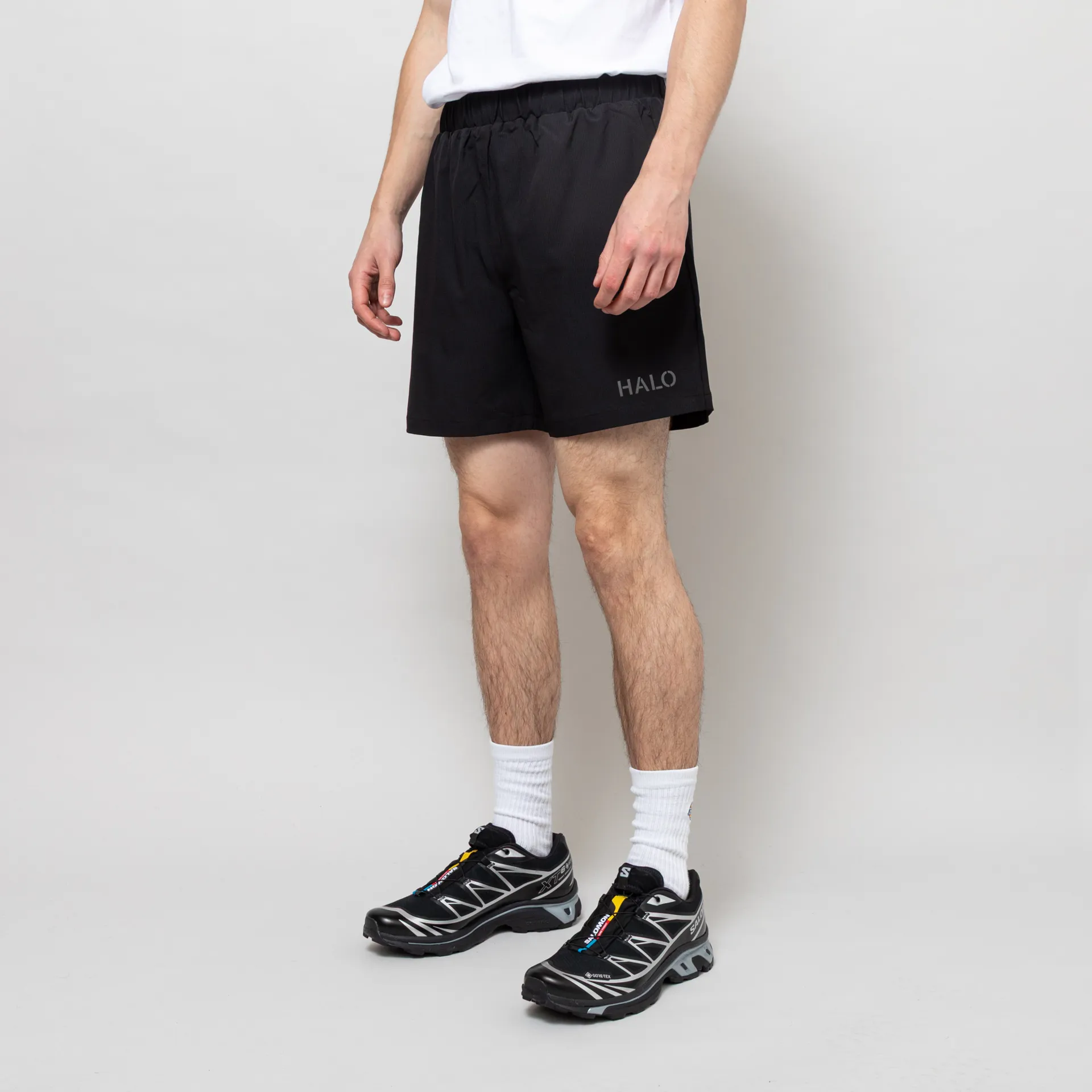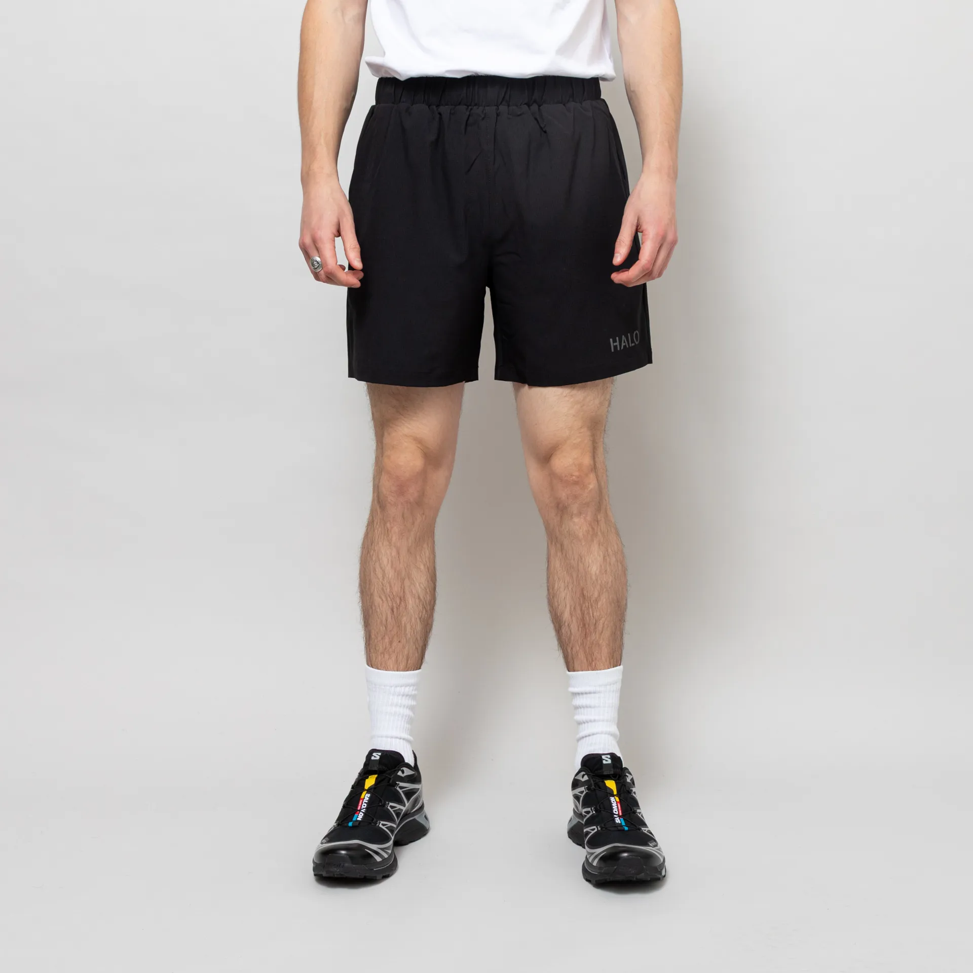 A pair of sports shorts from Halo, constructed from durable ripstop fabric with added elastane for stretch.