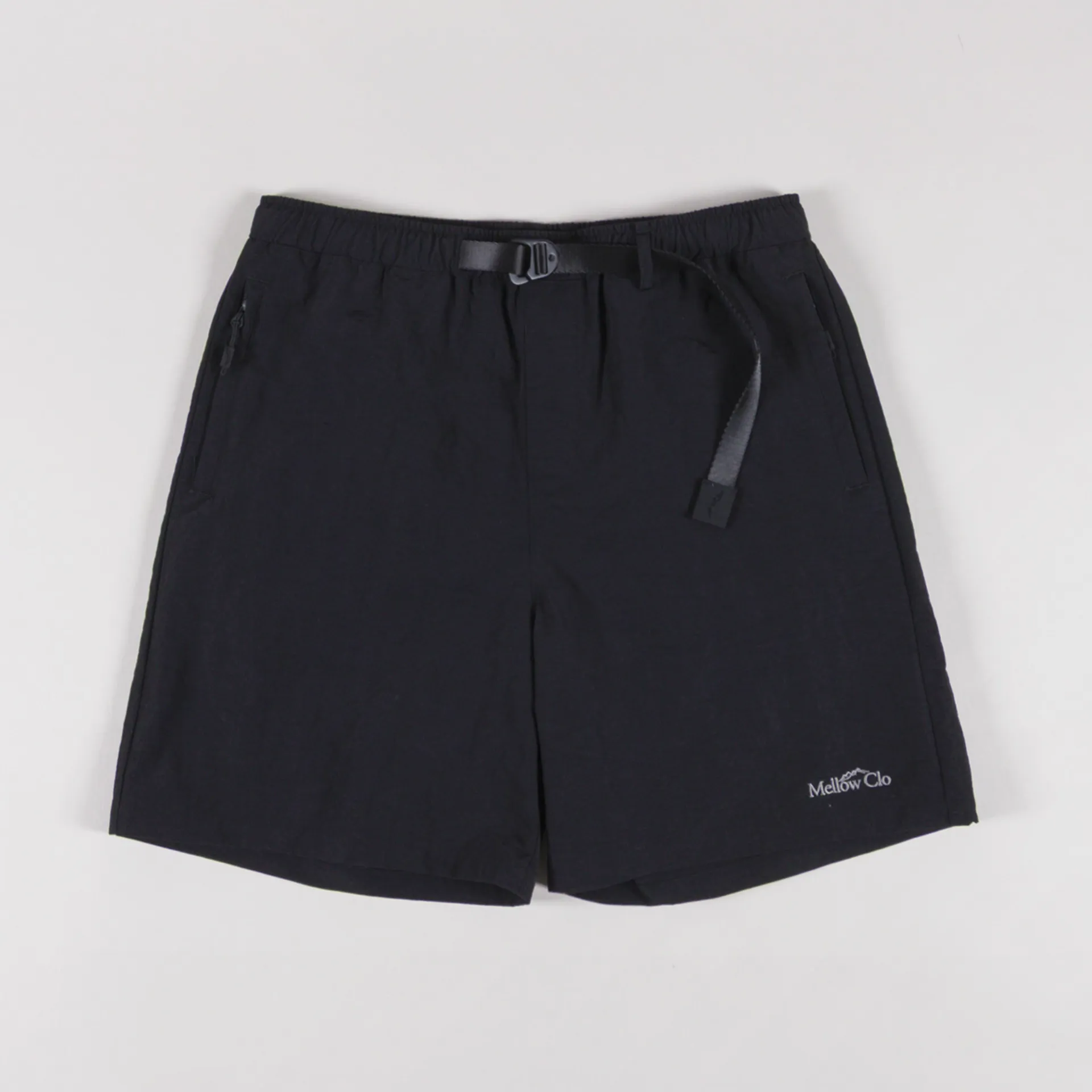 The Everyday Shorts have been cut with a regular-fitting waist and a relaxed leg for freedom of movement, constructed from water-resistant, crinkled nylon. They feature an elasticated waistband with an integrated belt to adjust the fit, with a rubber-branded patch at the end of the webbing. This style is unlined and has a single back patch pocket, two front zip pockets, and is complete with an embroidered Mellow Clo logo to the bottom front.
