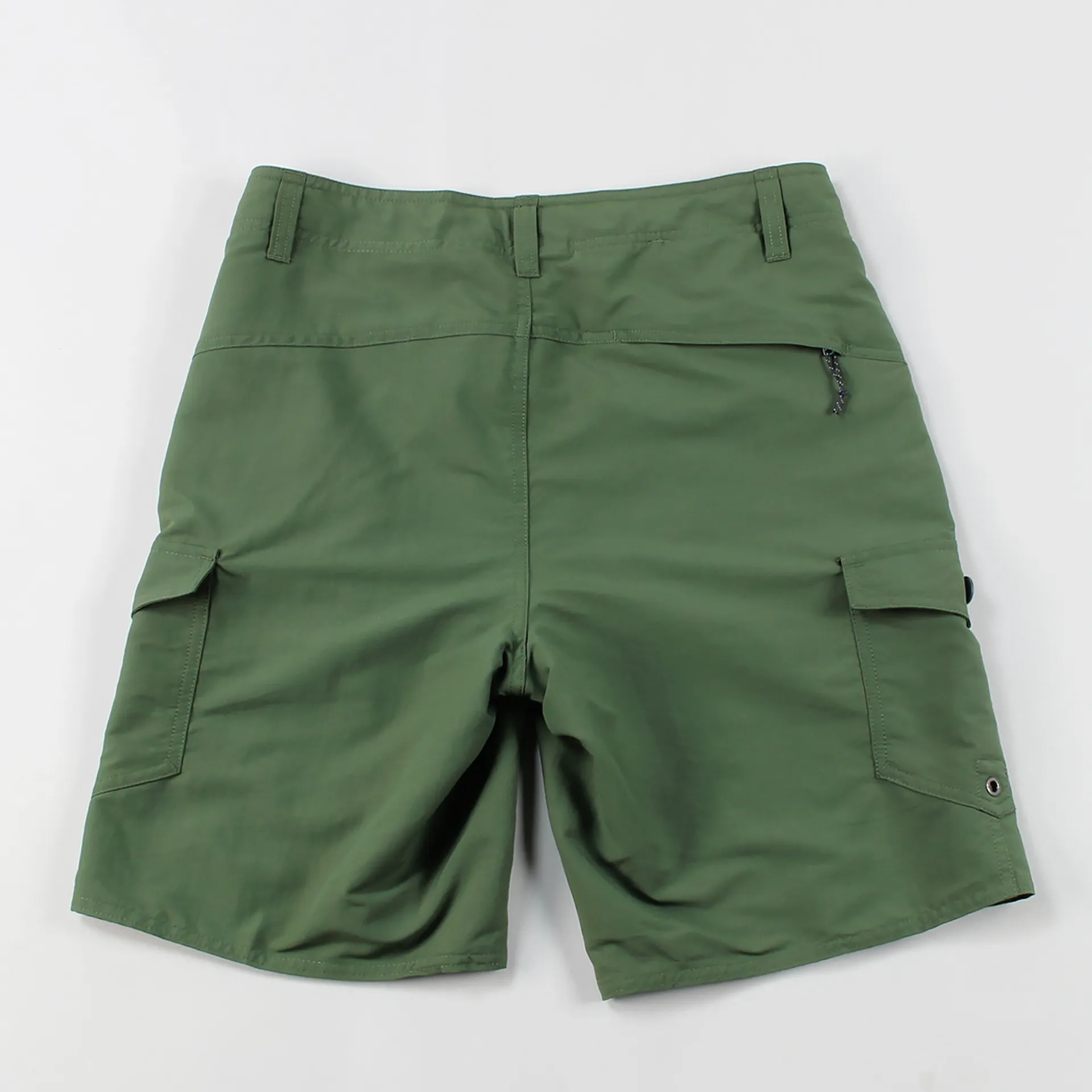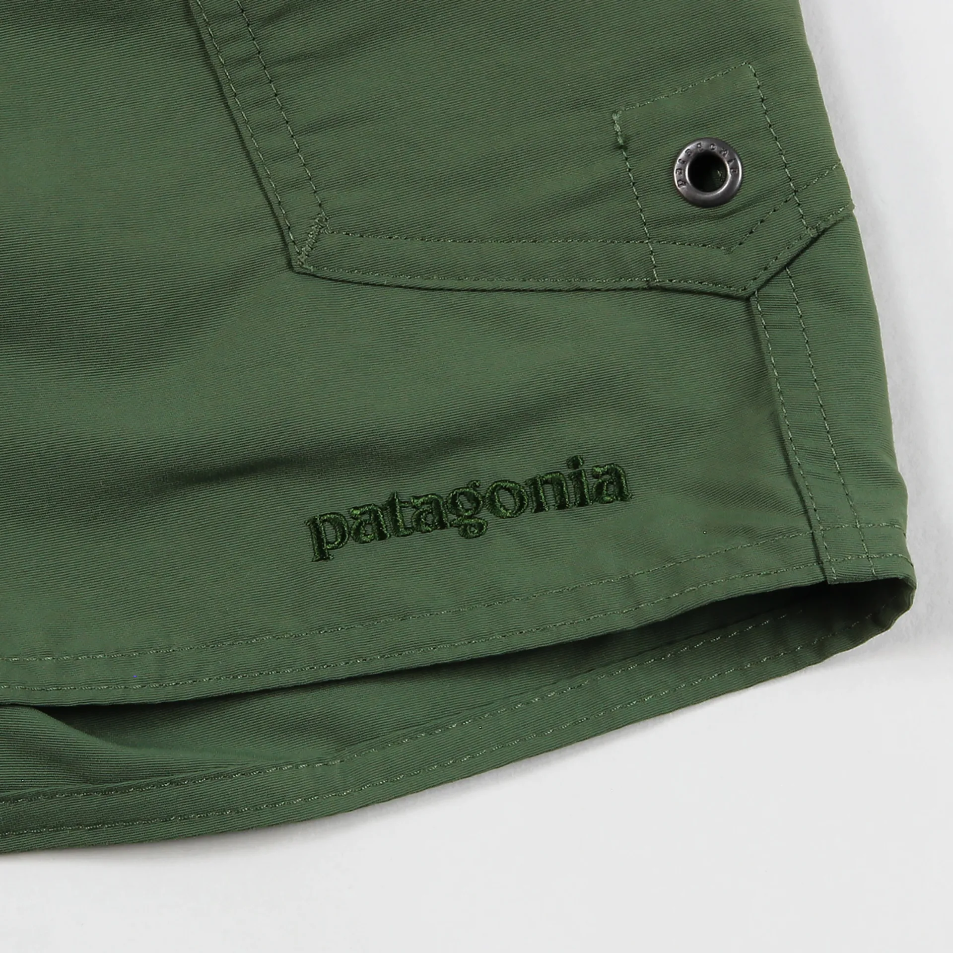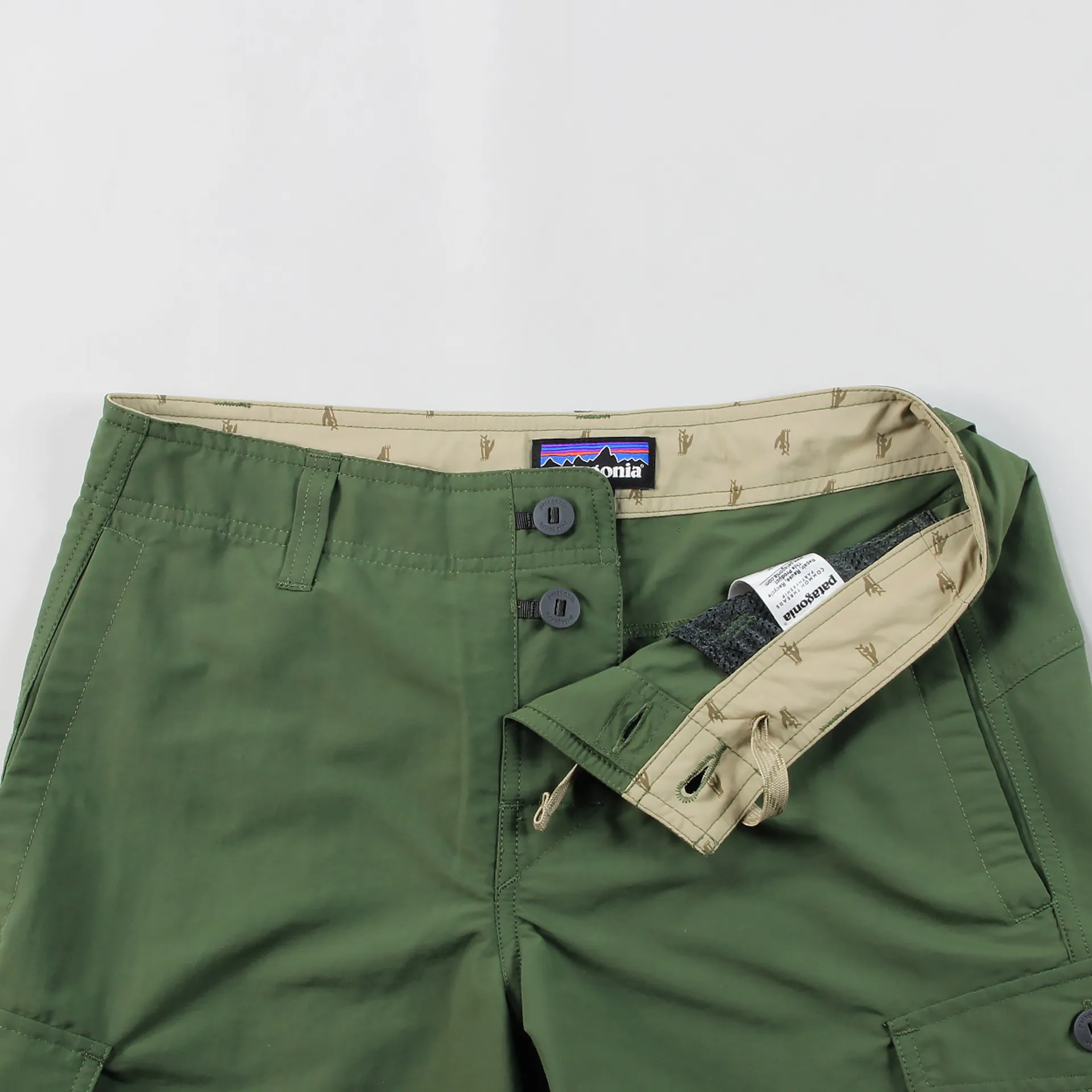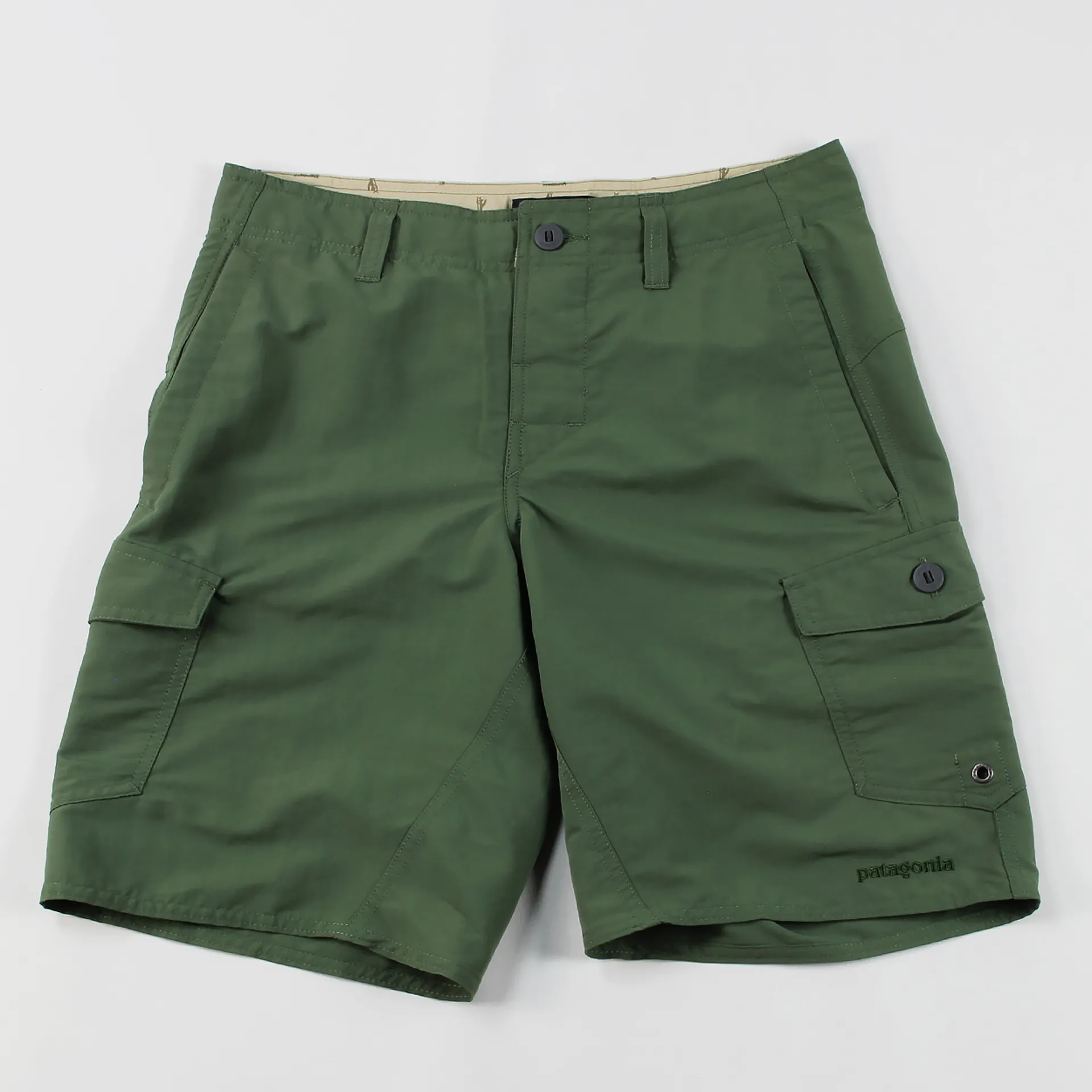 It has a flat lying rubber button fly and a bartracked drawstring for a secure fit. On the side it has button up cargo pockets with key loop holes along with self draining mesh pockets. To top them off they have a stictched Patagonia logo to the left leg. Get those legs out.
