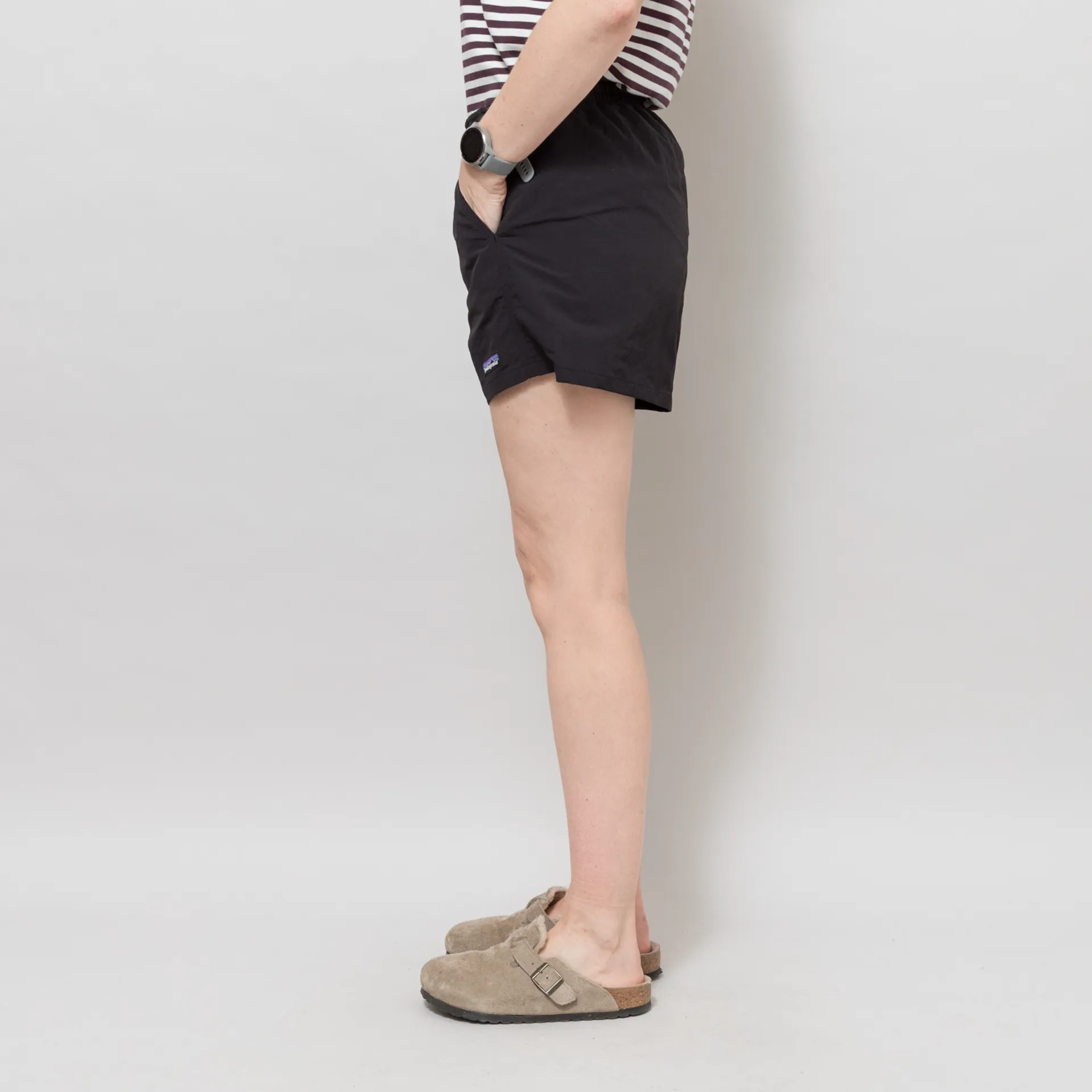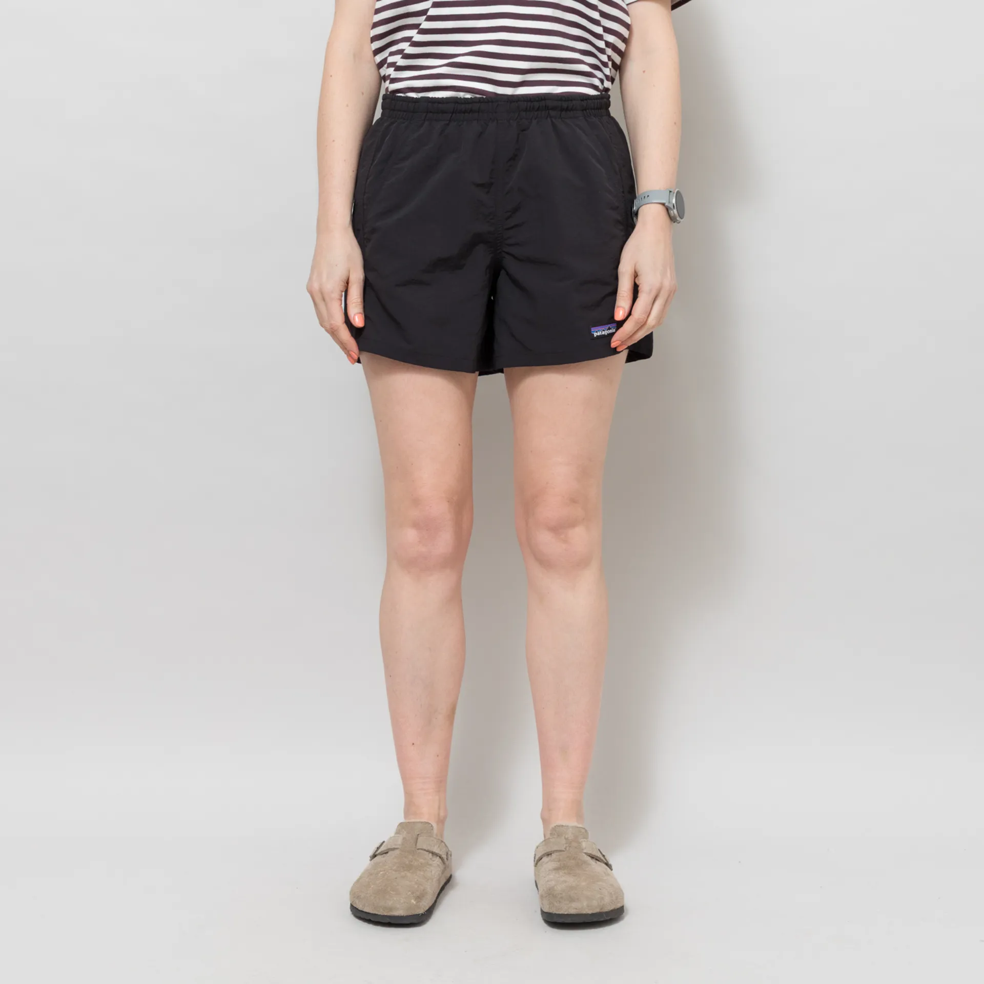 A pair of Baggies from Patagonia's Womenswear collection, made from a quick-drying 100% recycled nylon ottoman weave with a DWR treatment. They have an elasticated and drawstring waist, side pockets, and a woven logo patch to the leg.