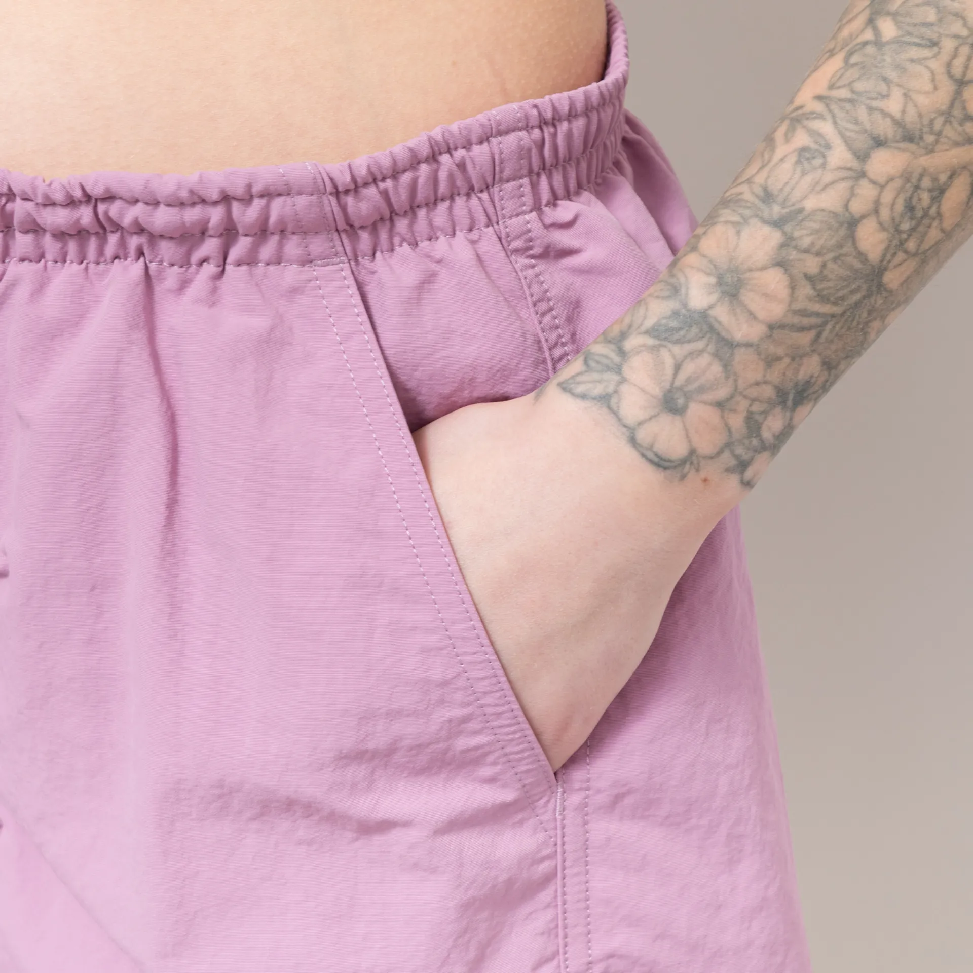 A pair of Baggies from Patagonia's Womenswear collection, made from a quick-drying 100% recycled nylon ottoman weave with a DWR treatment. They have an elasticated and drawstring waist, side pockets, and a woven logo patch to the leg.