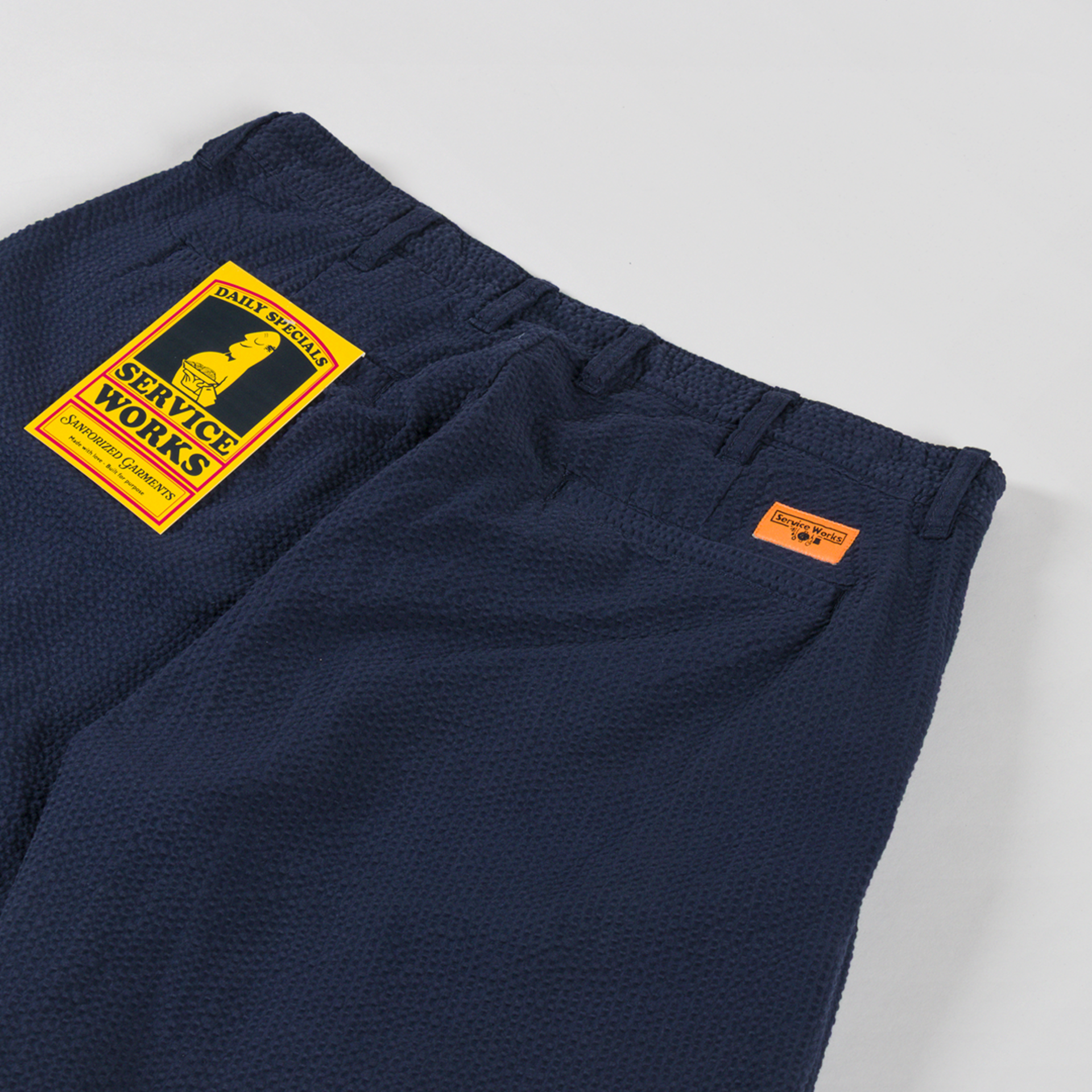 The Seersucker Part Timer Shorts from Service Works are cut in a relaxed, tailored fit and are constructed from GOTS-certified organic cotton seersucker fabric. They feature a zip-and-button fly, a classic belt-loop waist, double-pleat details, and a four-pocket design. Finished off with the signature Service Works logo patch to the back.